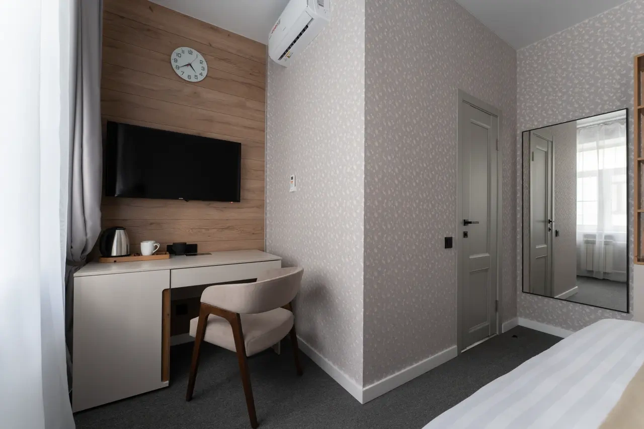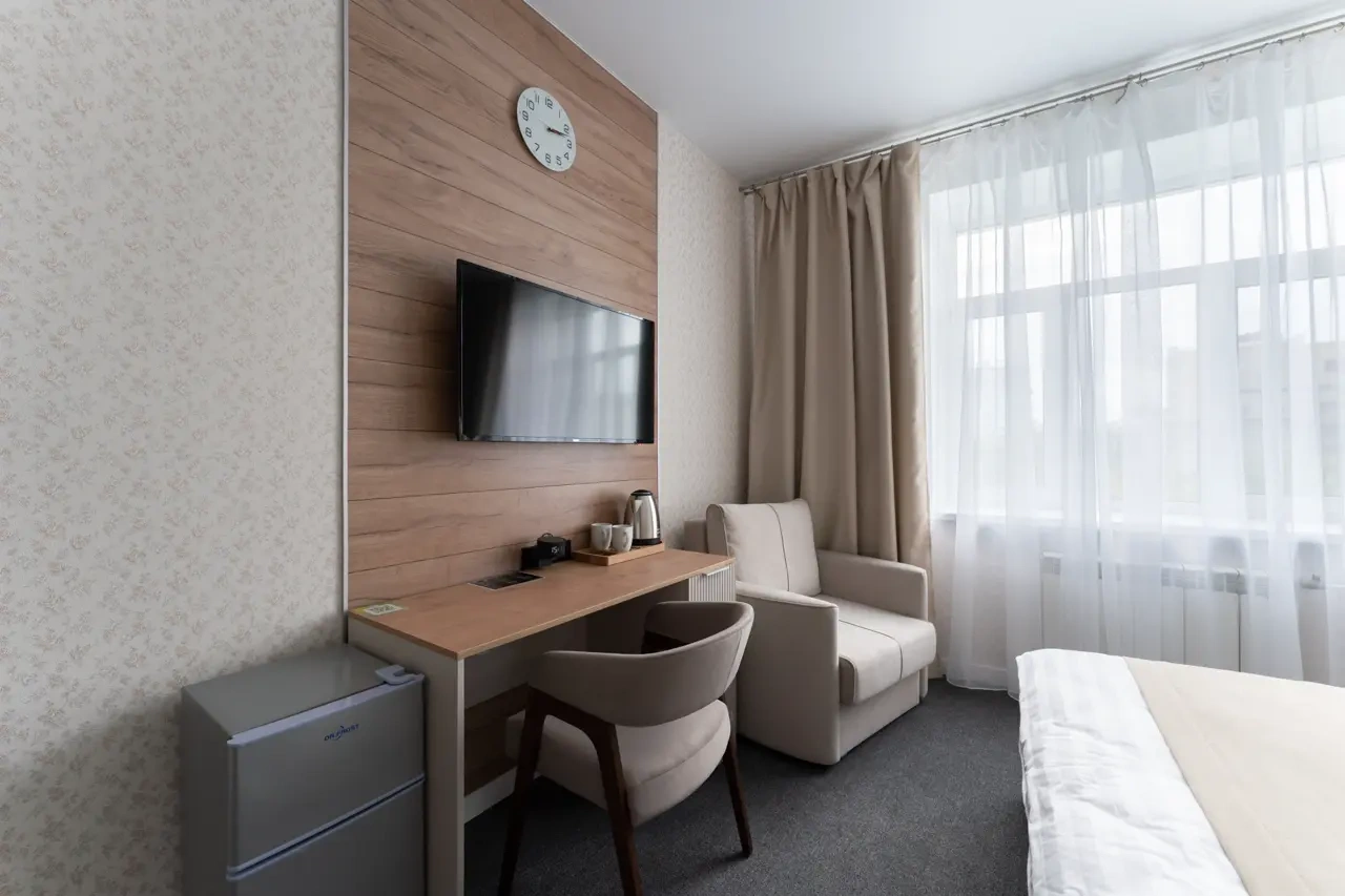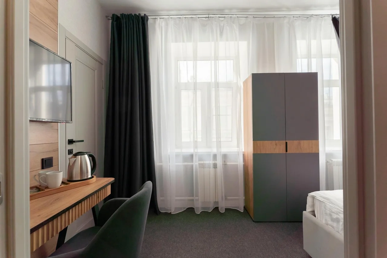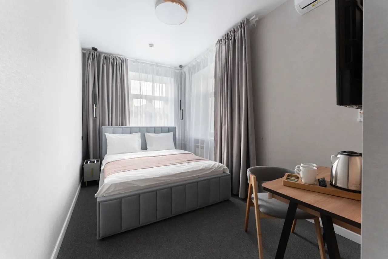 Одноместный номер с окнами на улицу Макаренко. Односпальная кровать 90/200, оснащенная Яндекс станцией Алиса, TV управляемое Алисой, wi-fi, сплит система, холодильник, гардеробный шкаф, письменный стол, душевая комната, приборы гигиенической косметики. Белье премиального качества.