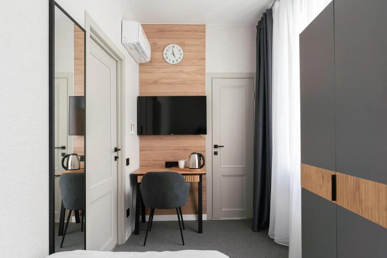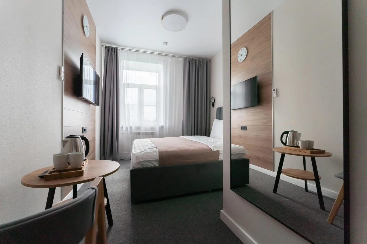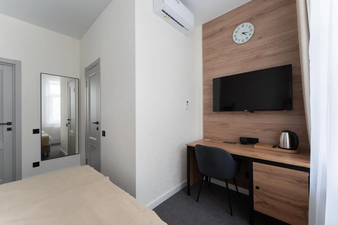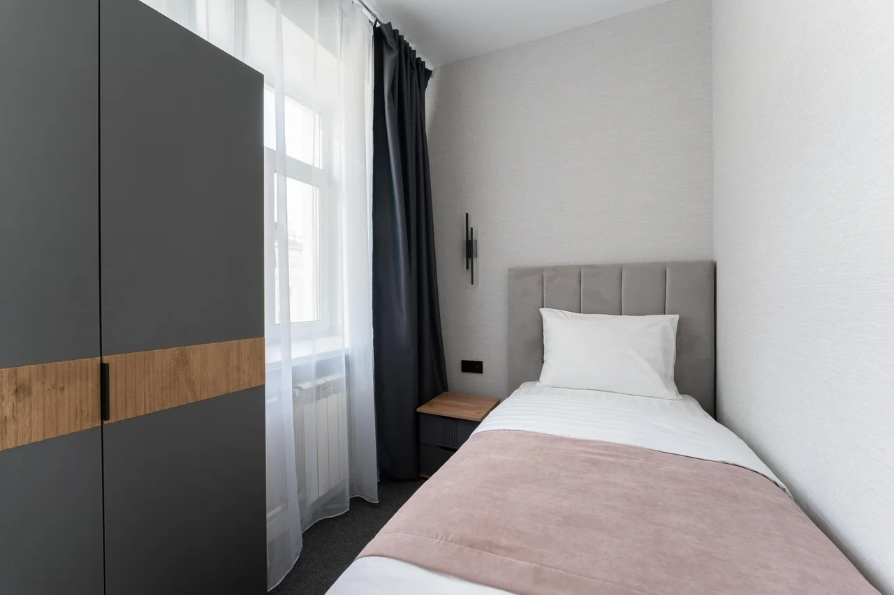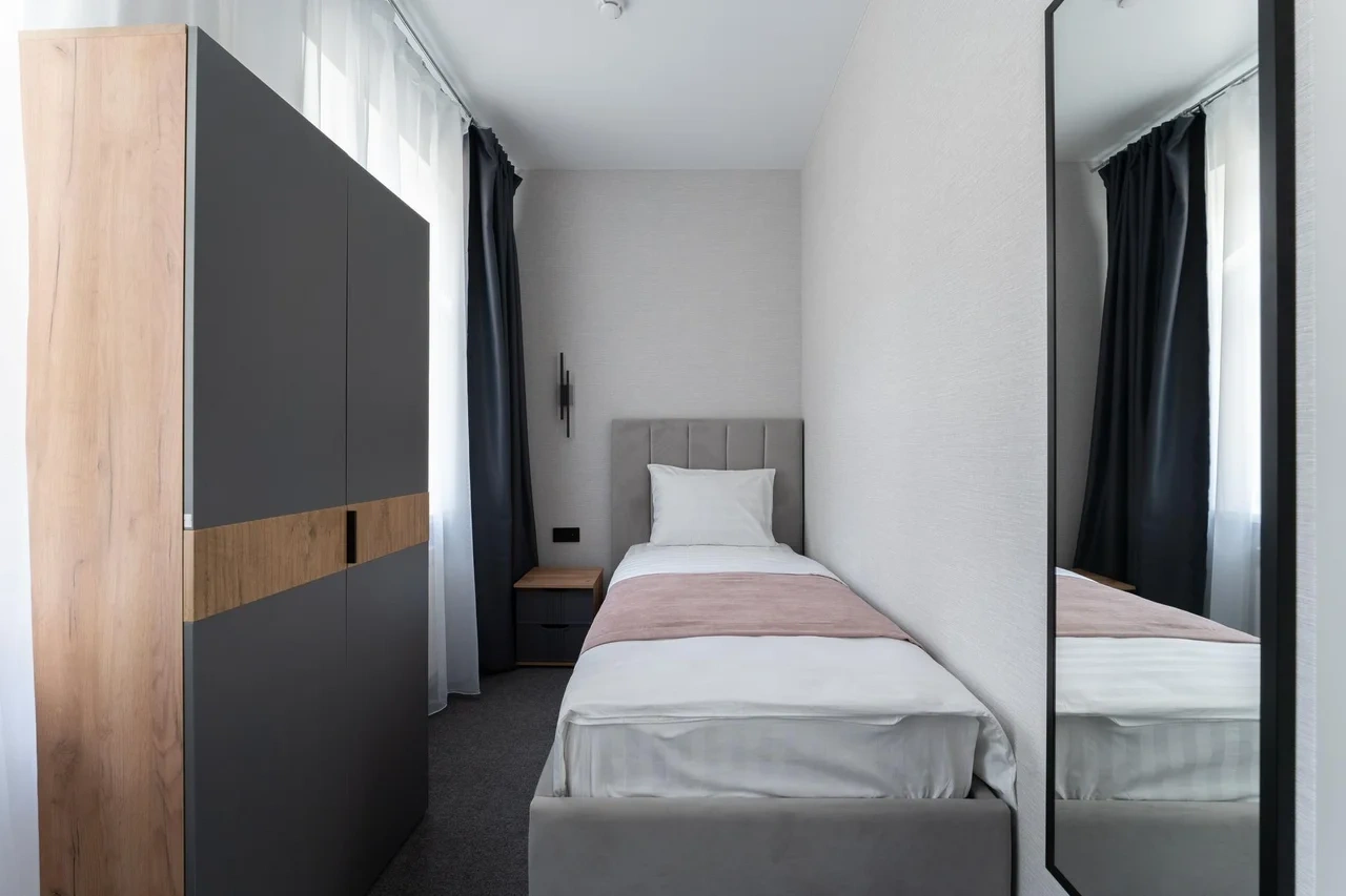 Одноместный номер с окнами на улицу Макаренко. Односпальная кровать 90/200, оснащенная Яндекс станцией Алиса, TV управляемое Алисой, wi-fi, сплит система, холодильник, гардеробный шкаф, письменный стол, душевая комната, приборы гигиенической косметики. Белье премиального качества.
