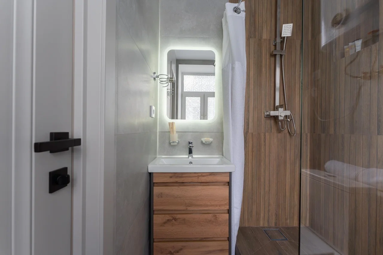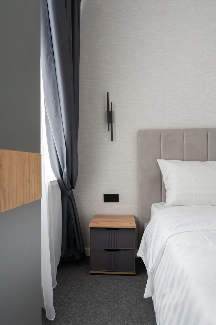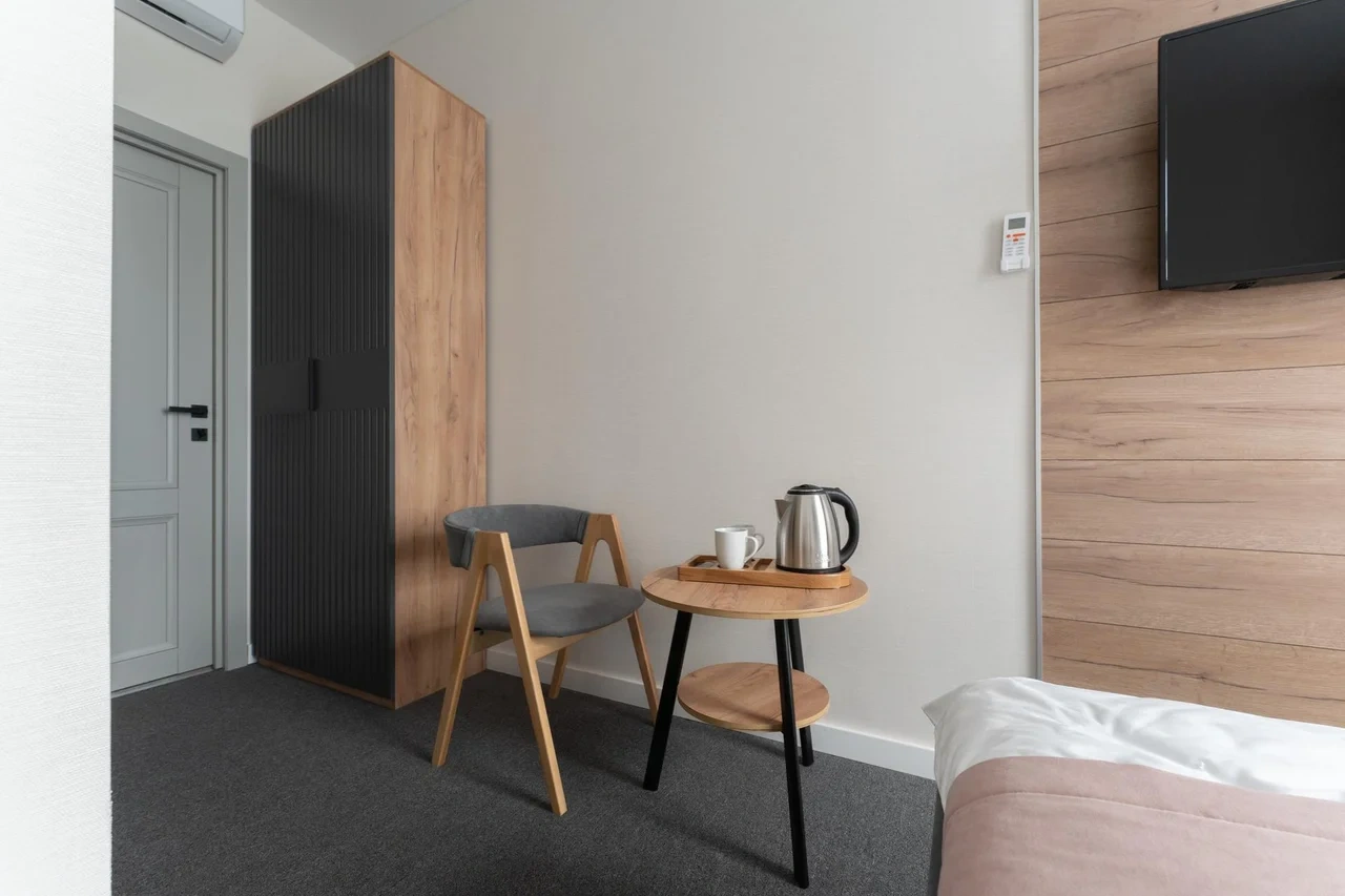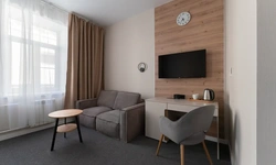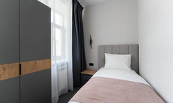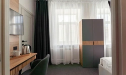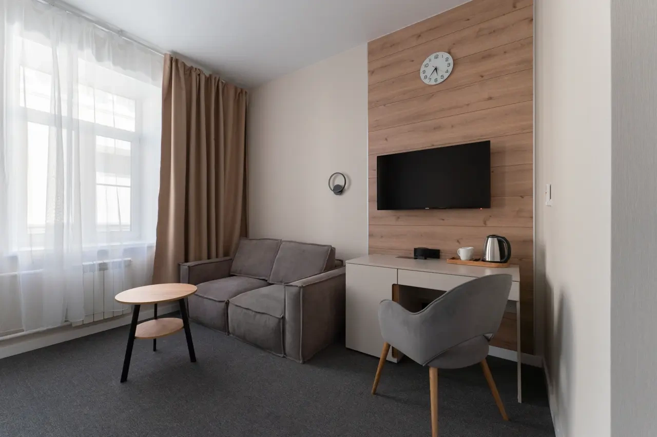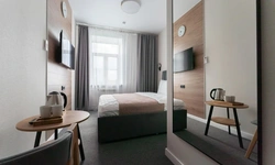 Одноместный номер с окнами на улицу Макаренко. Односпальная кровать 90/200, оснащенная Яндекс станцией Алиса, TV управляемое Алисой, wi-fi, сплит система, холодильник, гардеробный шкаф, письменный стол, душевая комната, приборы гигиенической косметики. Белье премиального качества.