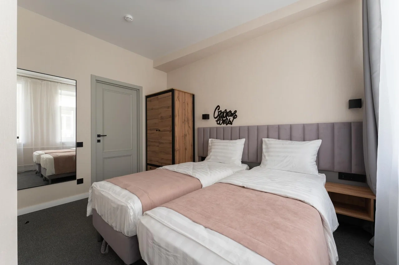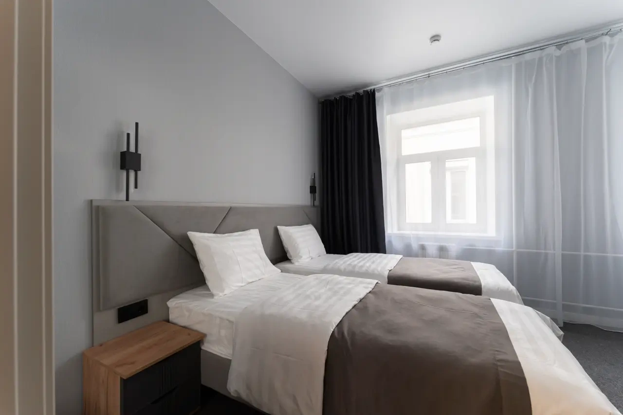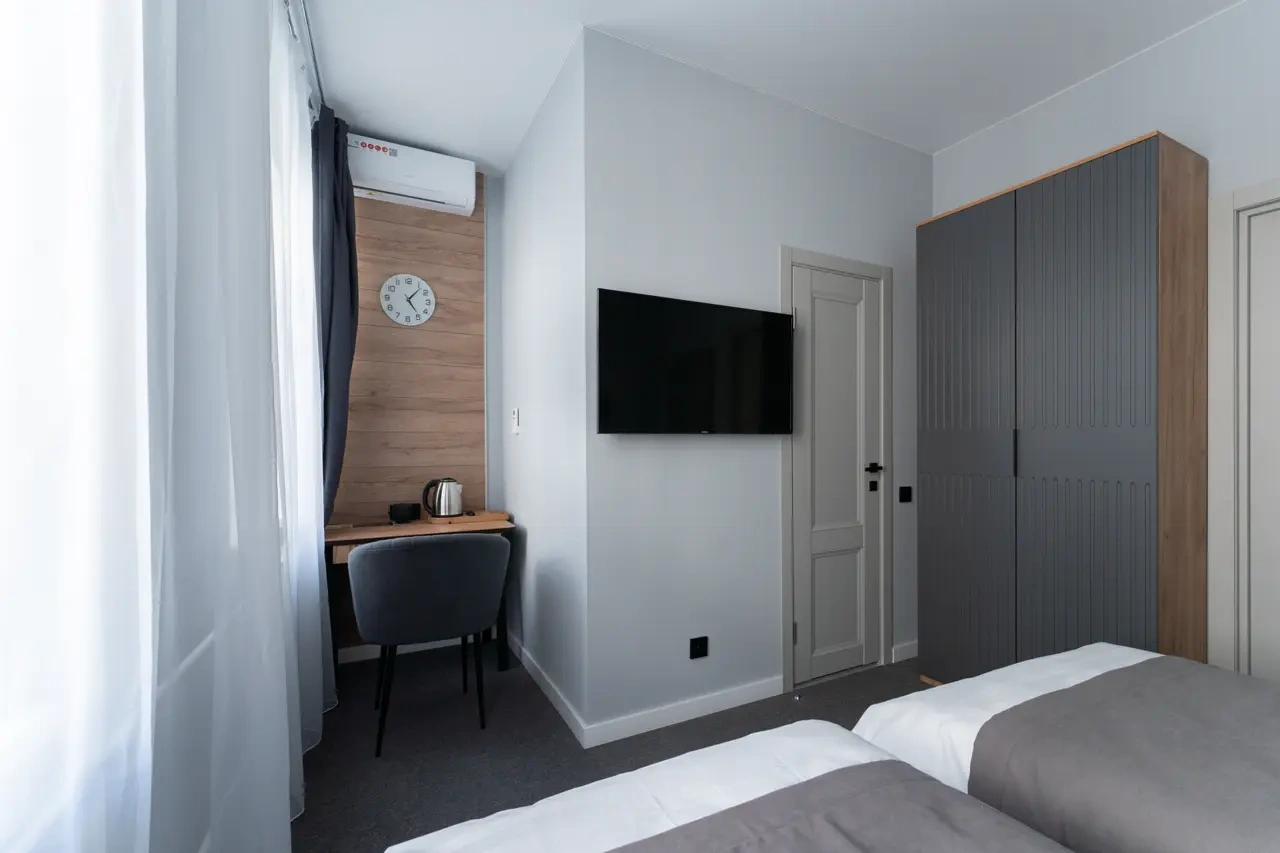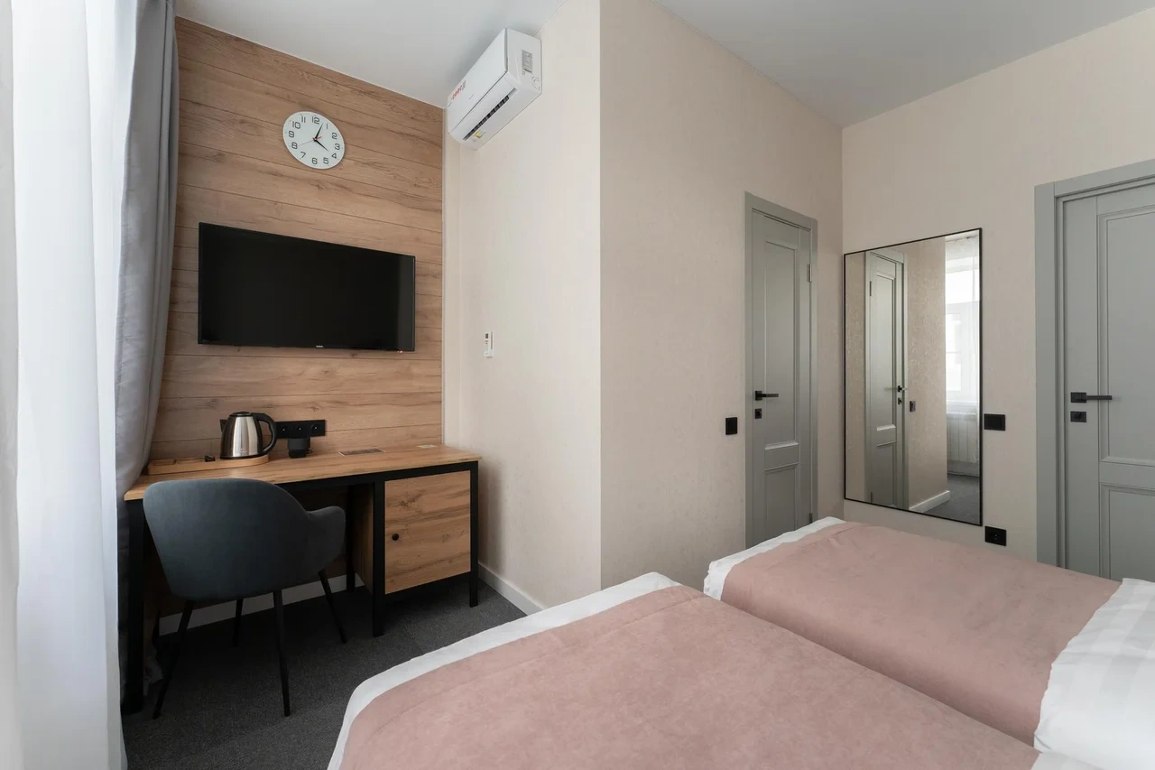 Двухместный номер с одной или двумя раздельными кроватями на выбор гостя. Оснащен Яндекс станцией Алиса, TV управляемое Алисой, wi-fi, сплит система, холодильник, гардеробный шкаф, письменный стол, душевая комната, приборы гигиенической косметики. Белье премиального качества