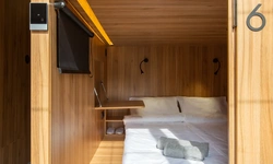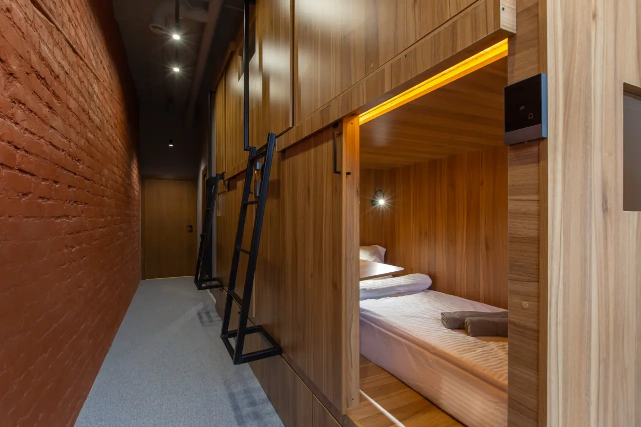 Комфортабельные и просторные капсулы из натурального дерева оттенка. Капсулы оснащены комодом для багажа с контейнером для обуви, откидным столиком, индивидуальной системой вентиляции, светильником для чтения книг, основным светильником, розеткой. Доступ в капсулы и в комод по индивидуальным кодам – 100% безопасность и сохранность ваших вещей. Ванная и туалет в каждом номере, косметические средства от Natura Siberica. Авторский завтрак входит в стоимость капсулы и гарантирует Вам доброе утро :)