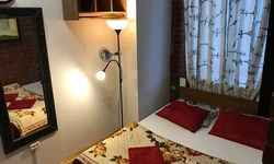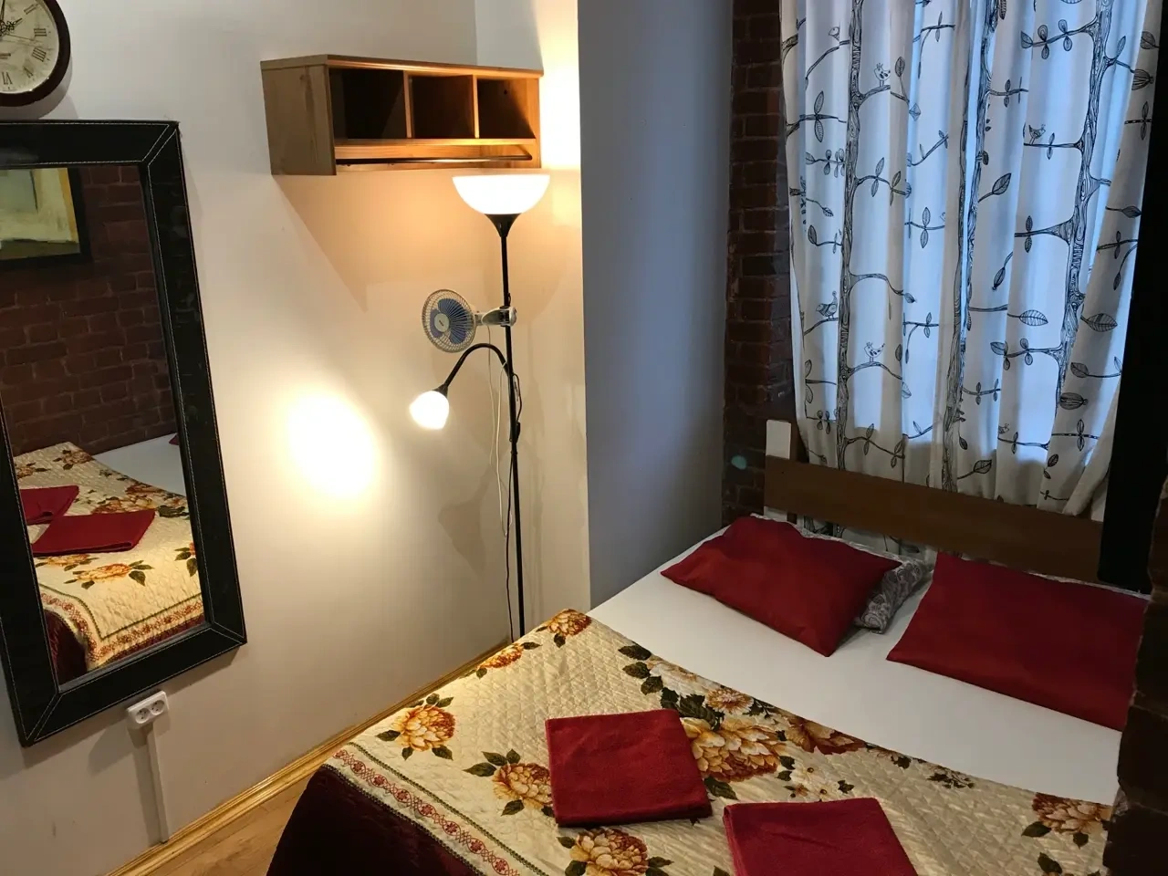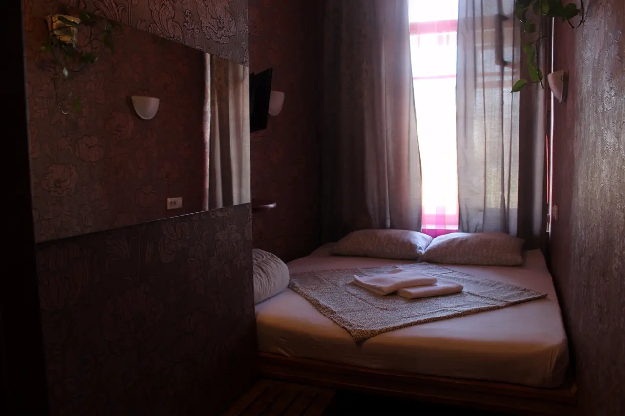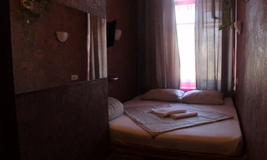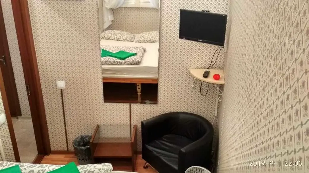 Небольшой уютный,двухместный номер с двуспальной кроватью,с окном во французском стиле. С общей ванной комнатой. Максимальное количество гостей 2.Площадь 5 кв. метров квадратных. Есть телевизор,столик, кресло, большое зеркало. Воздухоочистительная система. Постельое белье, полотенца.