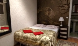 Уютный, комфорный номер с двухспальной кроватью. Телевизор, кожаный диван, кресло,обеденная зона, большое зеркало. Прикроватная тумбочка с настольной лампой.