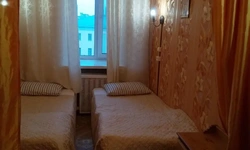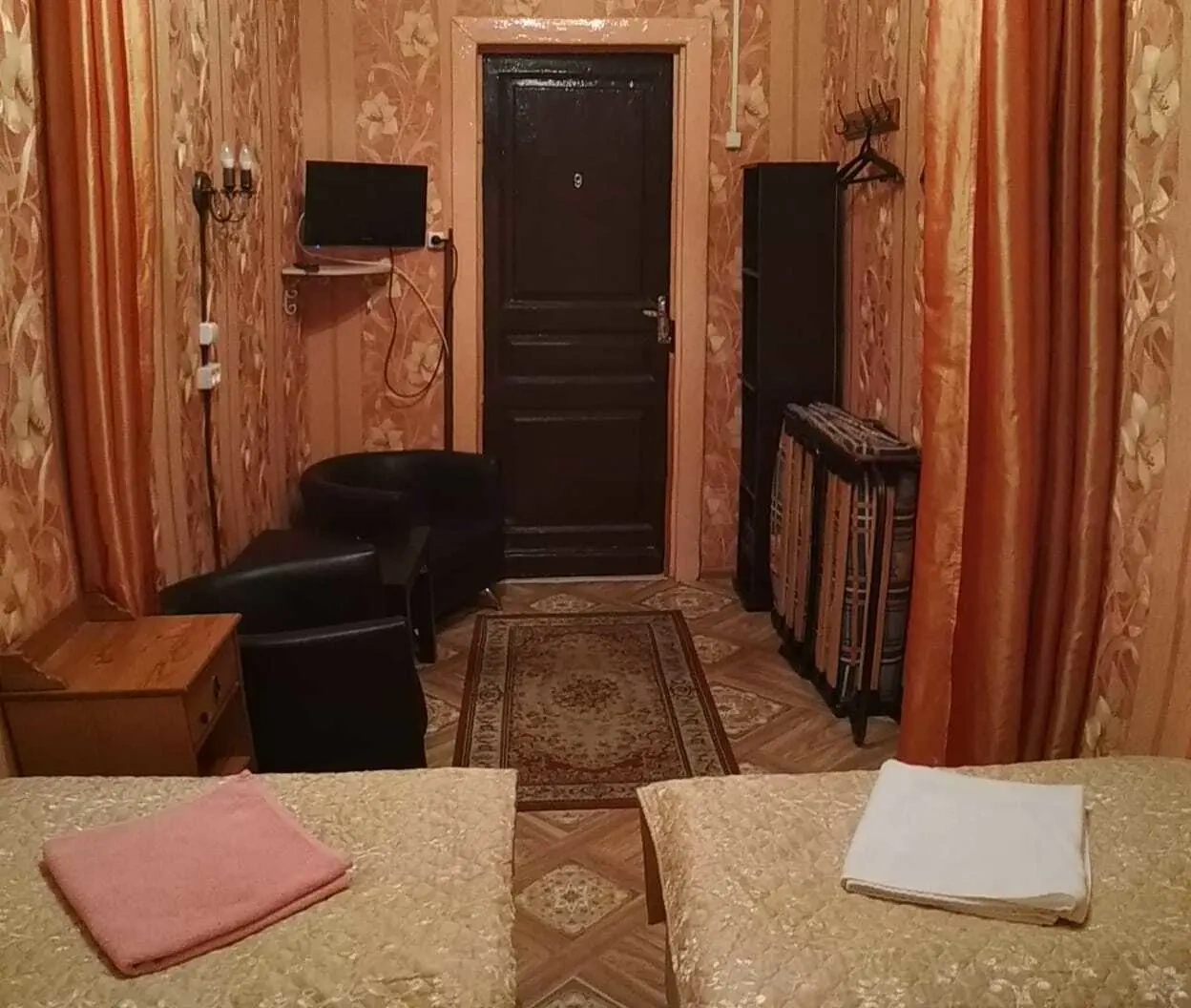 Уютный семейный номер с двумя раздельными кроватями и еще одно доплнительное место( раскладушка). Телевизор, два кресла , зеркало, обеденное место.