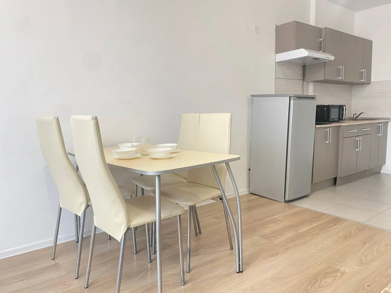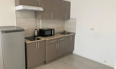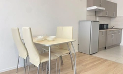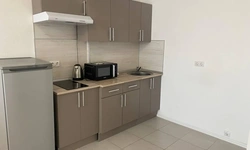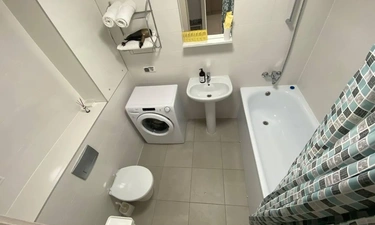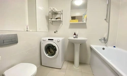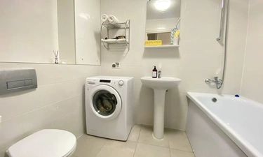 Есть вся необходимая кухонная гарнитура и столовые принадлежности на 4 гостей. В ванной комнате: для каждого гостя полотенце, тапочки, зубной набор, шампунь, гель для душа. Стиральная машина и фен.