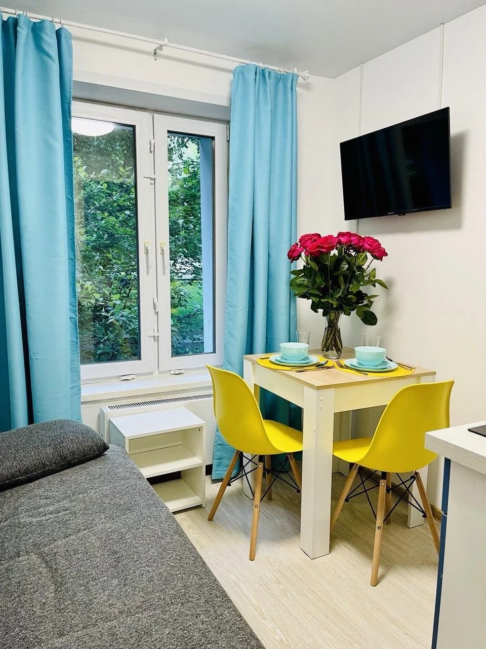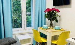 Светлая квартира-студия на Юге Москвы, где комфортно разместятся 4 гостя. Во дворе дома есть детская и спортивная площадки.
