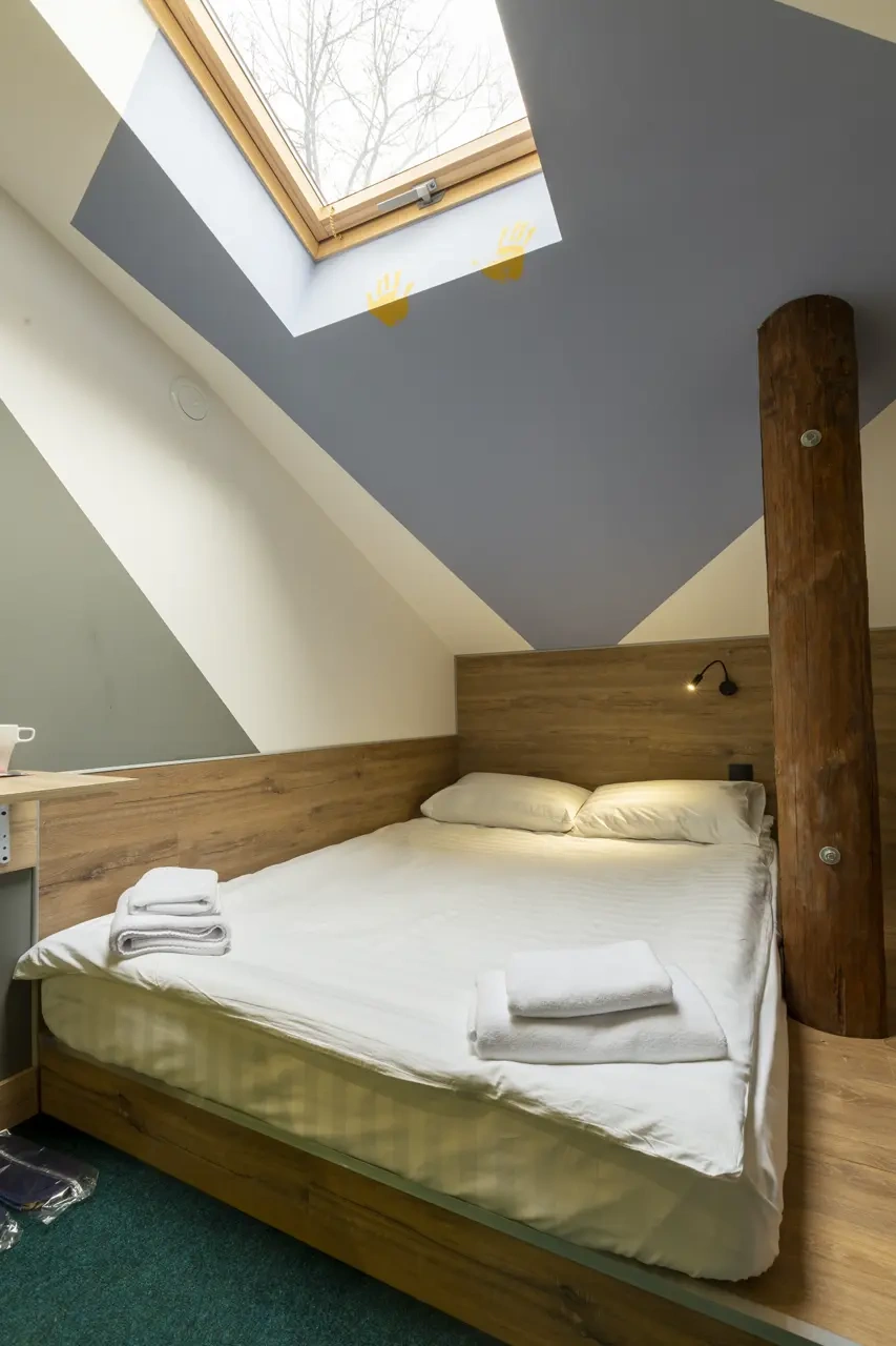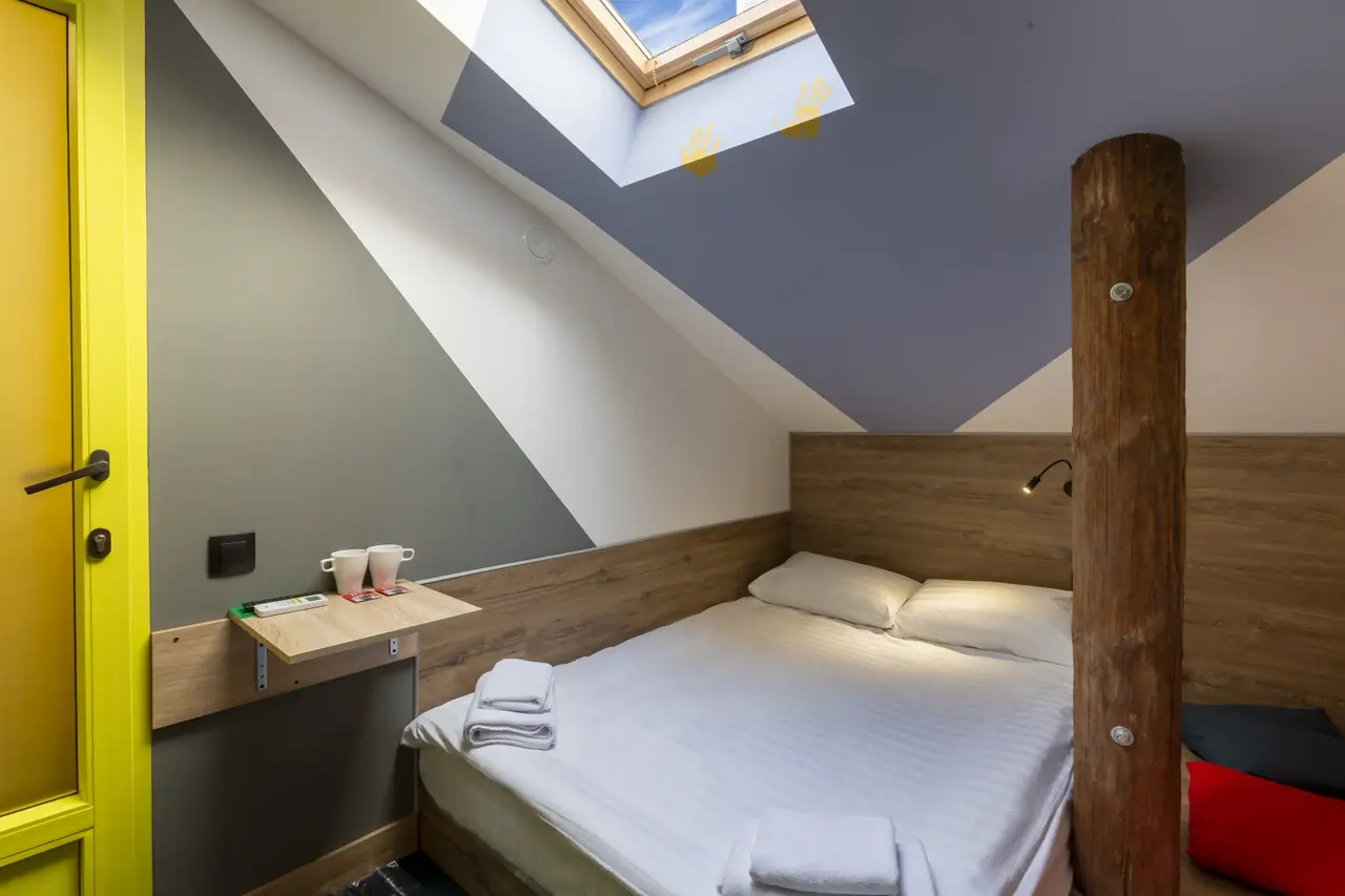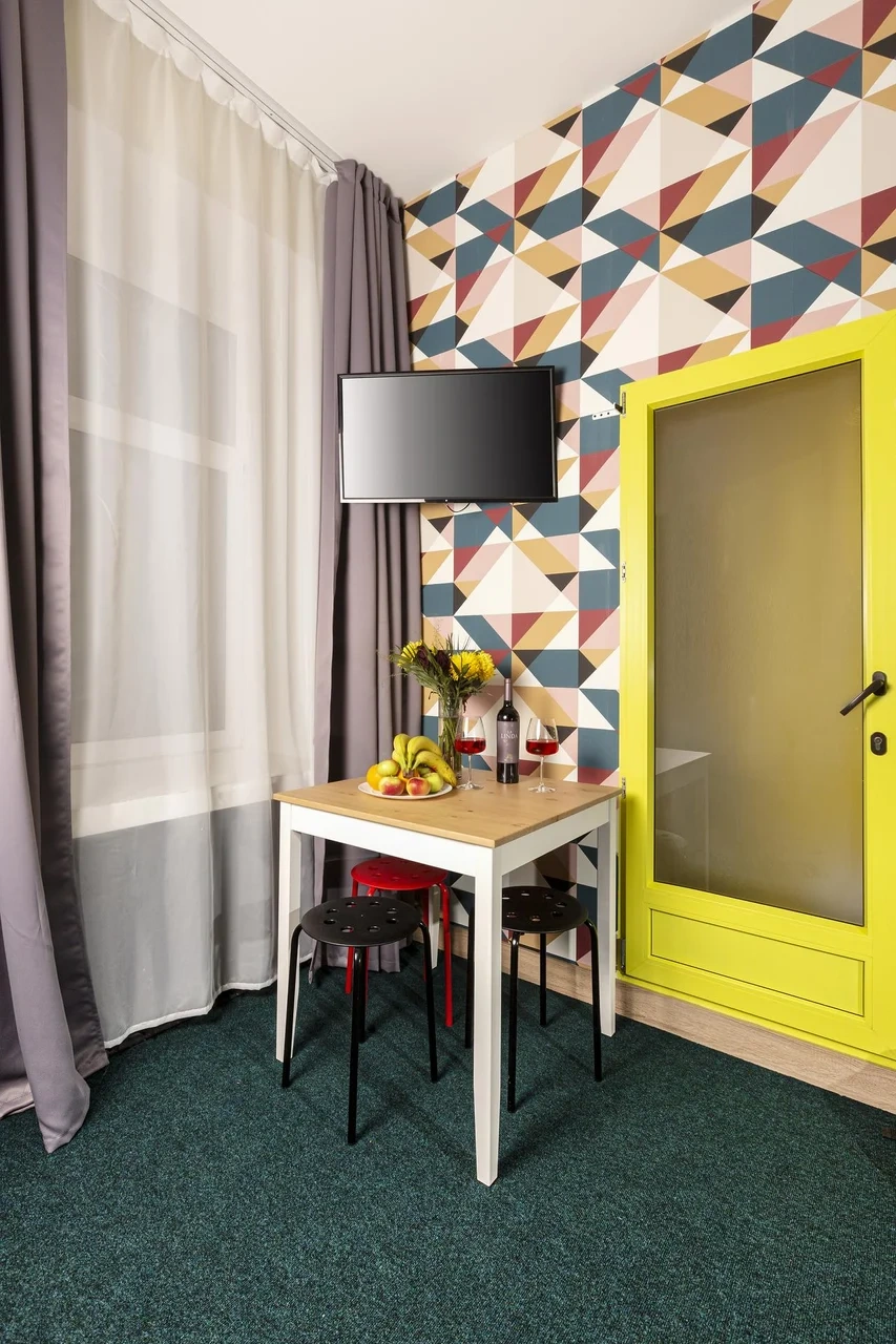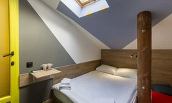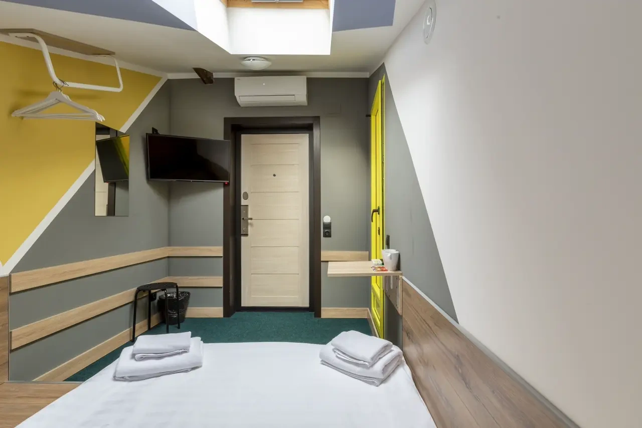Двухместные номера данной категории находятся на 3 этаже и отличаются небольшой площадью и наличием мансардного окна. Приятная обстановка, в том числе ортопедический матрас Askona, заправленный белоснежным постельным бельем из страйп-сатина, свидетельствуют о внимании к деталям. В номере- WIFI и телевизор, подключенный к каналам через интернет. Ванная комната отделана яркой глянцевой плиткой. Пл0щадь каждого из 15 номеров данной категории составляет от 9 до 10 кв. м. Удобства в номере. Ванная комната, Кондиционер, Телевизор, Вешалка для одежды, Бесплатные гигиенические принадлежности, Тапочки, Полотенца. Удобства в отеле. Данные удобства находятся на 1 этаже и являются бесплатными для гостей отеля: Стиральная машина, Мини-кухня с холодильником, Микроволновая печь, Электрический чайник, утюг и гладильная доска. Кроме того, на ресепшене отеля вы можете приобрести кофе.