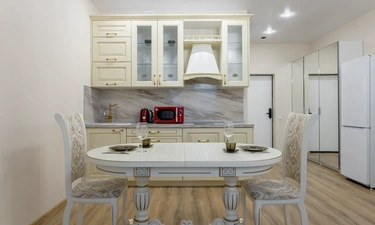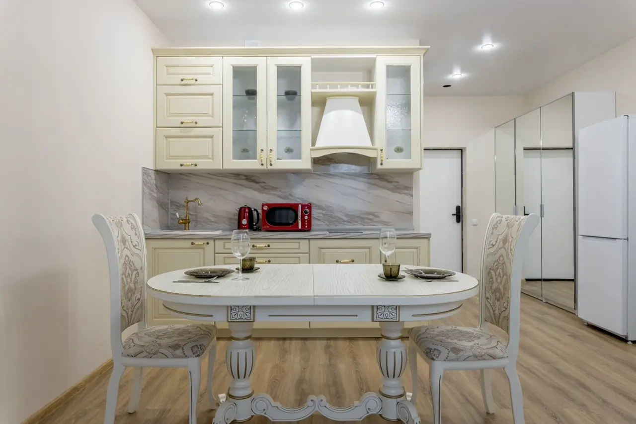 - На кухне: холодильник, варочная панель, вытяжка, чайник. Набор посуды и столовых принадлежностей. Чай и кофе.