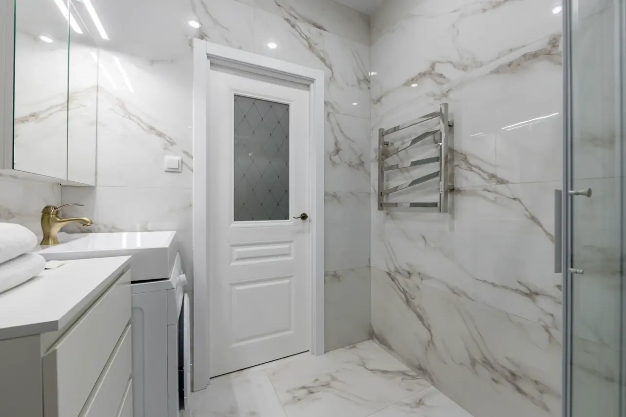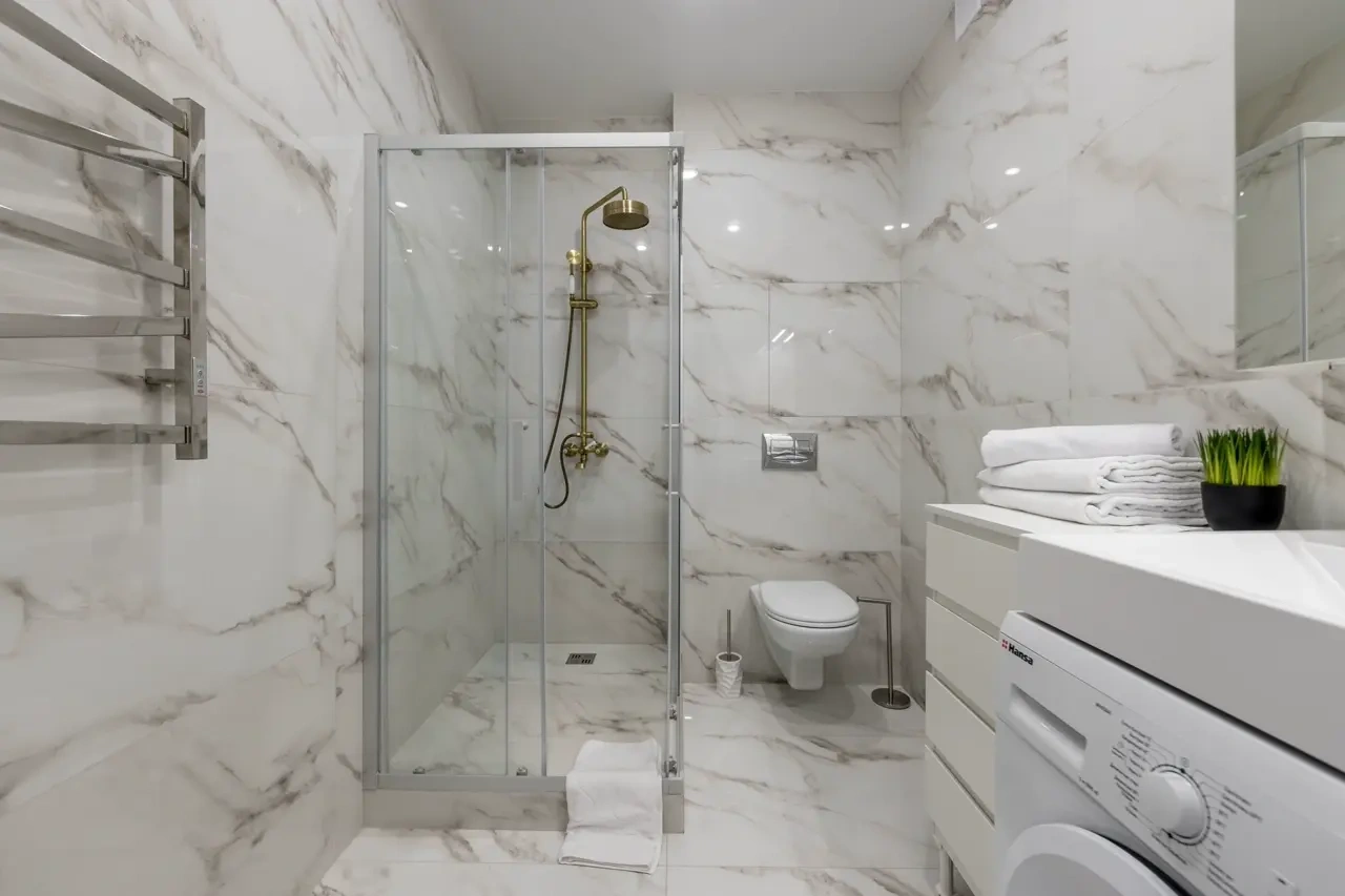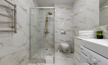 - В ванной комнате: душевая кабина, махровые полотенца, фен, шампунь, мыло, гель для душа. Стиральная машина. Утюг.