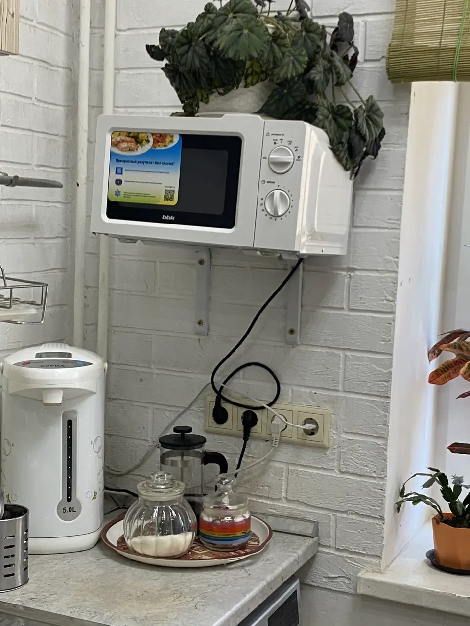 Для приготовления пищи у нас имеется небольшая кухонная зона, со всем необходимым: электрическая варочная панель, микроволновая печь, необходимый набор посуды, термопот, поддерживающий температуру воды в режиме кипения, чай и сахар бесплатно, входят в оплату за проживание.