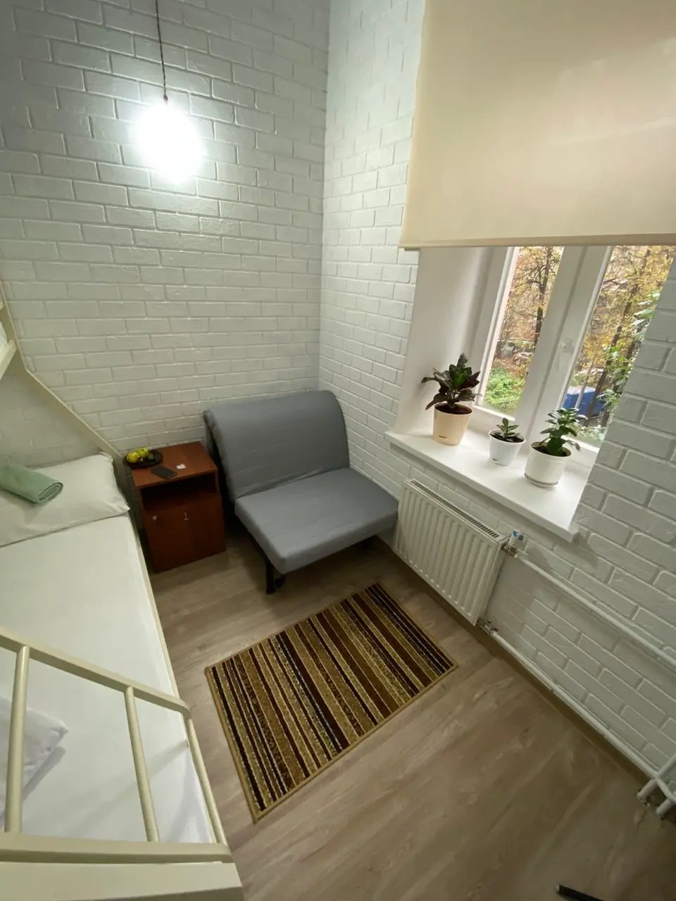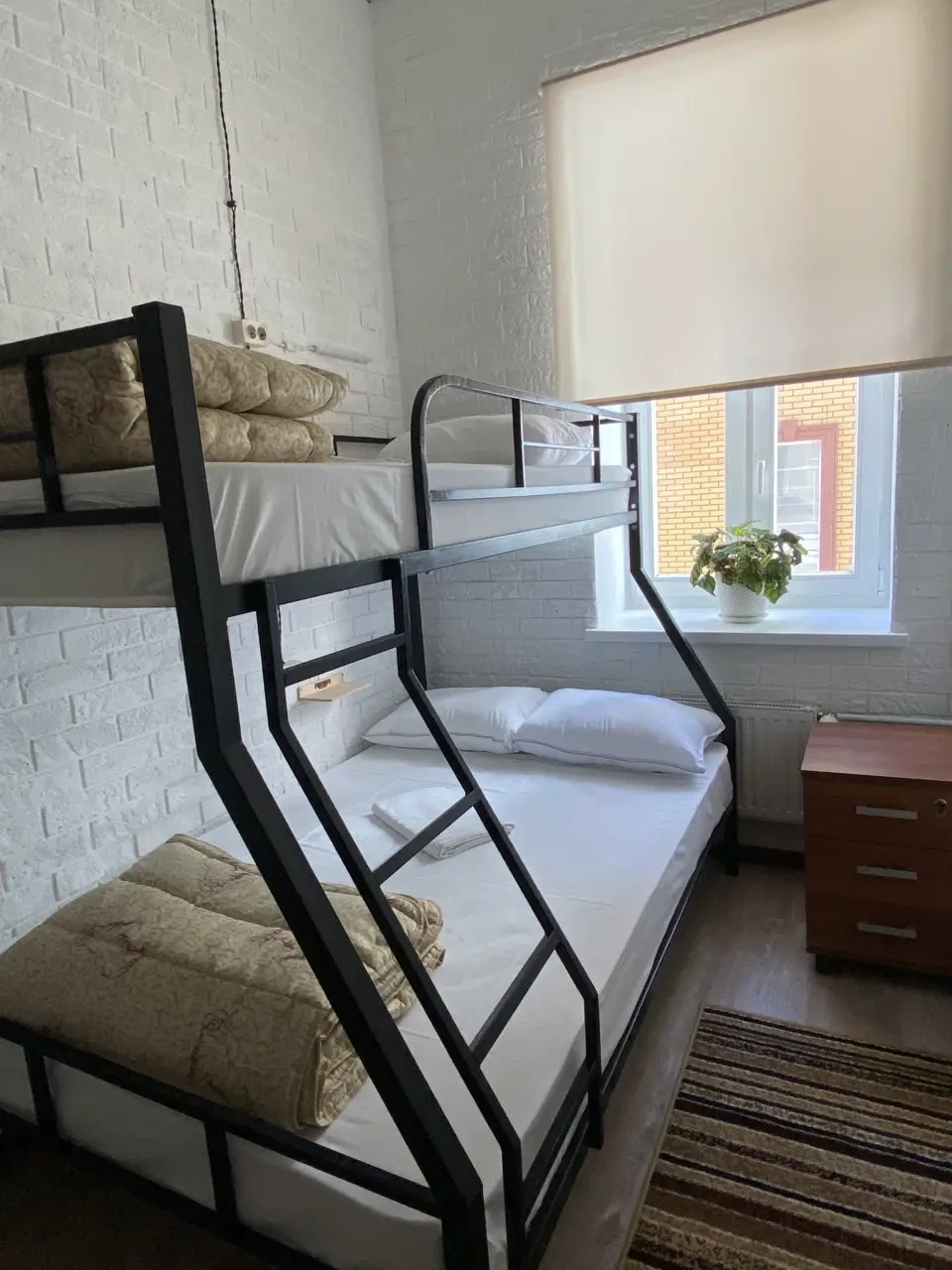Отдельный 4-х местный номер. В номере двухъярусная кровать, нижний ярус-двуспальная кровать, верхний ярус-односпальная. Имеется дополнительное спальное место - кресло кровать. В номере - 3 тумбы, вешалка для одежды, зеркало, прикроватные полочки, двойная розетка, индивидуальное освещение у каждого яруса кровати. Вид из окна на спортивную площадку. Возможно одноместное, двухместное, трехместное и четырехместное размещение, отлично подходит для семьи из 4-х человек или небольшой компании