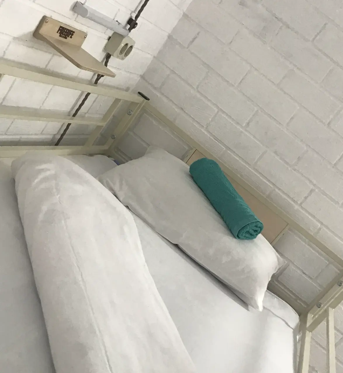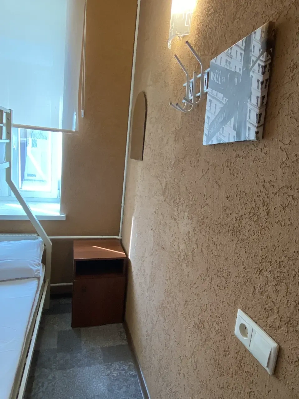 Отдельный номер без окна, эконом вариант. В номере двухъярусная кровать, нижний и верхний ярусы - односпальная кровать, размер спального места 200см. * 90 см.. В номере тумбочка, зеркало, вешалка. У каждого спального места двойная розетка, индивидуальное освещение, полочка.