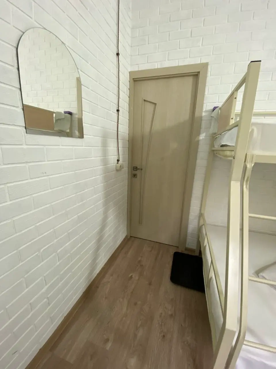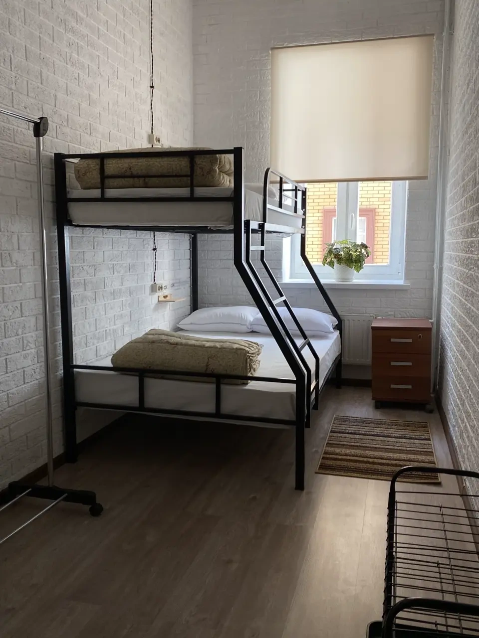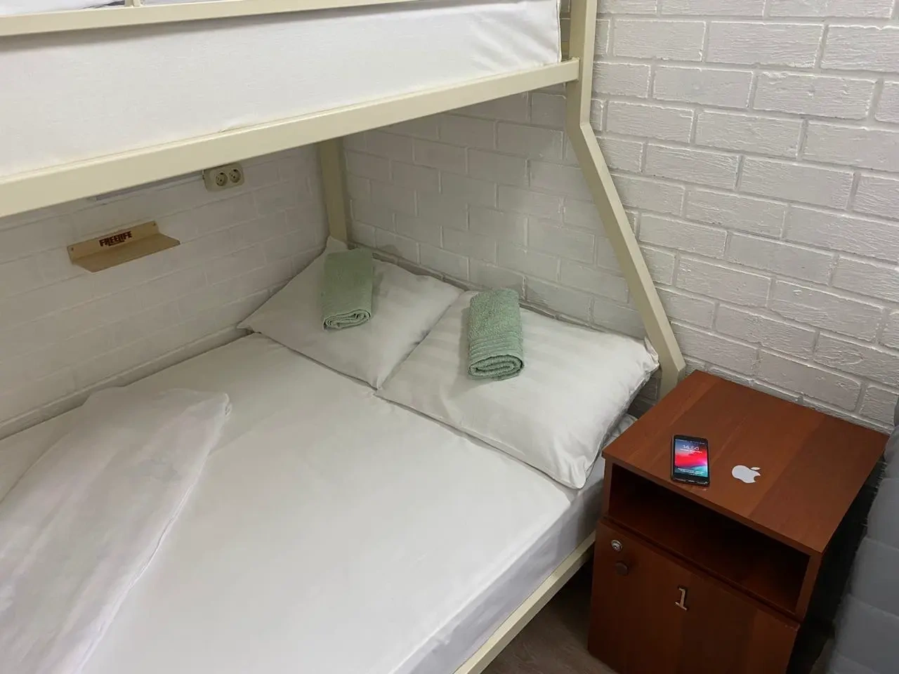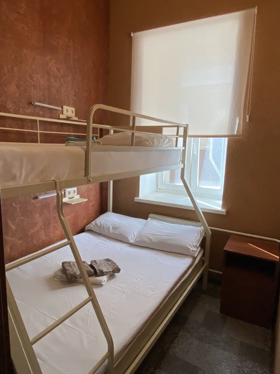 Двухъярусная кровать, нижний ярус-двуспальная кровать, верхний ярус-односпальная. В номере имеется тумба, вешалка для одежды, зеркало, прикроватные полочки, розетки, индивидуальное освещение у каждого яруса кровати