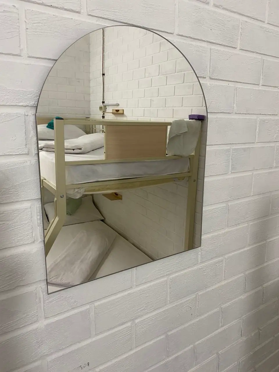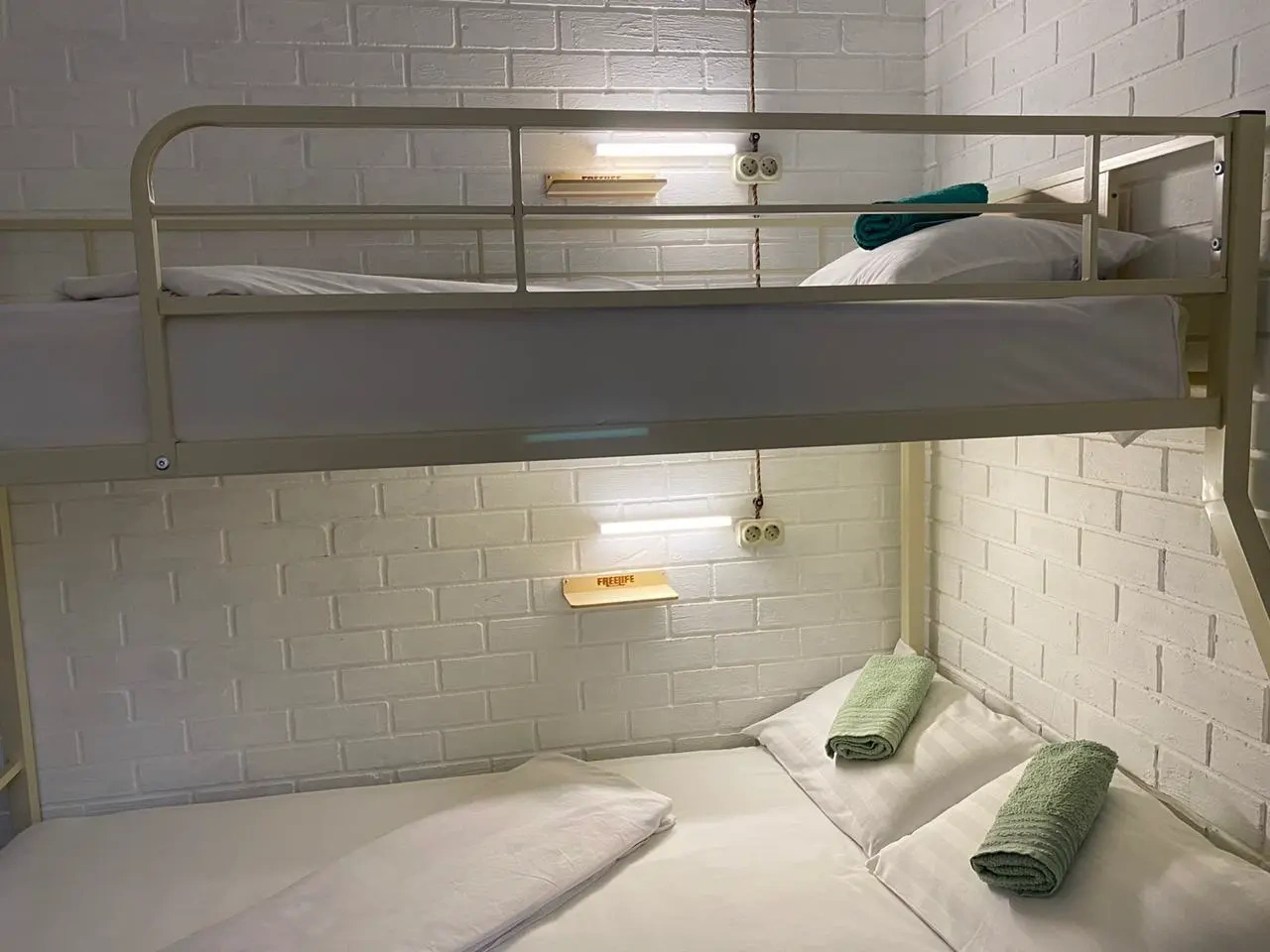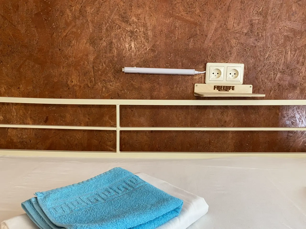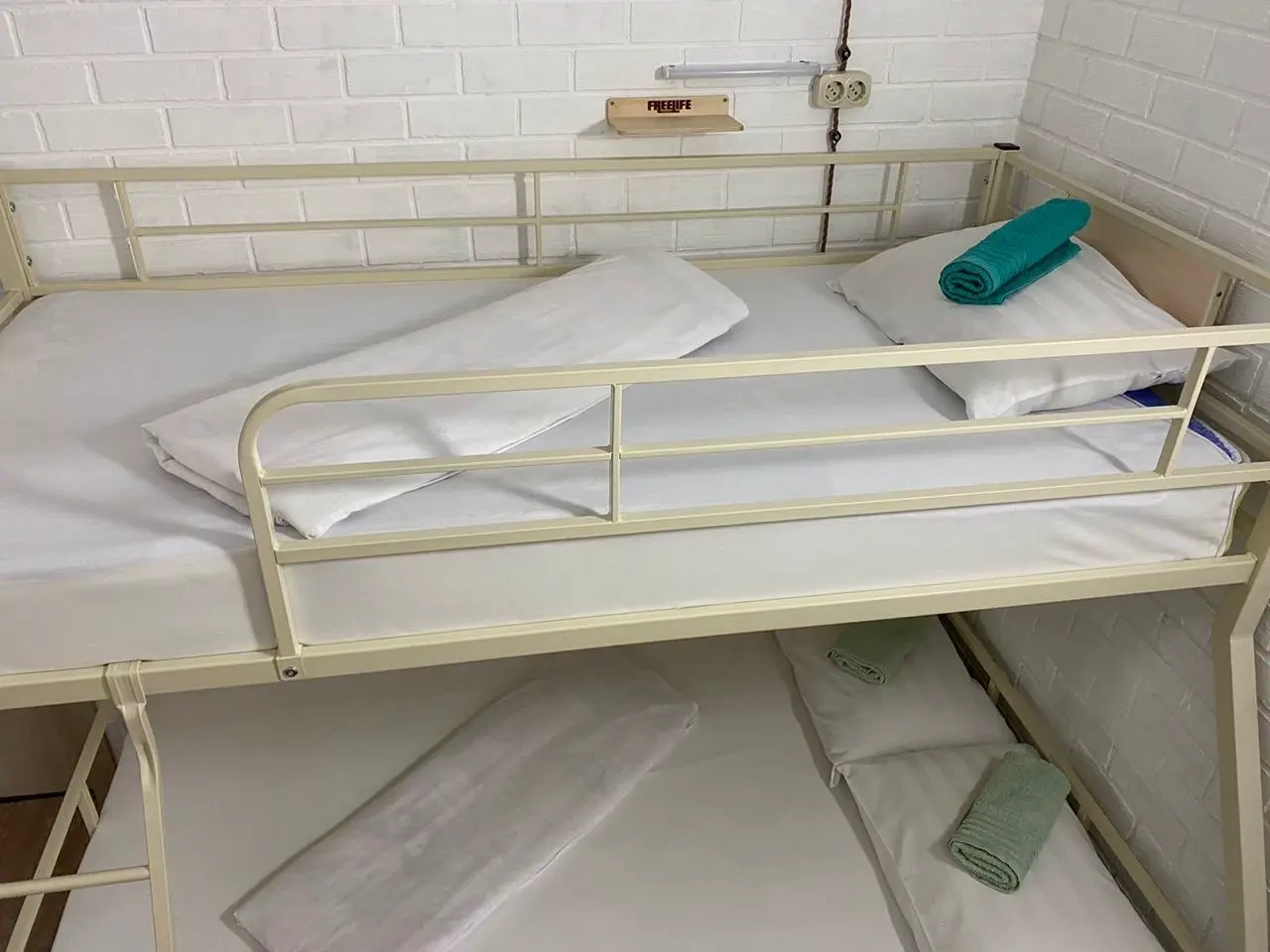 Двухъярусная кровать, нижний ярус-двуспальная кровать, верхний ярус-односпальная. В номере имеется тумба, вешалка для одежды, зеркало, прикроватные полочки, розетки, индивидуальное освещение у каждого яруса кровати