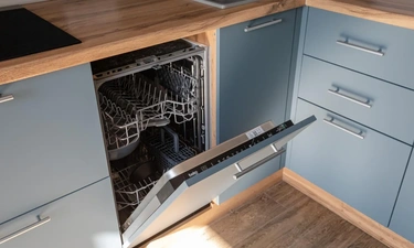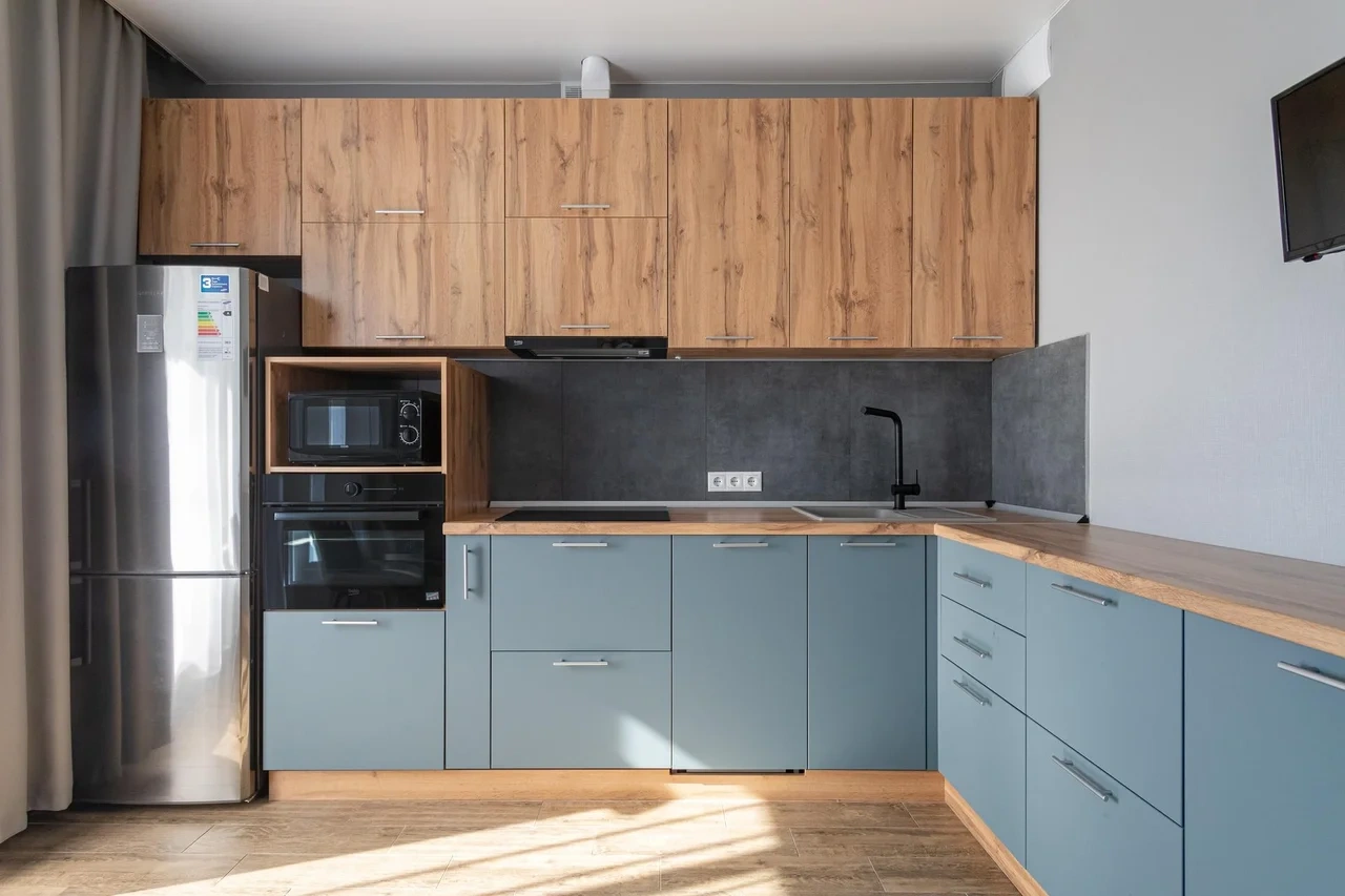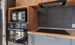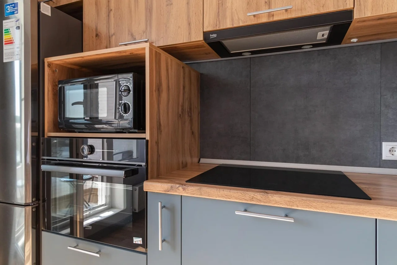 — электрическая плита, микроволновка, посудомоечная машина, духовка, вытяжка, чайник, холодильник;