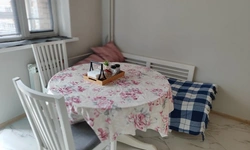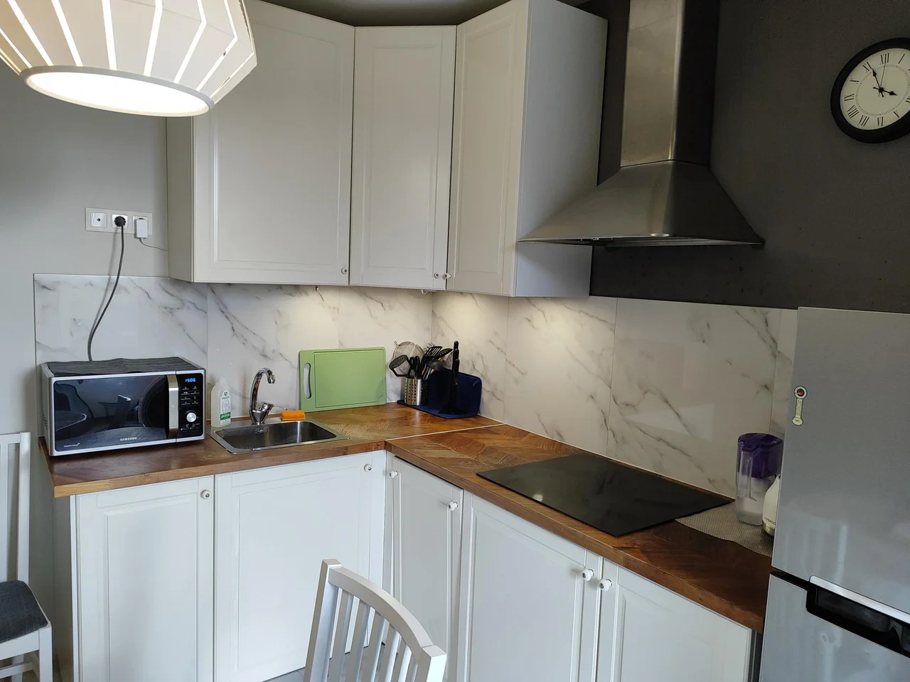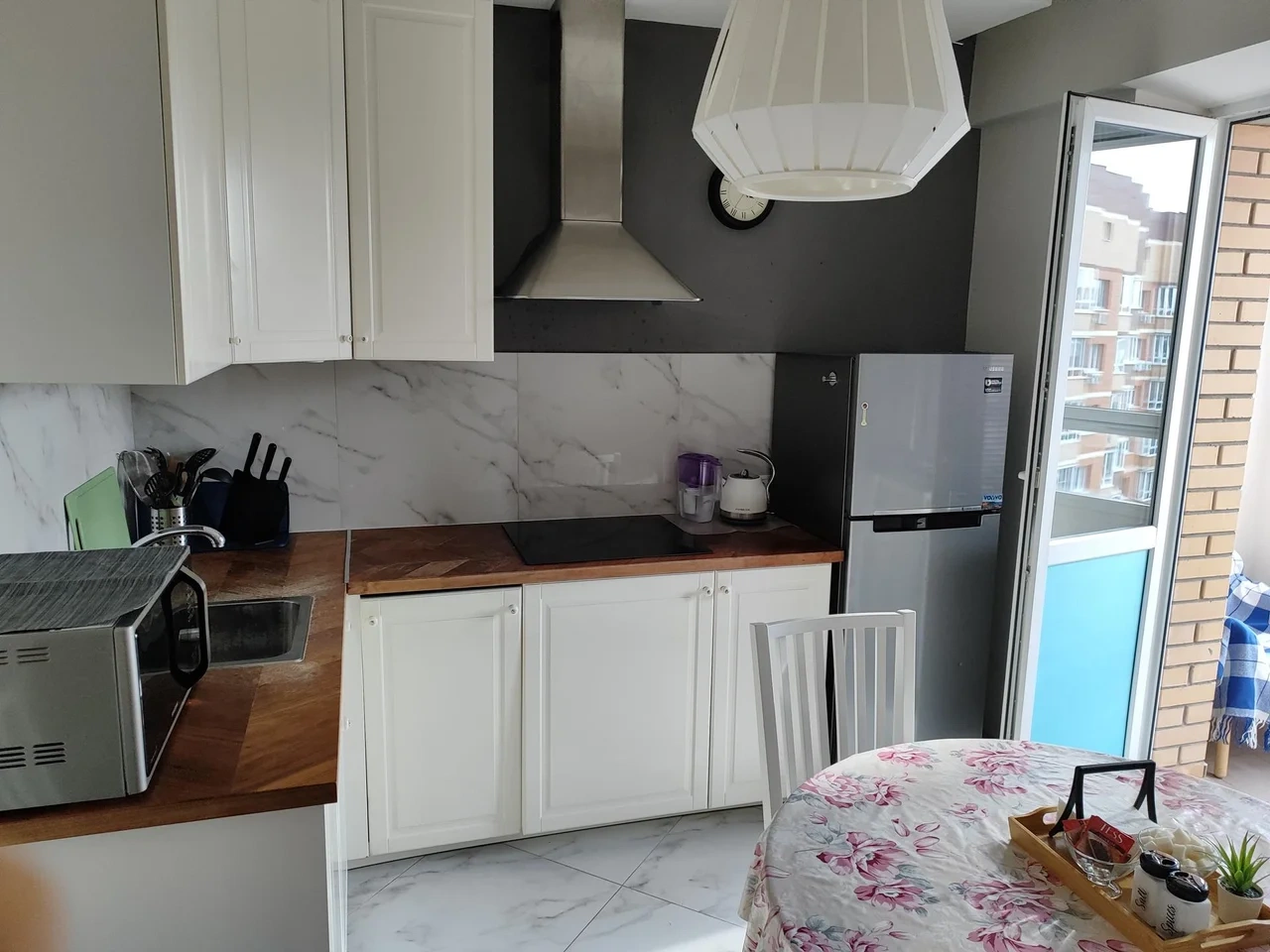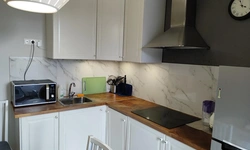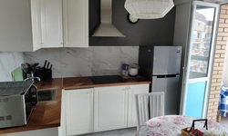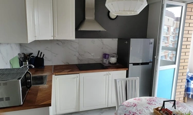 Кухня белая с добротной коричневой столешницей, необычным чайником, посудомоечной машиной, фильтром для воды, СВЧ, вытяжкой, холодильником. Все в исправном состоянии. Вся кухонная утварь в наличии.