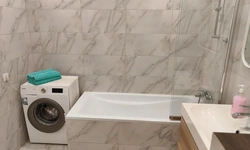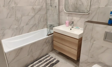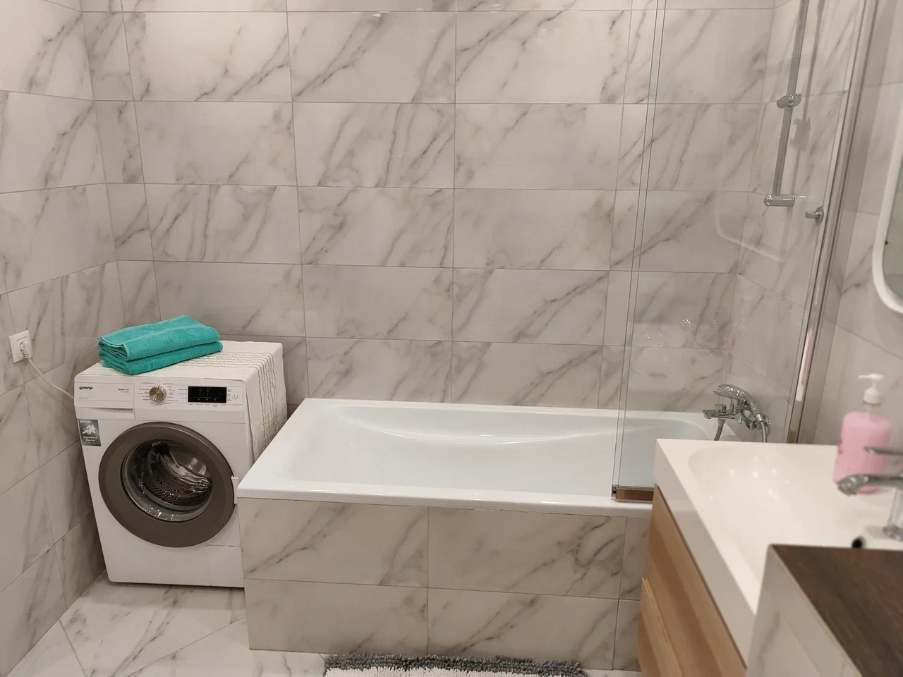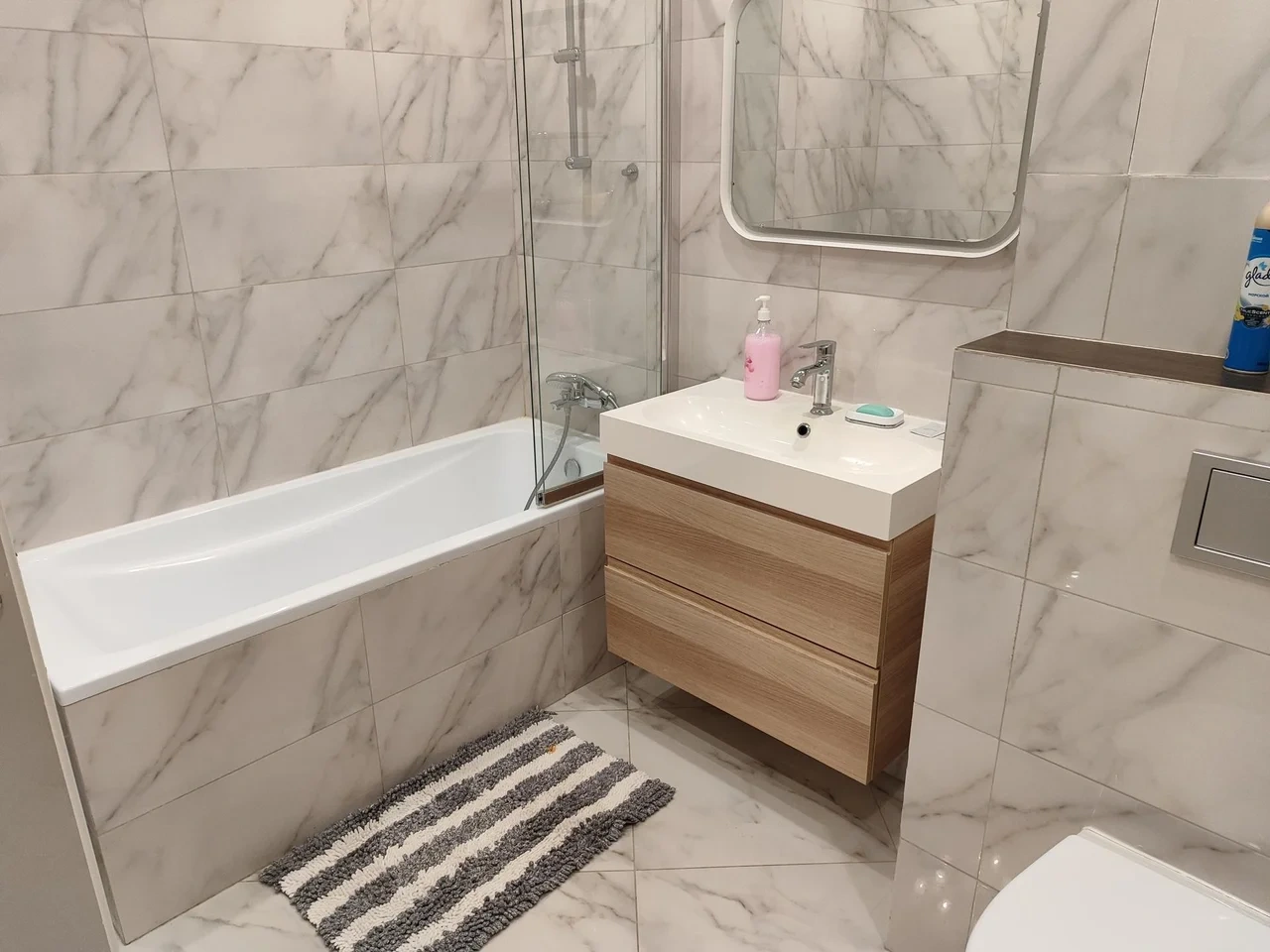 В ванной располагается полочка для полотенец, вещей, шампуней. Сама ванная комната просторная, ванна со стеклянной створкой, зеркало с доп освещением, удобная, большая раковина. В стену встроили инсталляцию, поэтому унитаз смывается нажатием настенной кнопочкой.