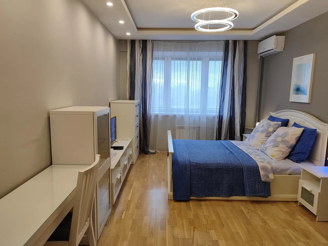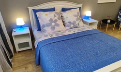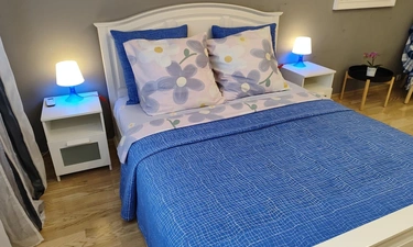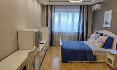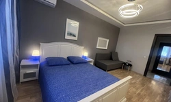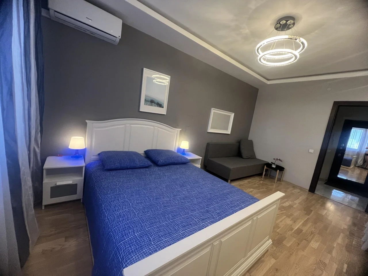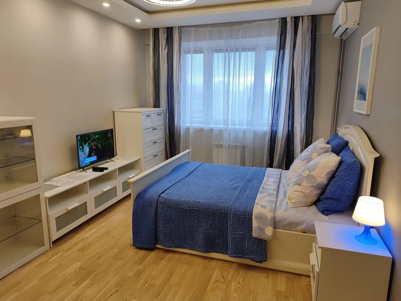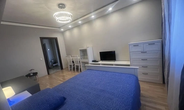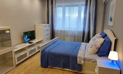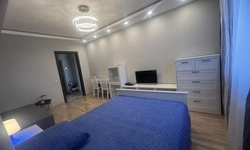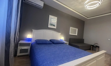 Уютная квартира с прекрасной двуспальной кроватью. Спальня исполнена в белых тонах, чтобы гостю было спокойно и комфортно как дома. Телевизор располагается напротив кровати, кондиционер в комнате. Прикроватные тумбы с ночниками. Кресло и столик дополнили в уголке, чтобы за чашечкой кофе можно было присесть и отдохнуть. В комоде много ящичков, можно размещать и вещи и документы и детские игрушки.