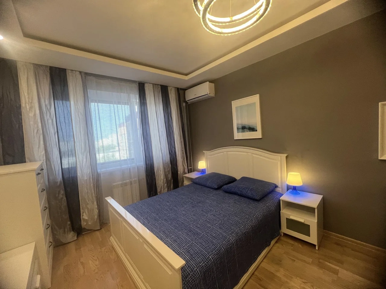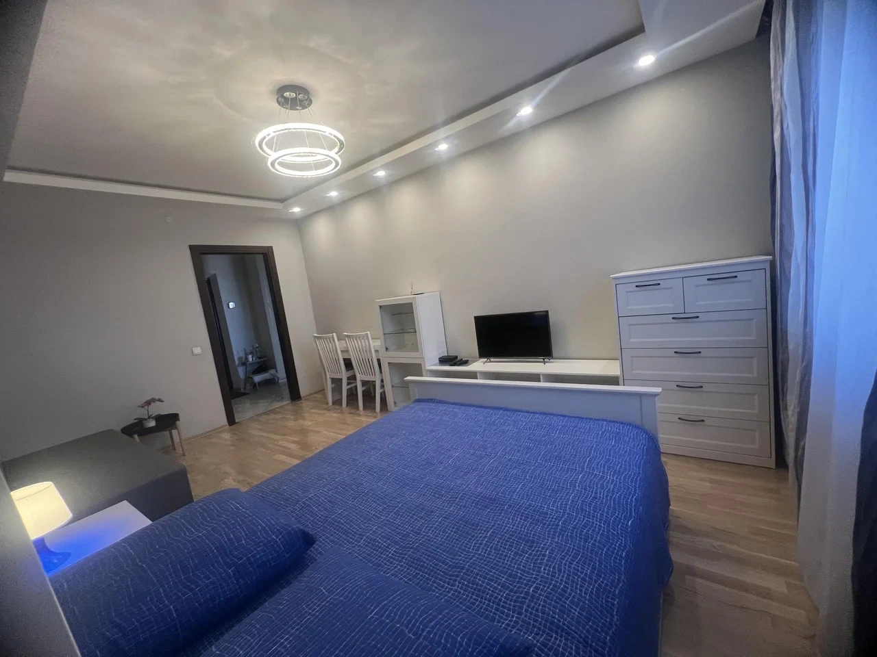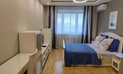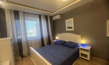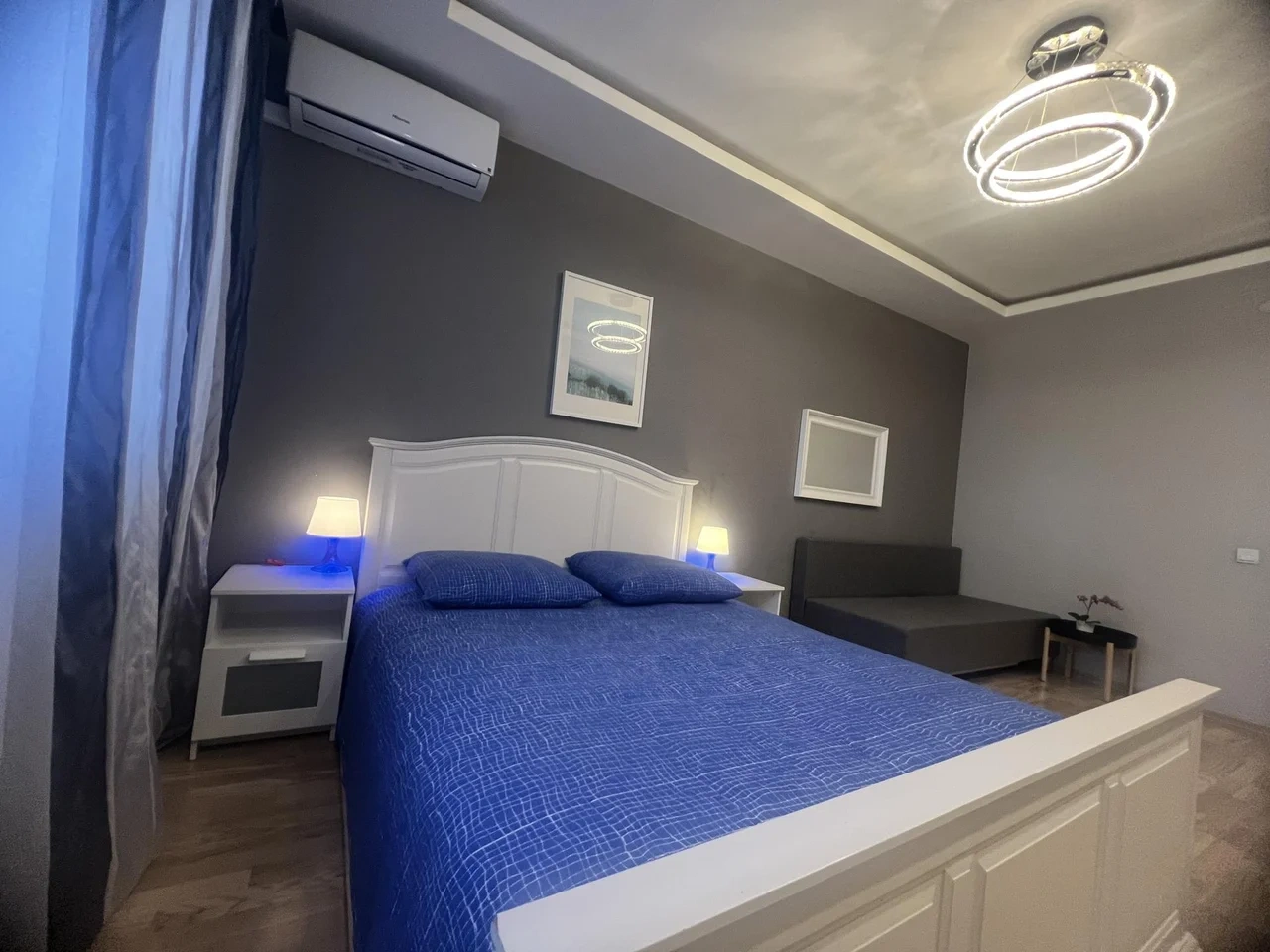 Уютная квартира с прекрасной двуспальной кроватью. Спальня исполнена в белых тонах, чтобы гостю было спокойно и комфортно как дома. Телевизор располагается напротив кровати, кондиционер в комнате. Прикроватные тумбы с ночниками. Кресло и столик дополнили в уголке, чтобы за чашечкой кофе можно было присесть и отдохнуть. В комоде много ящичков, можно размещать и вещи и документы и детские игрушки.