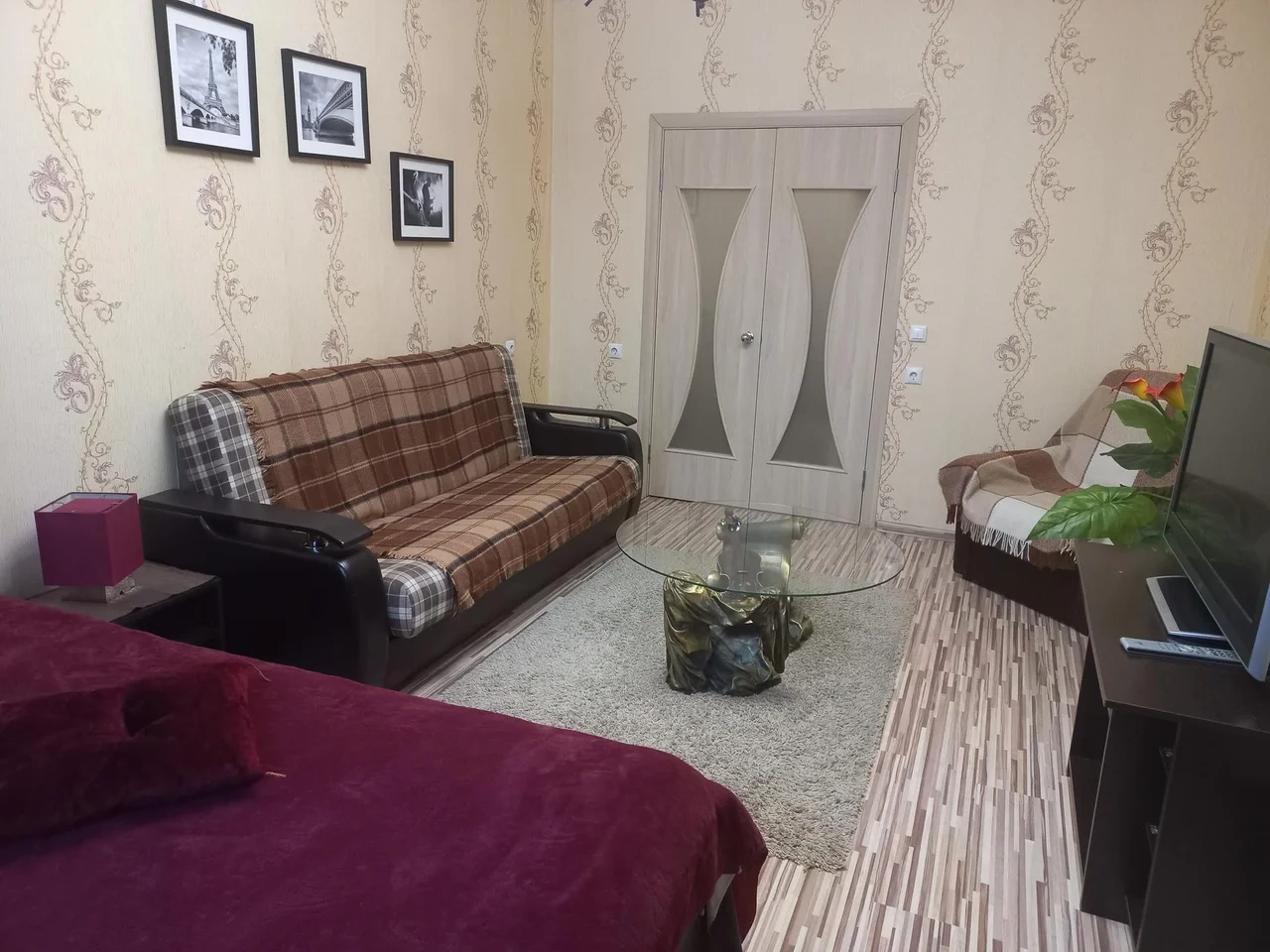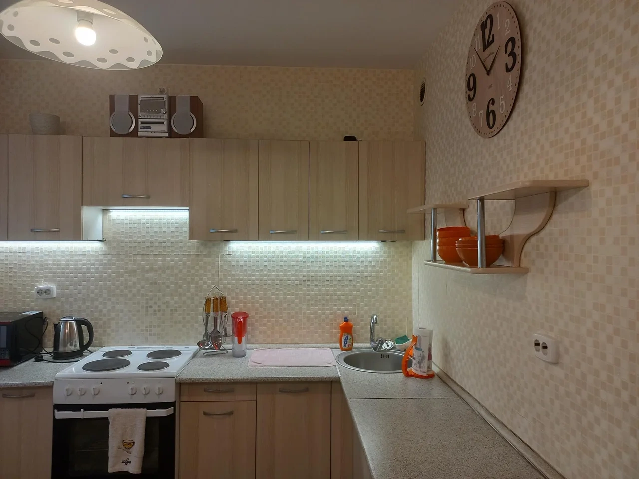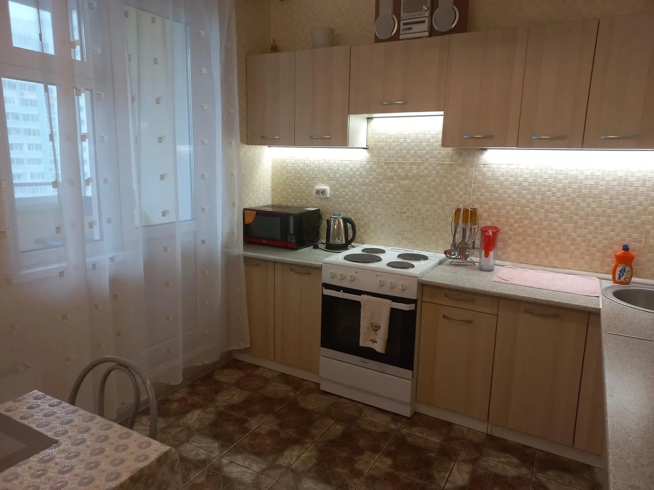 Удобная двуспальная кровать, диван, оборудованная кухня (плита, микроволновка, холодильник, посуда), стиральная машинка, застекленная просторная лоджия. Бесплатный wi-fi. Вокруг развитая инфраструктура - торговый центр, продовольственные магазины на любой вкус.
