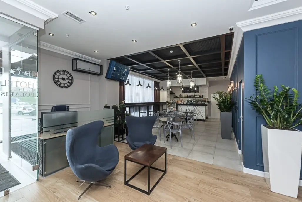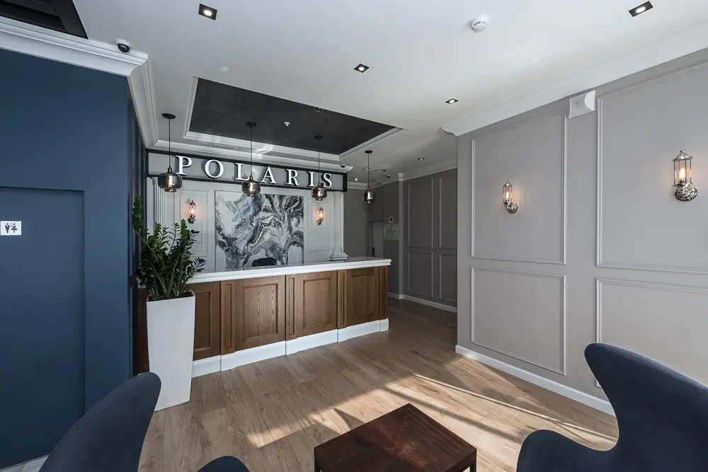 Гостиница Полярис располагает номерами различной категории: Стандартный одноместный, Стандартный двухместный, Полулюкс, Люкс, двухкомнатный Бизнес-Люкс. А также номера повышенной комфортности оформленные в современном стиле «Лофт»: Стандарт Комфорт, Полулюкс Премиум, Люкс Премиум. Номера оформлены в мягких тонах и обставлены современной мебелью. Оснащены кондиционером, телевидением, холодильником, чайником и феном. в зависимости от категории номера. Ванная комната оснащена туалетными наборами. На 1 этаже отеля расположена зона кафе.