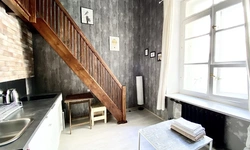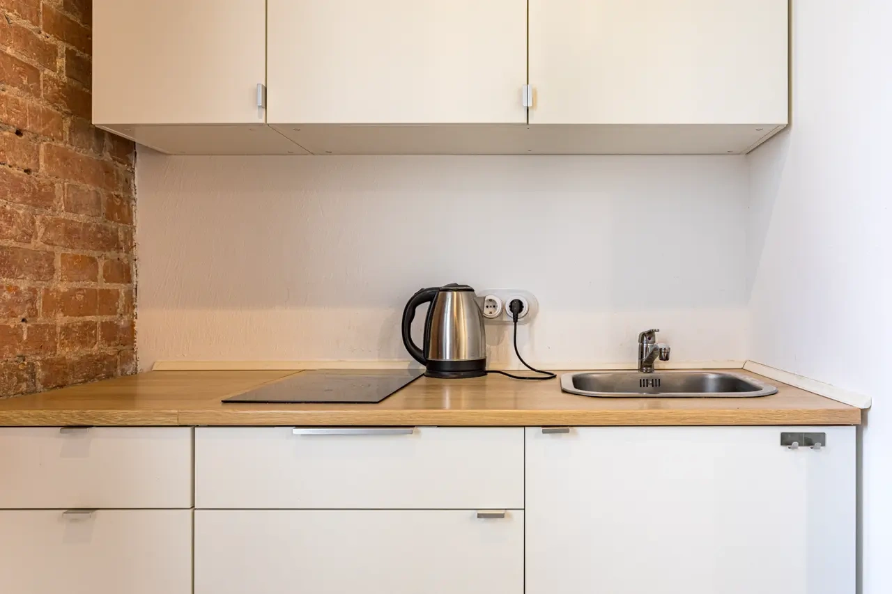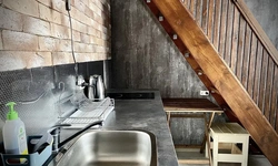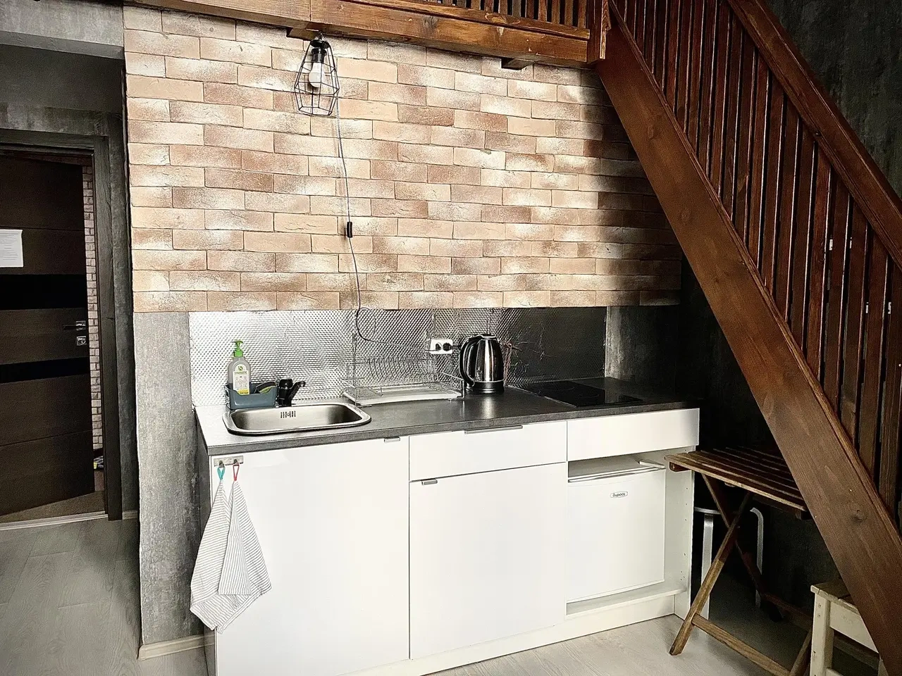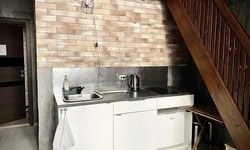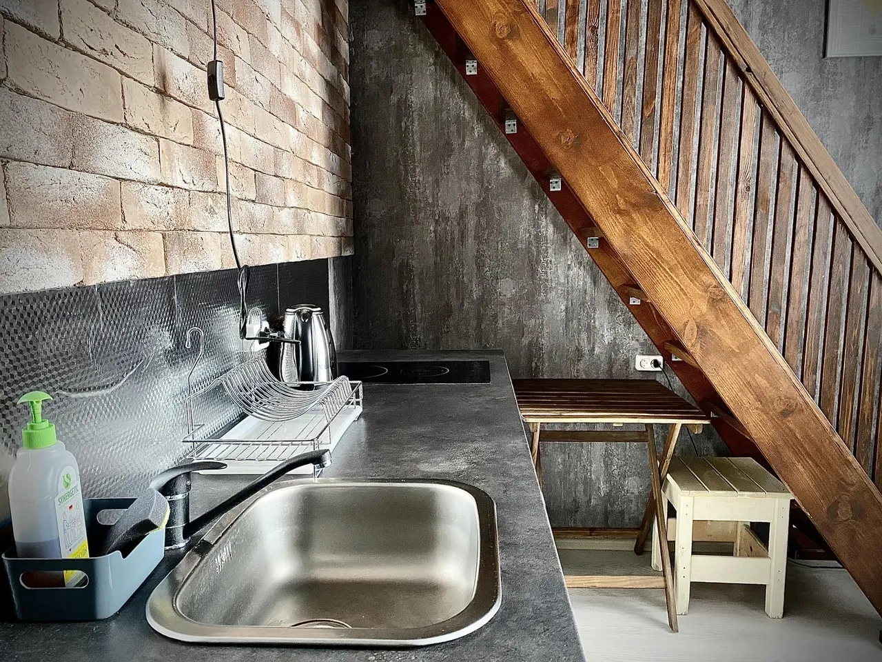 - ужасная кухонная мебель, включая крайне неудобный низкий стол и полное отсутствие стульев, а также отломанный кран в мойке;