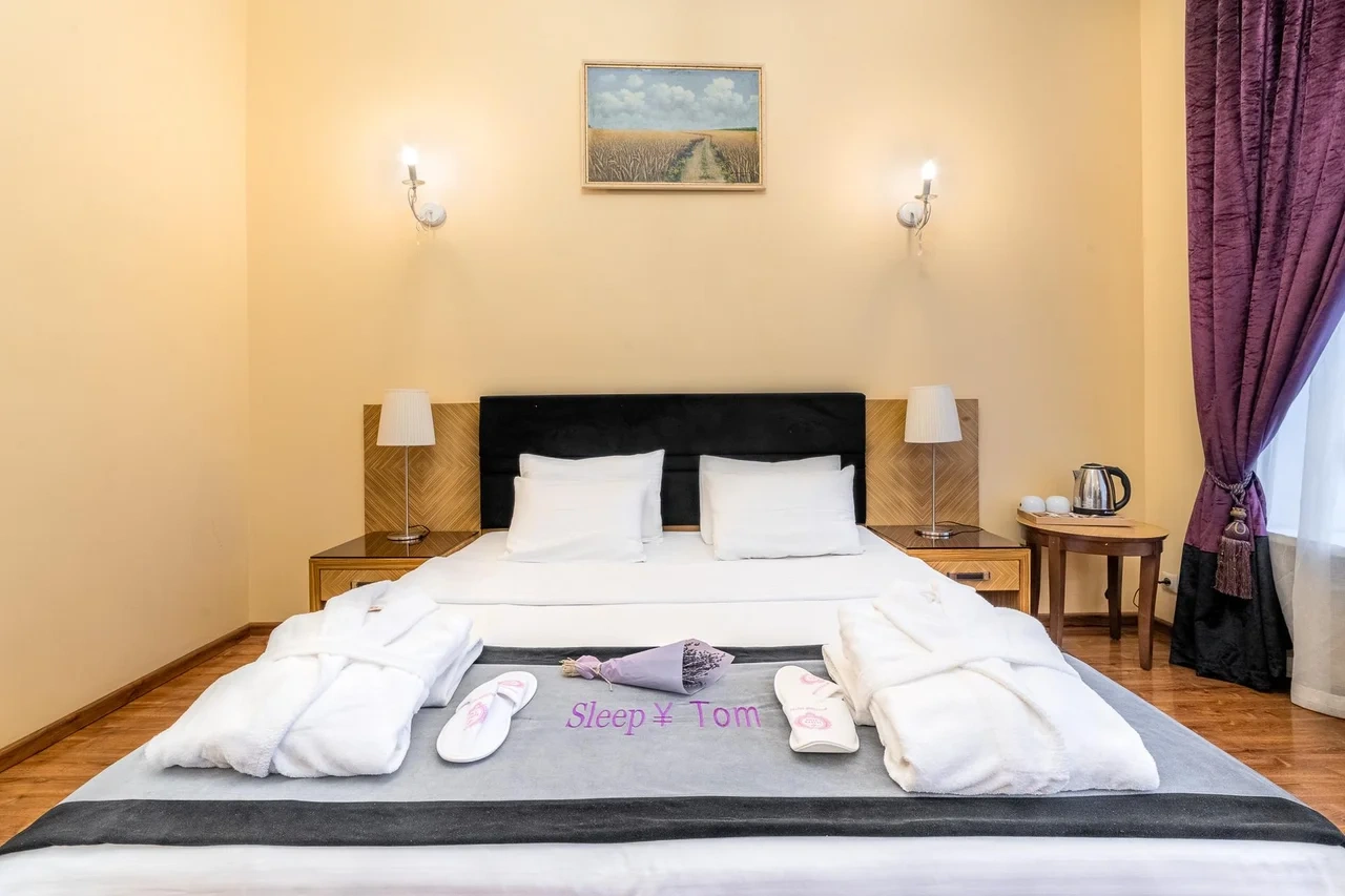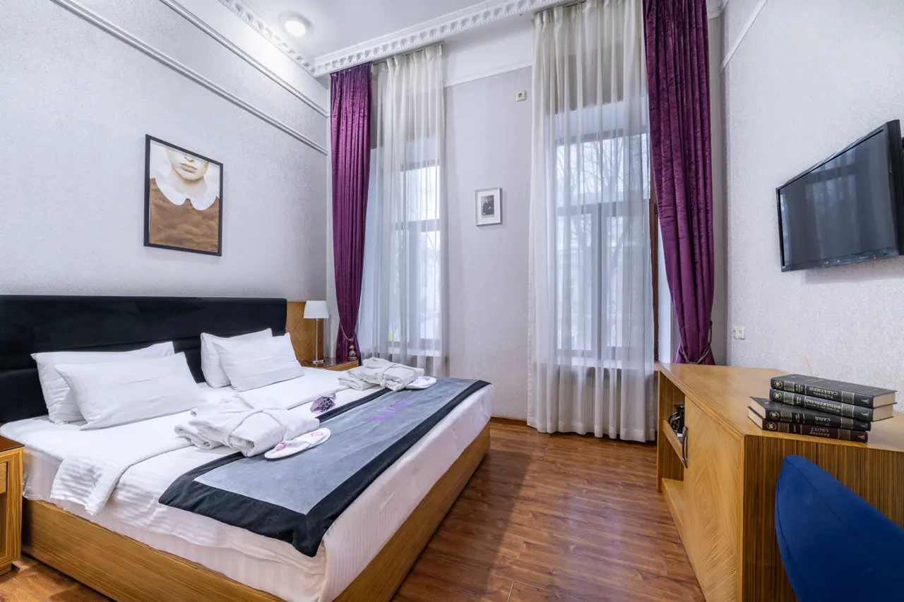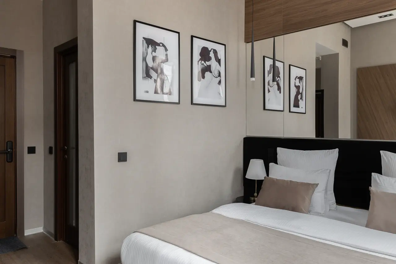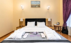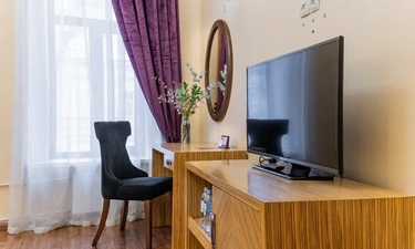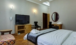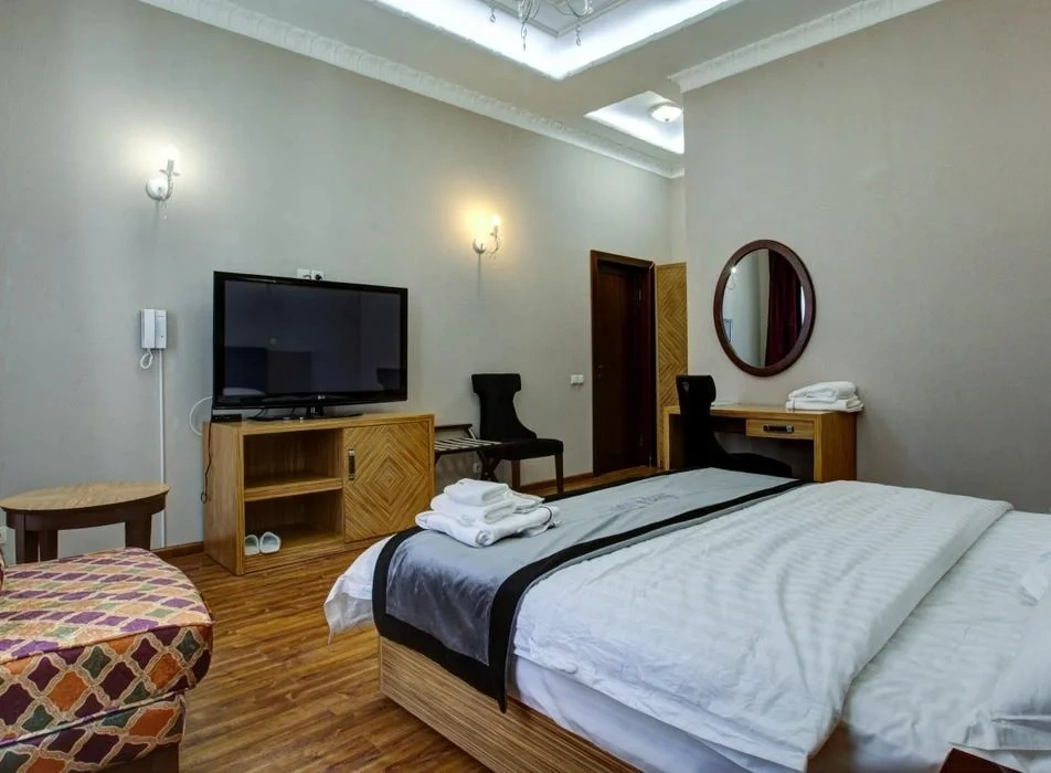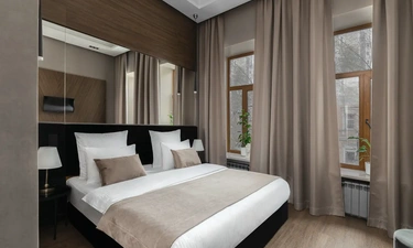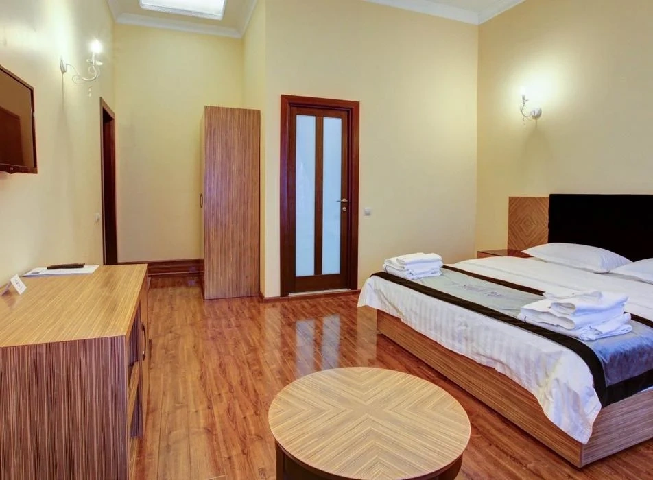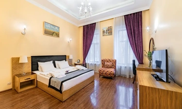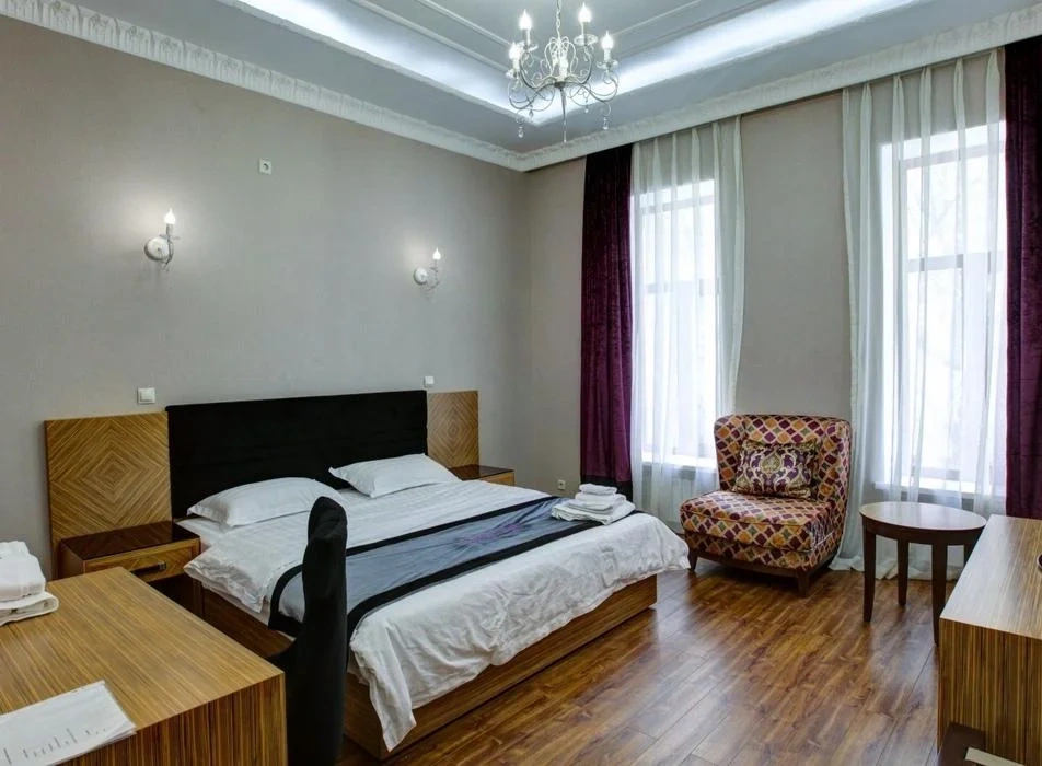 В отеле 11 просторных номеров площадью от 15 м². В каждом номере — телевизор, мини-бар, сейф, качественная мебель, большие зеркала. Все номера с окнами, индивидуальными удобствами, душем или ванной.