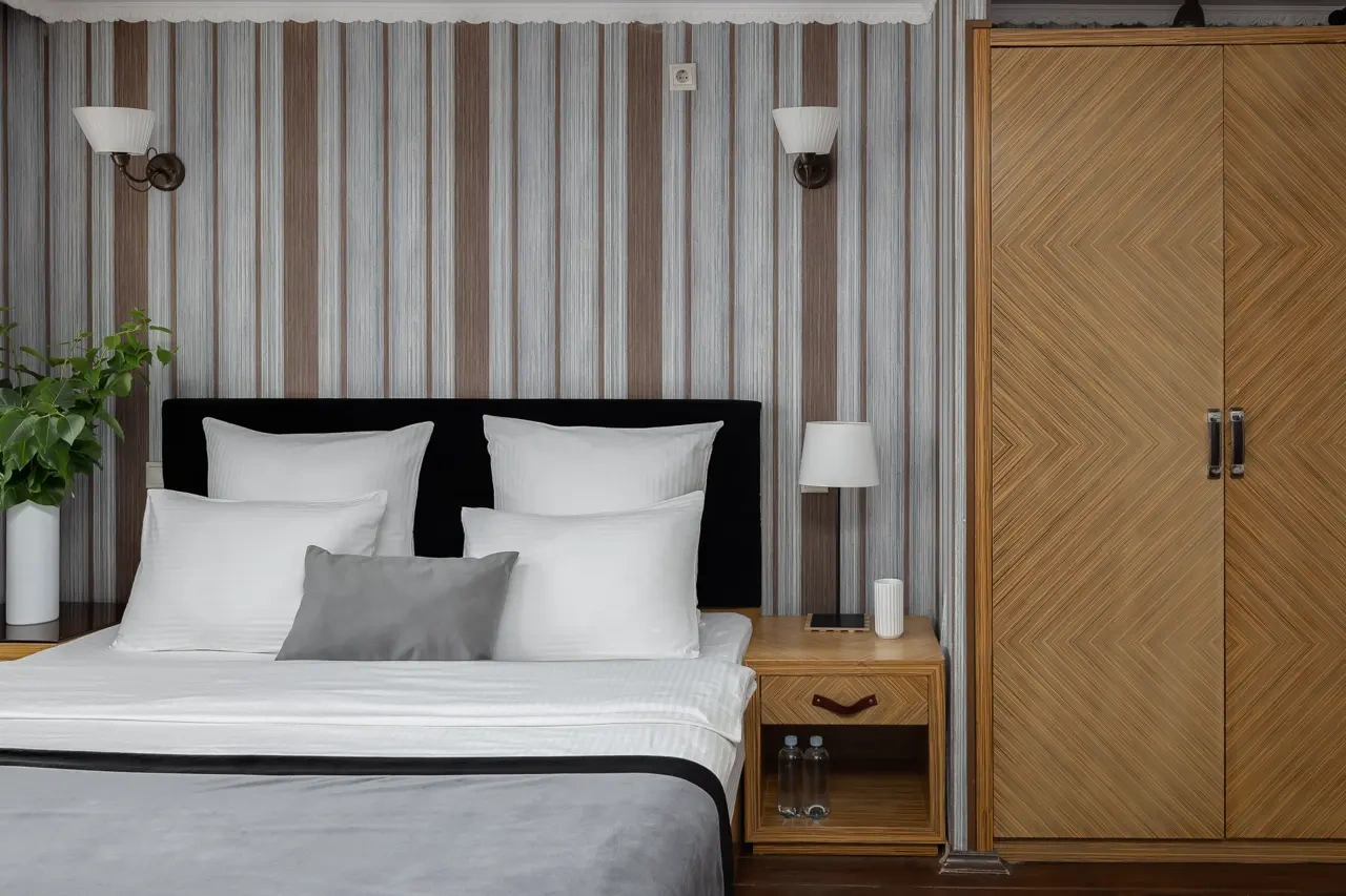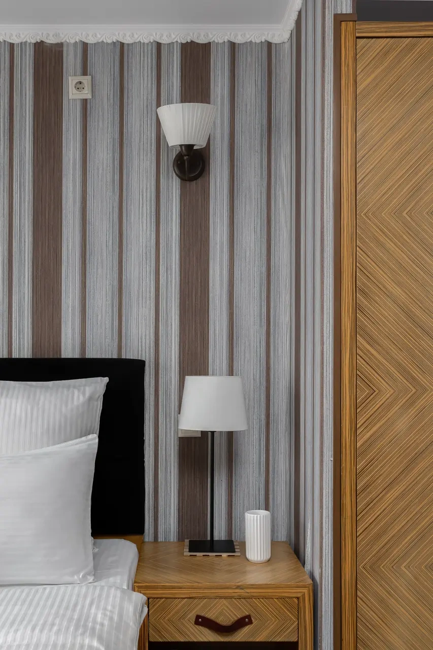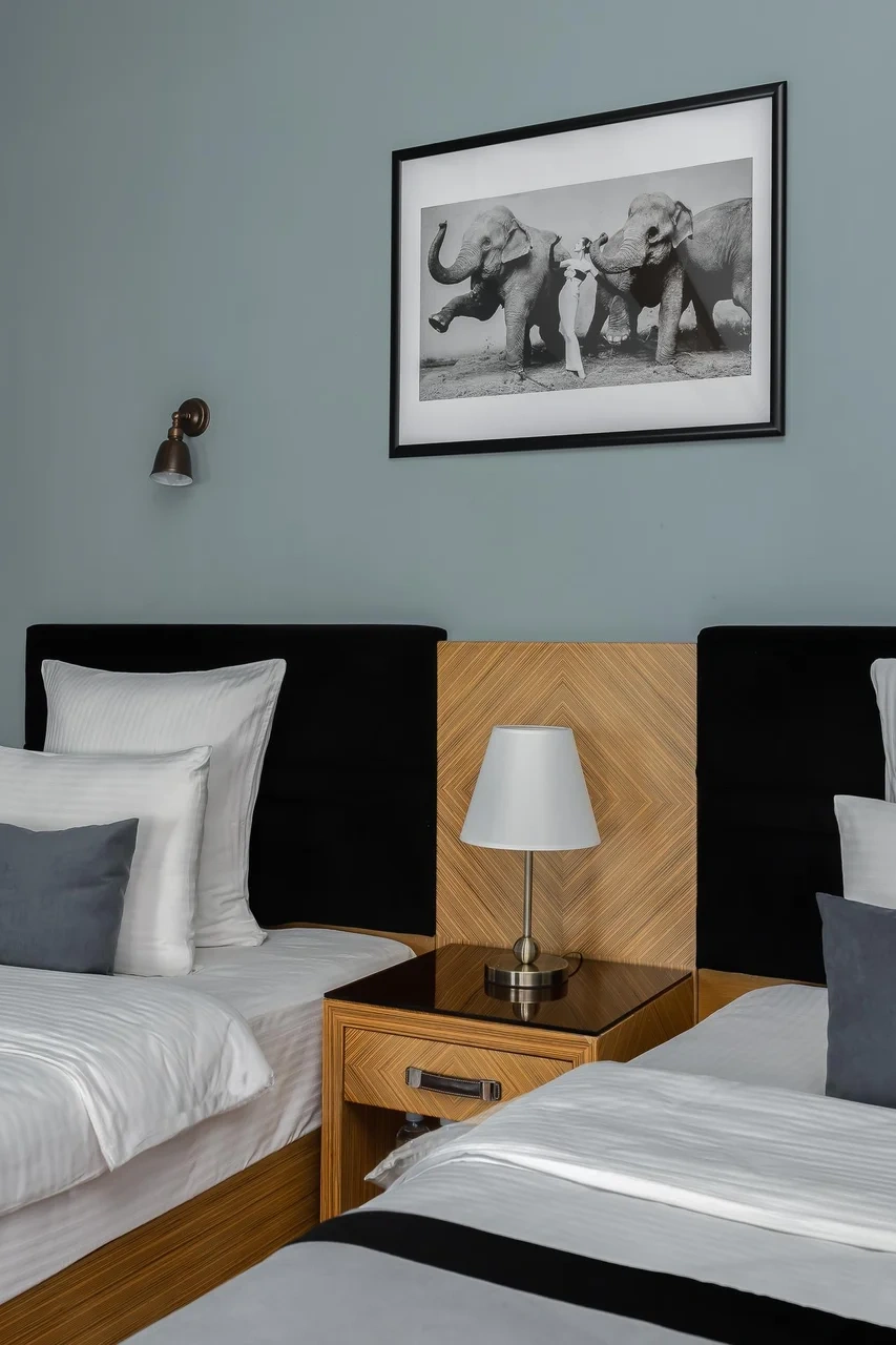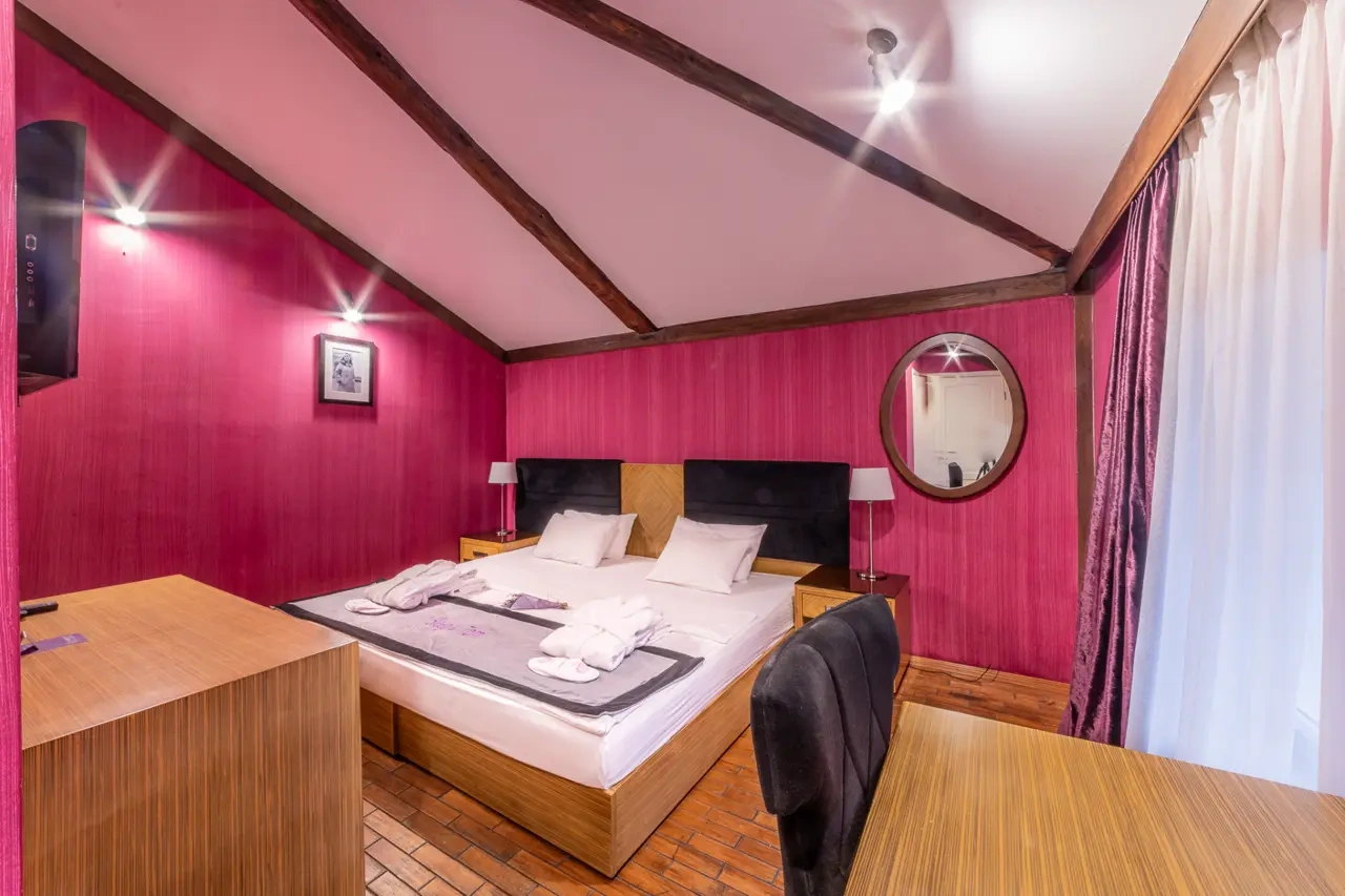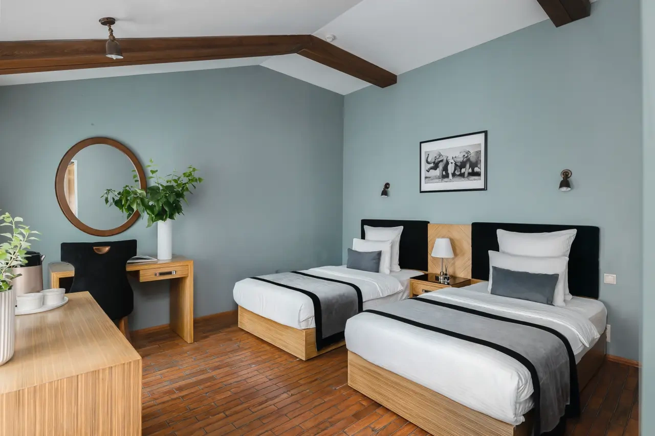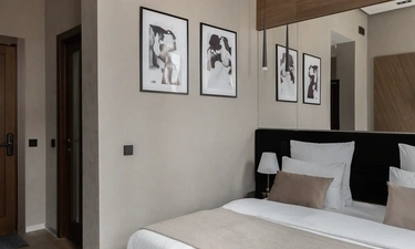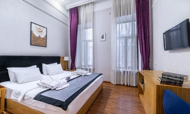 В отеле 11 просторных номеров площадью от 15 м². В каждом номере — телевизор, мини-бар, сейф, качественная мебель, большие зеркала. Все номера с окнами, индивидуальными удобствами, душем или ванной.