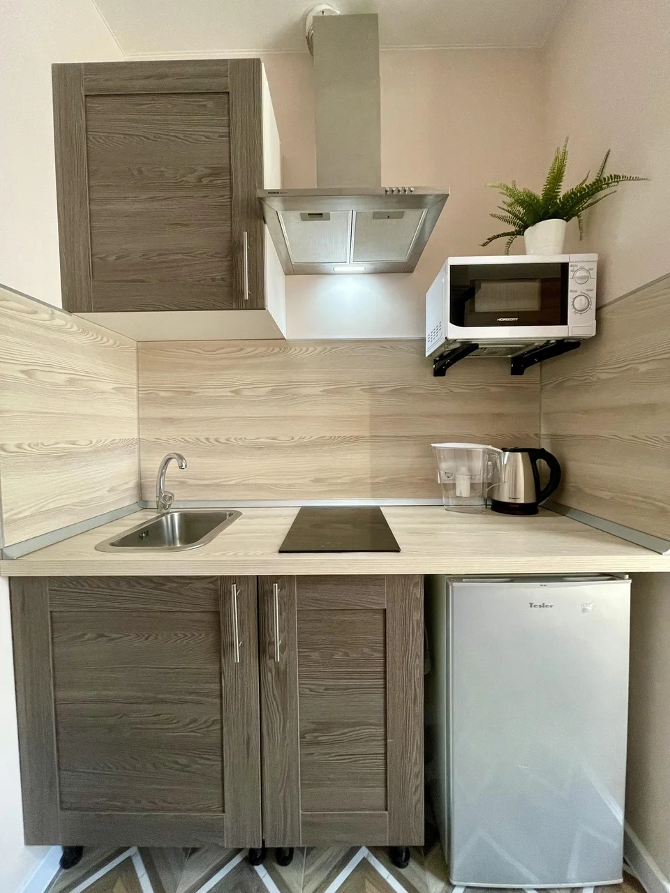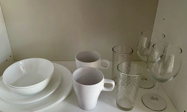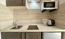 - Кухня с холодильником, плитой, микроволновкой, чайником и посудой