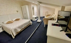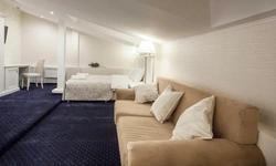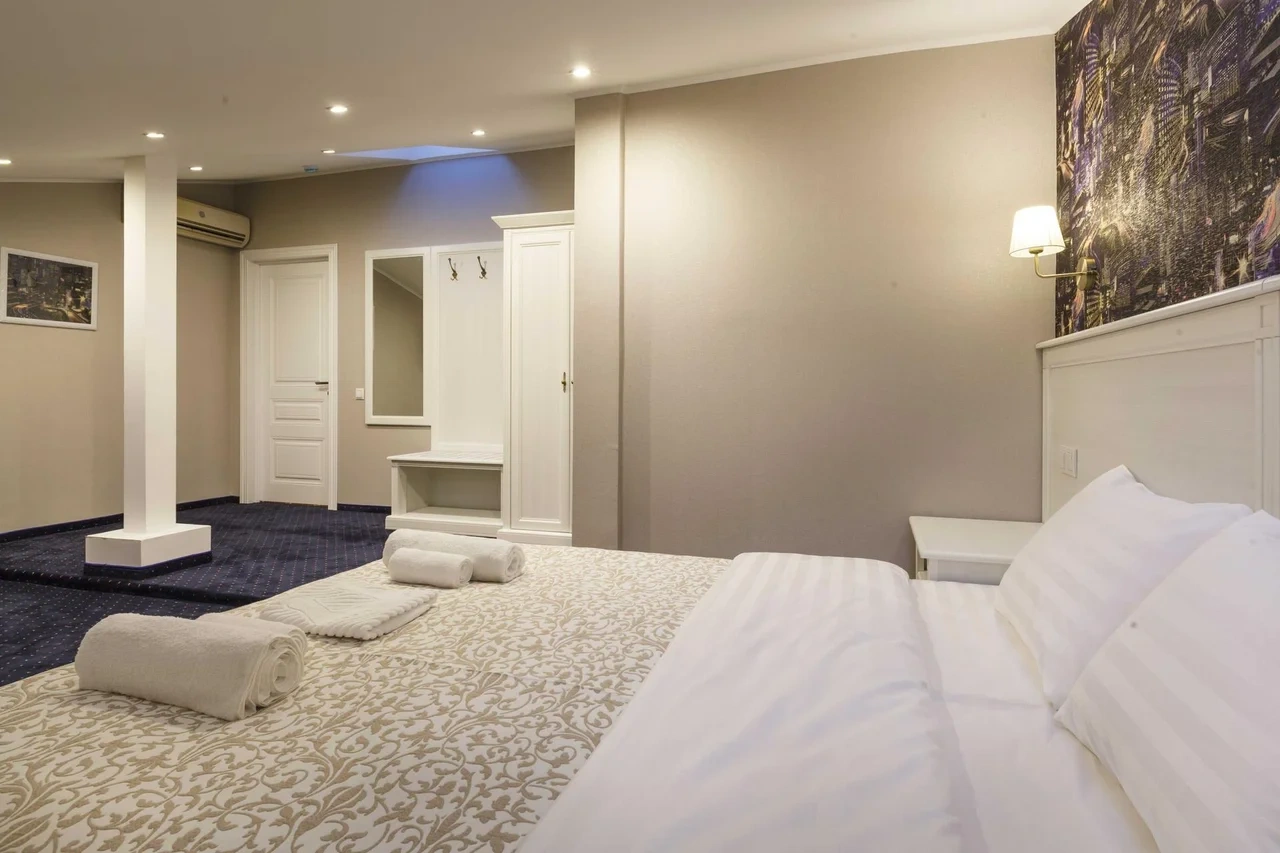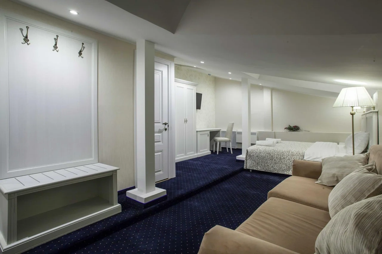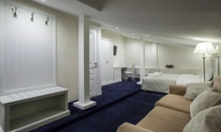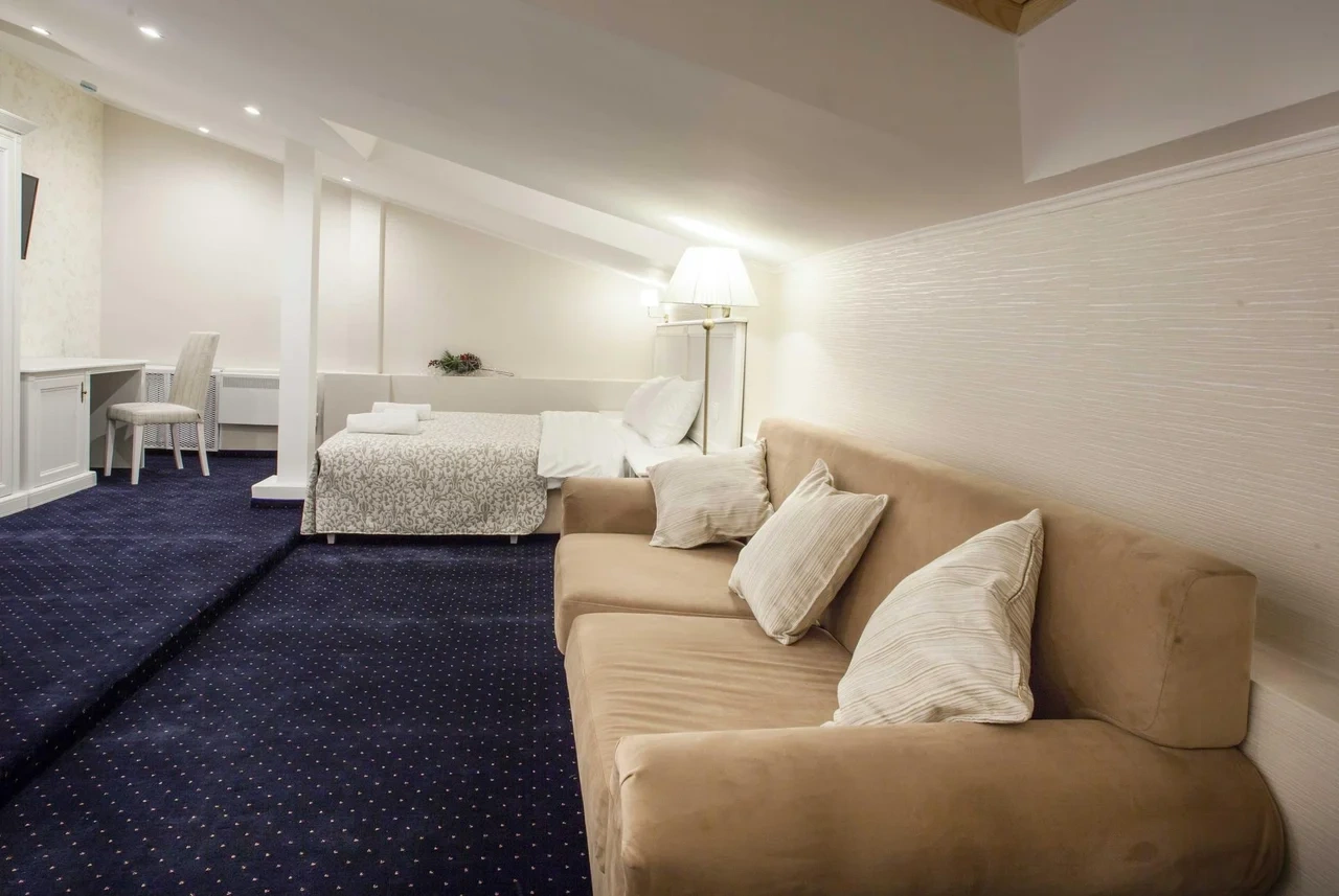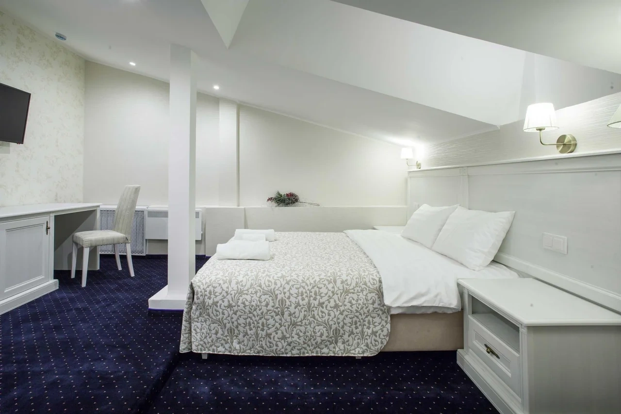 Номер категории Делюкс с большой двухспальной и односпальной кроватями, а также диванчиком , собственным балконом и площадью 27 м2 станет прекрасным решением для деловых людей, которые умеют ценить время. Элегантная и уютная гостиная идеально совмещает рабочую зону со всем необходимым и пространство для отдыха.С балкона номера гости смогут полюбоваться волшебным видом на одну из главных достопримечательностей храм Боголюбской Иконы Божией.