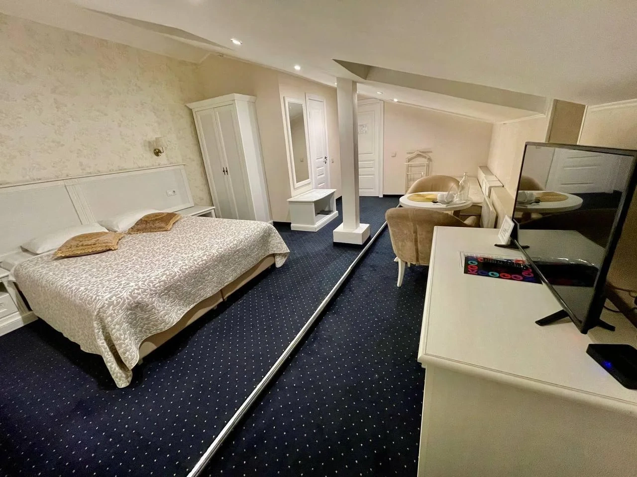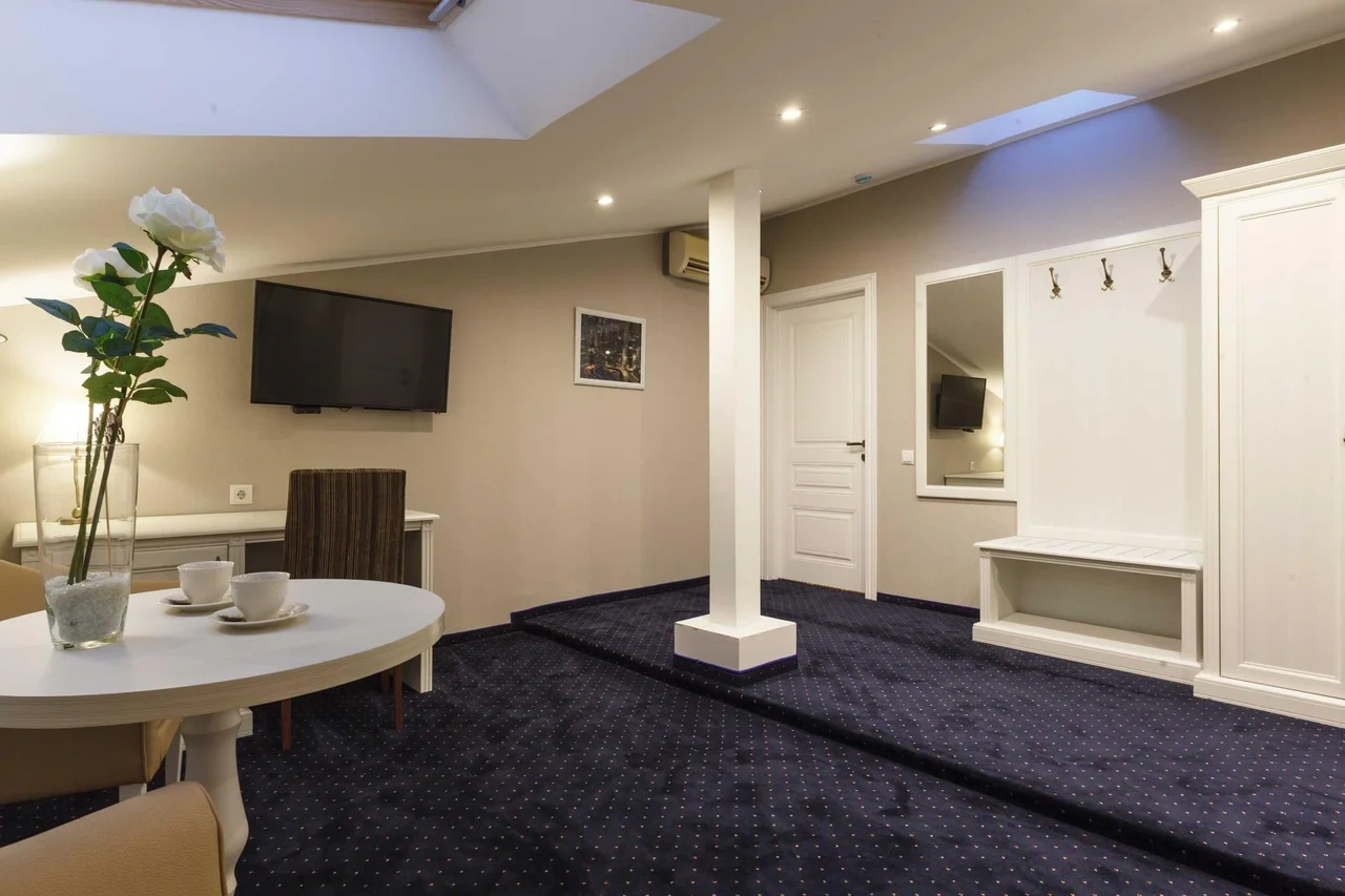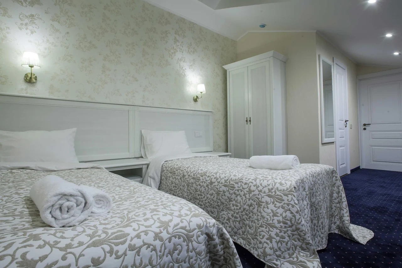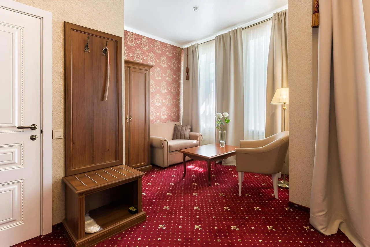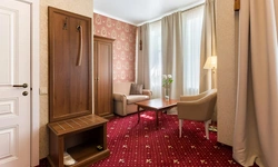 Номер категории Делюкс с большой двухспальной и односпальной кроватями, а также диванчиком , собственным балконом и площадью 27 м2 станет прекрасным решением для деловых людей, которые умеют ценить время. Элегантная и уютная гостиная идеально совмещает рабочую зону со всем необходимым и пространство для отдыха.С балкона номера гости смогут полюбоваться волшебным видом на одну из главных достопримечательностей храм Боголюбской Иконы Божией.