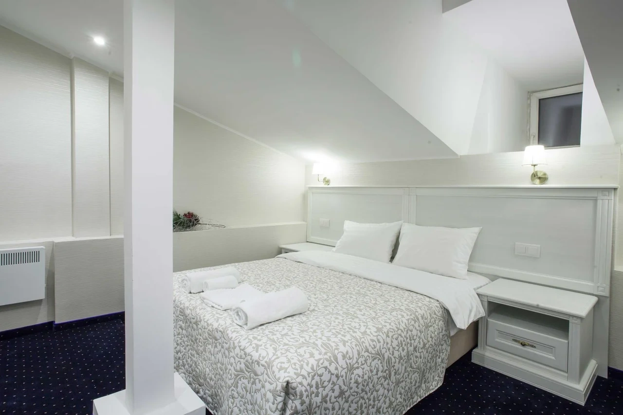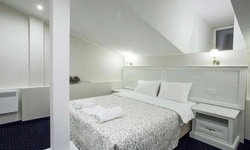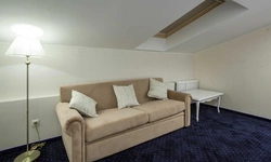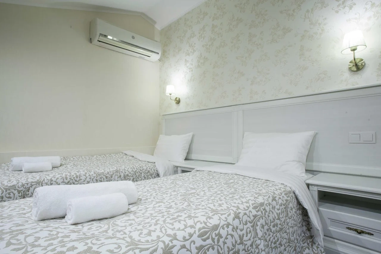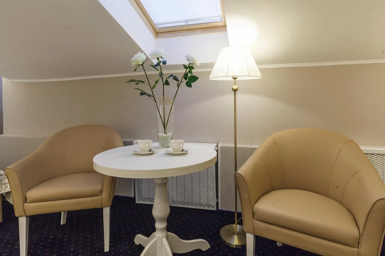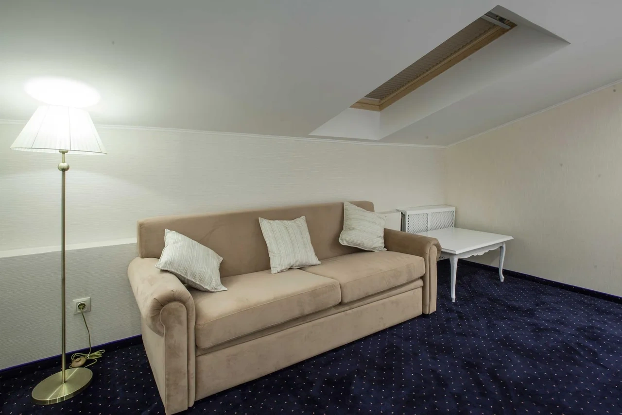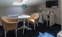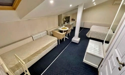 Номер категории Комфорт - стильный интерьер в молочно-бежевых тонах, удобная, мягкая мебель, большая двуспальная кровать и дополнительное спальное место в виде односпальной кровати. Мансардные окна, обеденная зона столик с красивыми и мягкими креслами. Такой вариант хорошо подойдет для пар и семей с детьми или компании друзей из трех человек. В номере имеется: * Большая и удобная кровать для двоих; * Односпальная кровать; * Столик с мягкими креслами; * Телевизор * Wi-Fi * Высокоскоростной интернет; * Душ и санузел с гигиеническими принадлежностями; * Кондиционер со сплит-системой; * Комплекты чистых полотенец; * Тапочки; * Фен; * Холодильник; * Чайник; * Зеркало; * Мансардное окно; * Шкаф