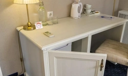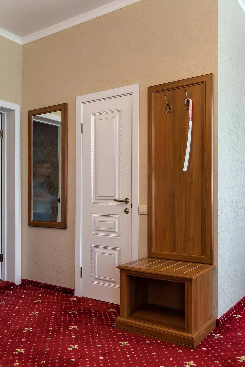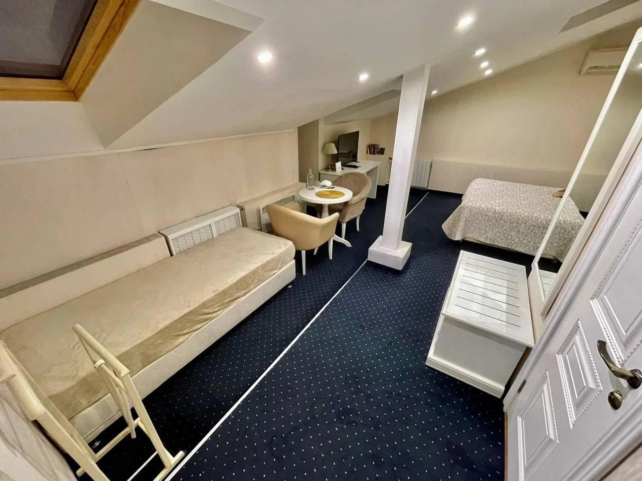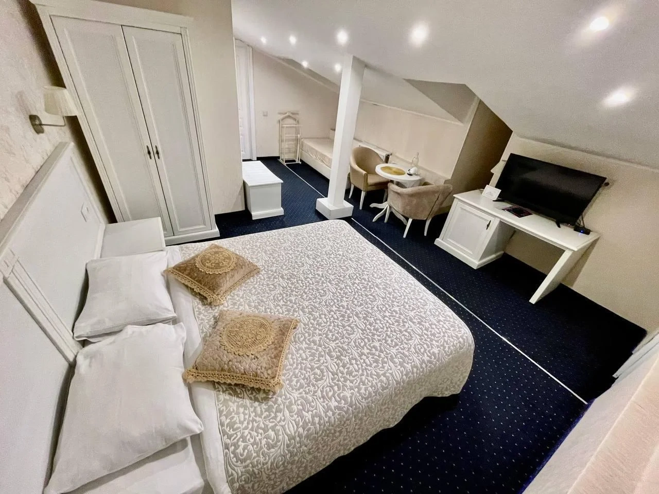 Номер категории Комфорт - стильный интерьер в молочно-бежевых тонах, удобная, мягкая мебель, большая двуспальная кровать и дополнительное спальное место в виде односпальной кровати. Мансардные окна, обеденная зона столик с красивыми и мягкими креслами. Такой вариант хорошо подойдет для пар и семей с детьми или компании друзей из трех человек. В номере имеется: * Большая и удобная кровать для двоих; * Односпальная кровать; * Столик с мягкими креслами; * Телевизор * Wi-Fi * Высокоскоростной интернет; * Душ и санузел с гигиеническими принадлежностями; * Кондиционер со сплит-системой; * Комплекты чистых полотенец; * Тапочки; * Фен; * Холодильник; * Чайник; * Зеркало; * Мансардное окно; * Шкаф
