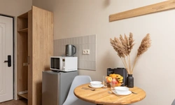 Двухместный номер-студия с двумя односпальными кроватями. В номере есть микроволновая печь, холодильник, электрочайник и чайный набор. Каждый номер оснащен индивидуальной ванной комнатой с душем. туалетом, раковиной, феном, тапочками и косметическими принадлежностями. Каждый номер оснащен электронным замком, доступ в номер осуществляется с использованием индивидуального кода.