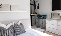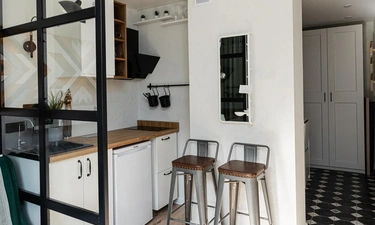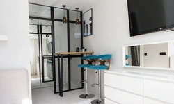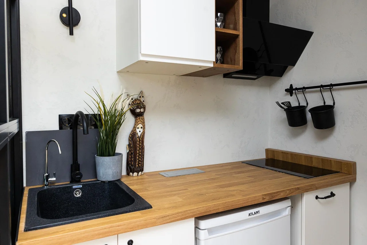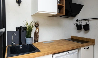 * МИНИ-КУХНЯ, оборудованная холодильником, варочной панелью, вытяжкой, СВЧ-печью, эл. чайником, кофеваркой, фильтром для воды, а также посудой и столовыми приборами