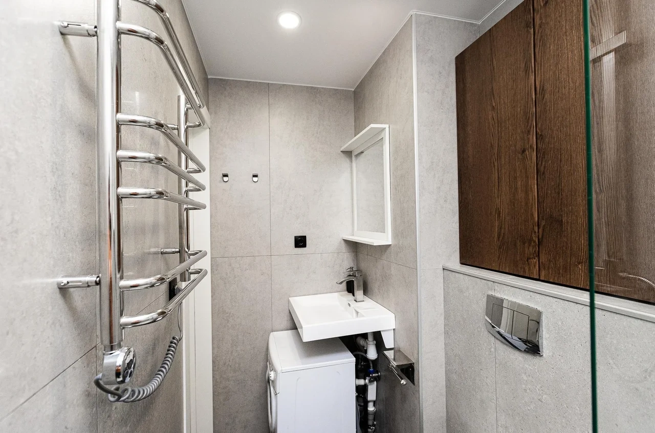 * Санузел с современным душем, электрическим полотенцесушителем и СТИРАЛЬНОЙ МАШИНОЙ