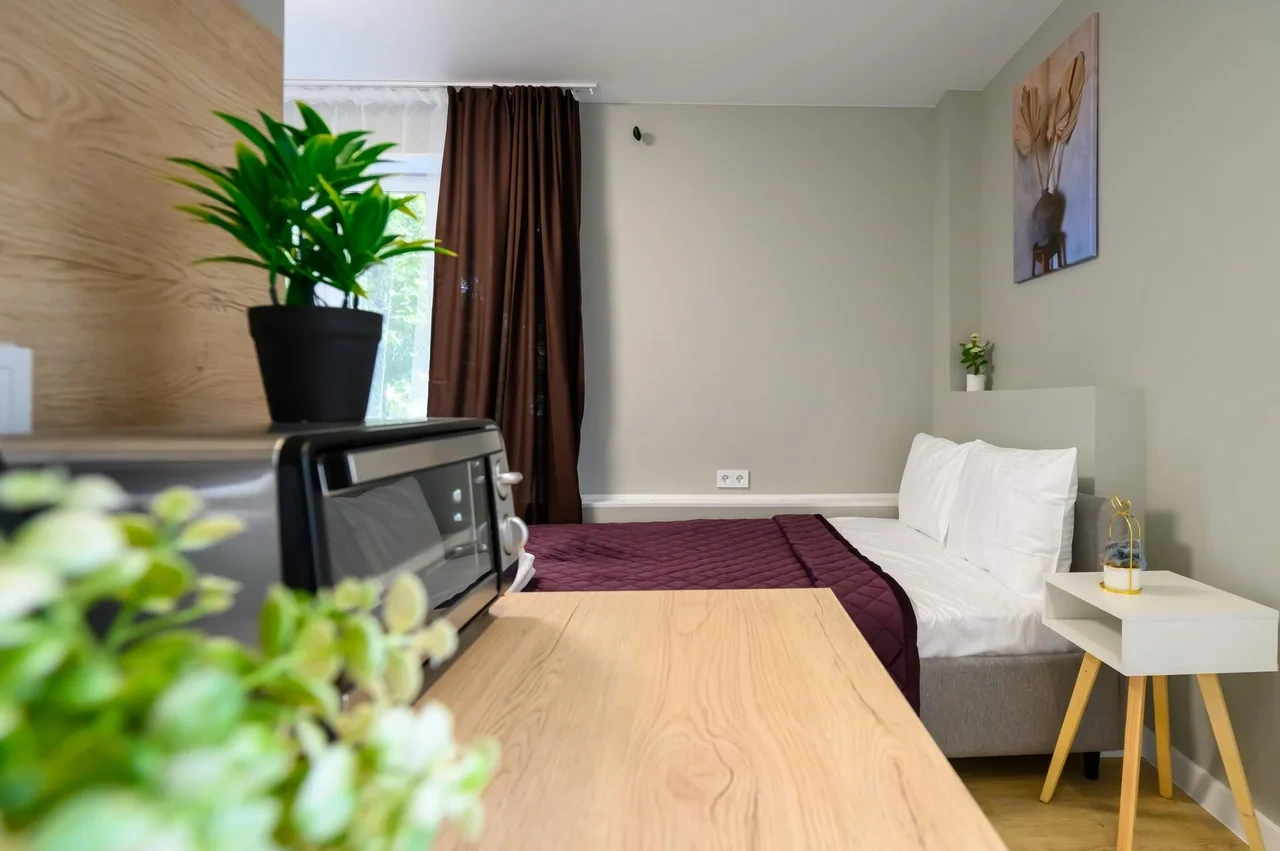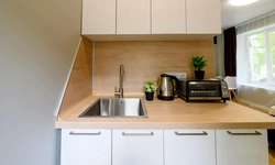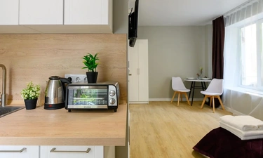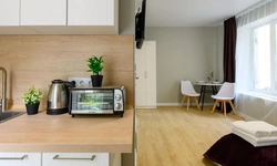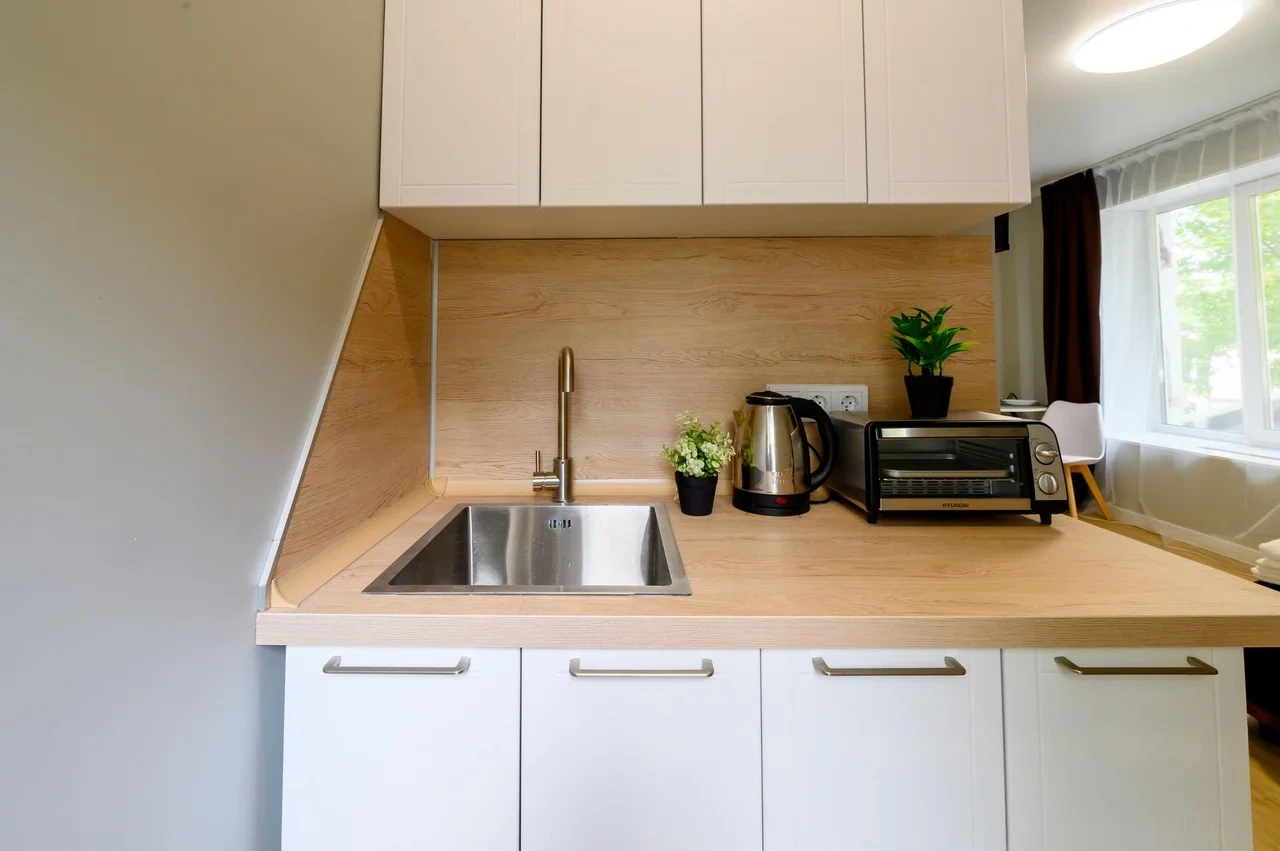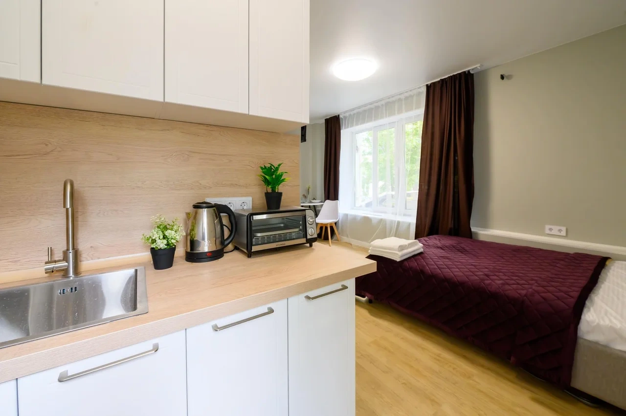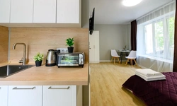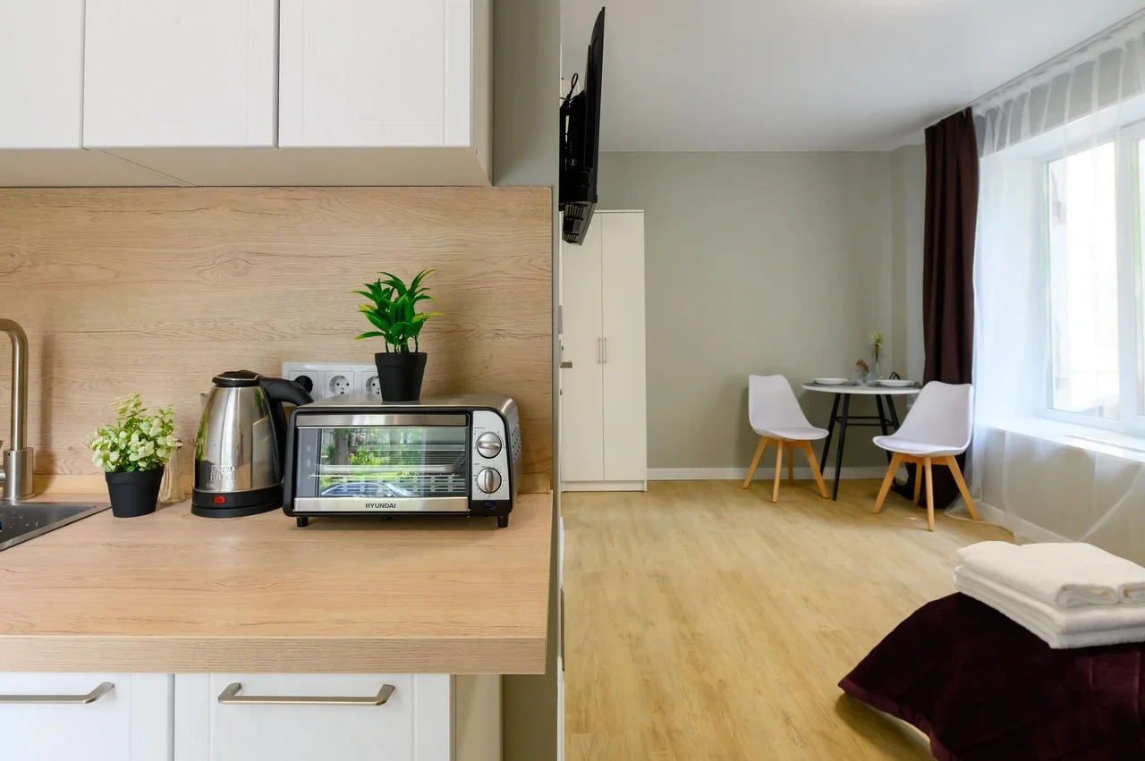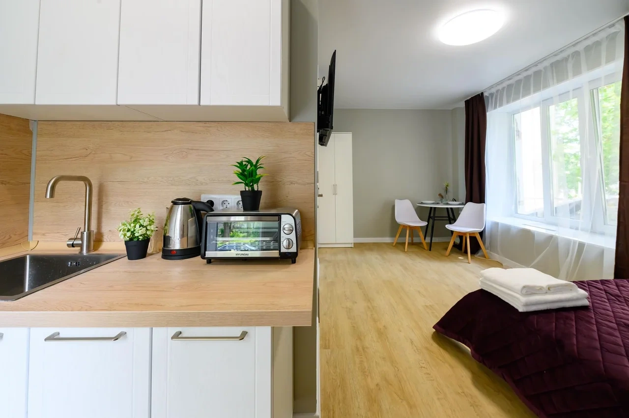 - Кухня с холодильником, плитой, микроволновкой, чайником и посудой