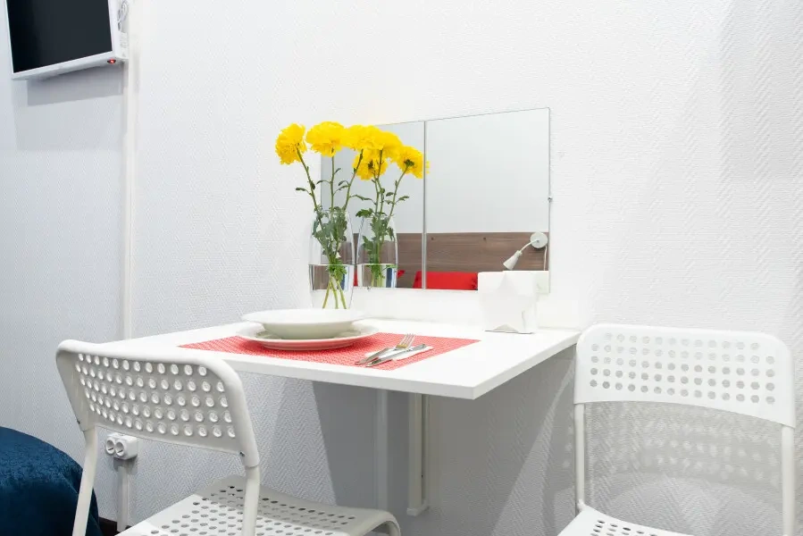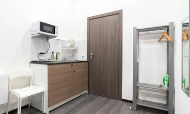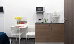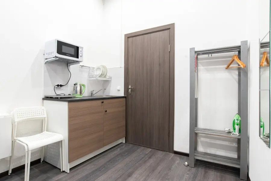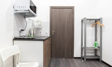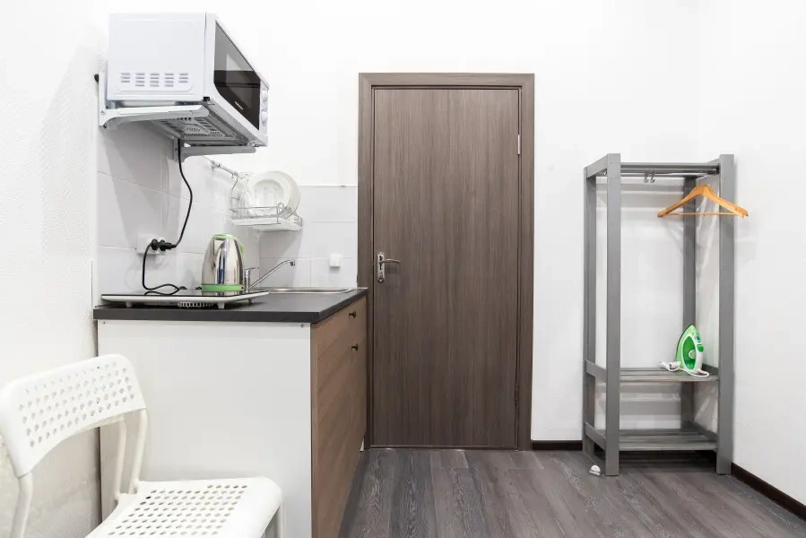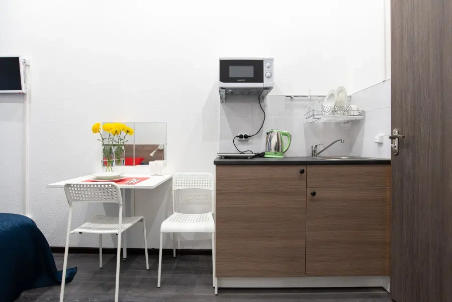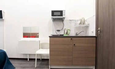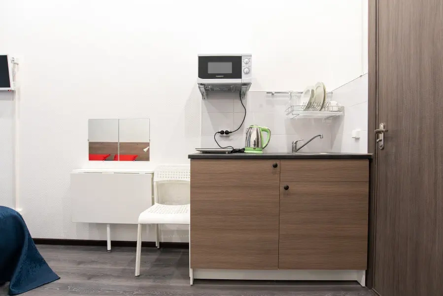 - Кухня с холодильником, плитой, микроволновкой, чайником и посудой