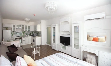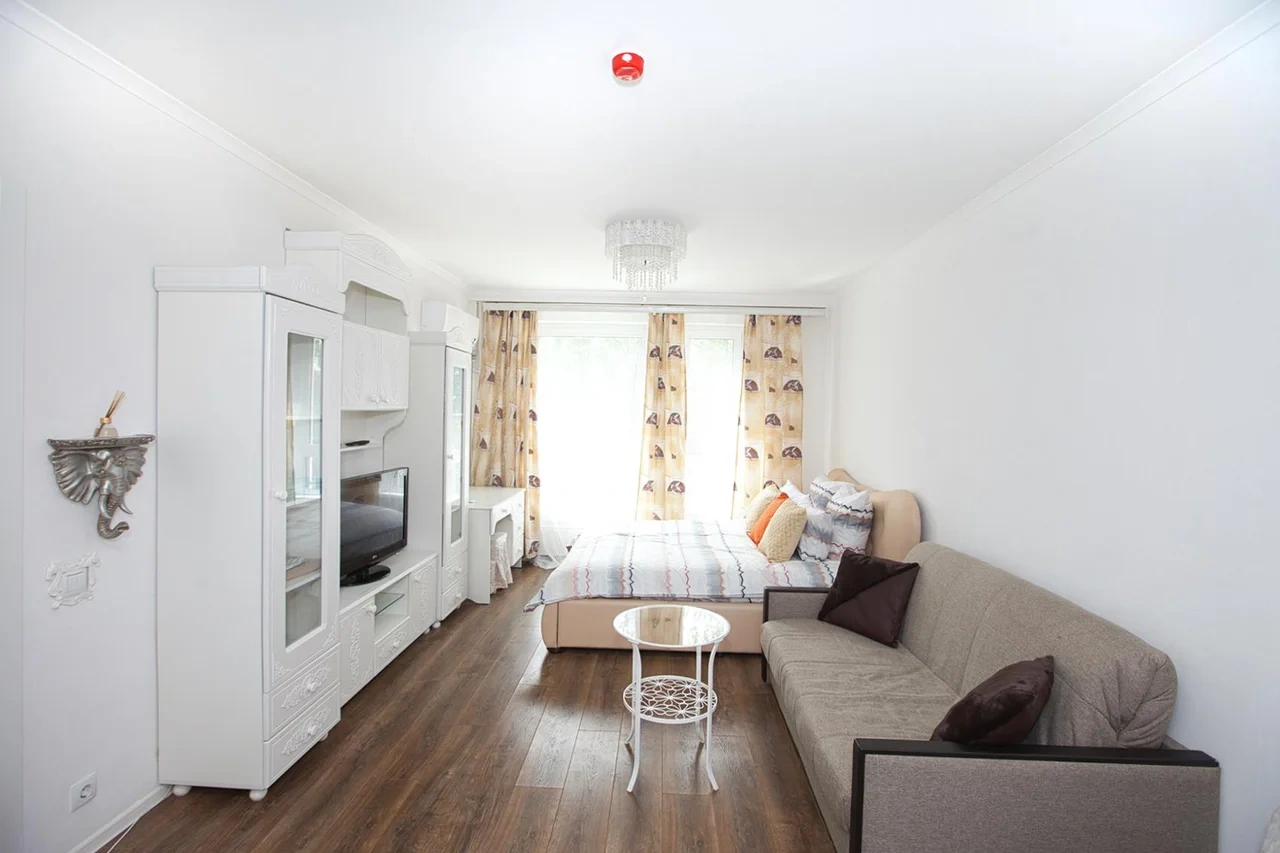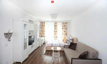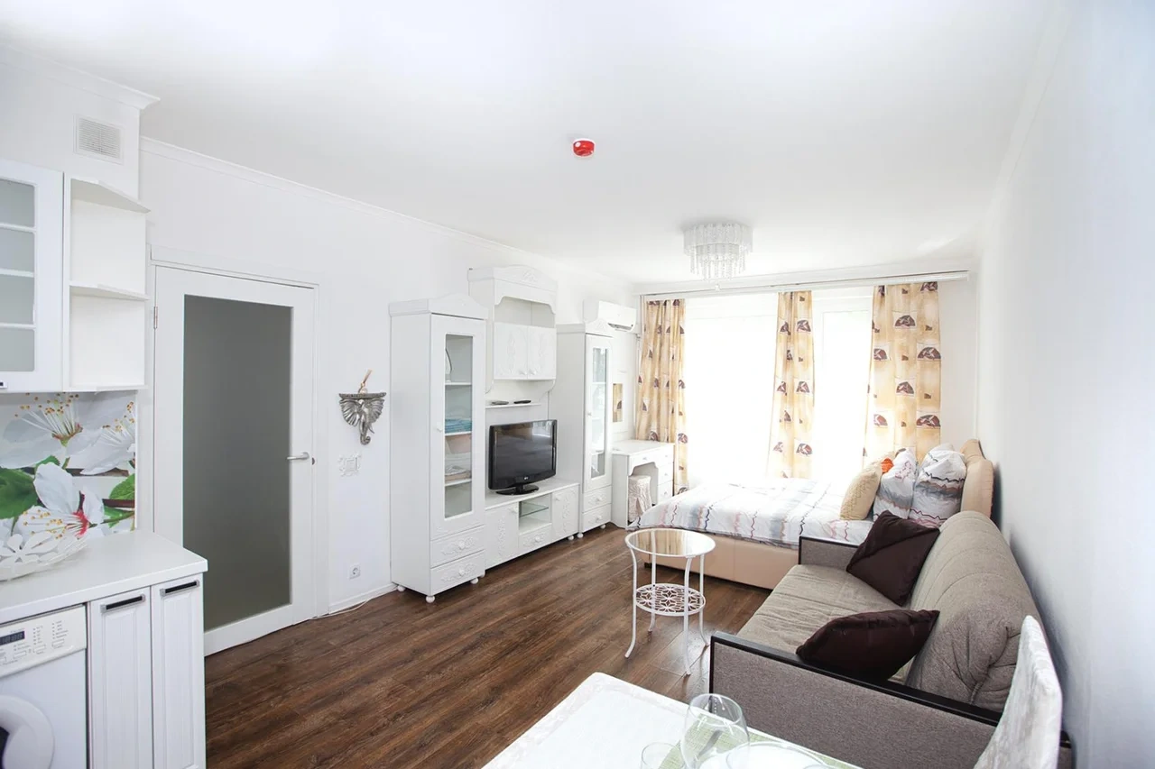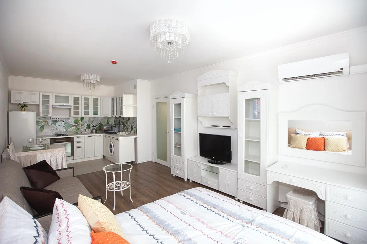 Студия идеально подходит для проживания от 1 до 4х человек. В комнате размещена двуспальная кровать 160*200 с ортопедическим матрасом и удобный раскладывающийся диван.