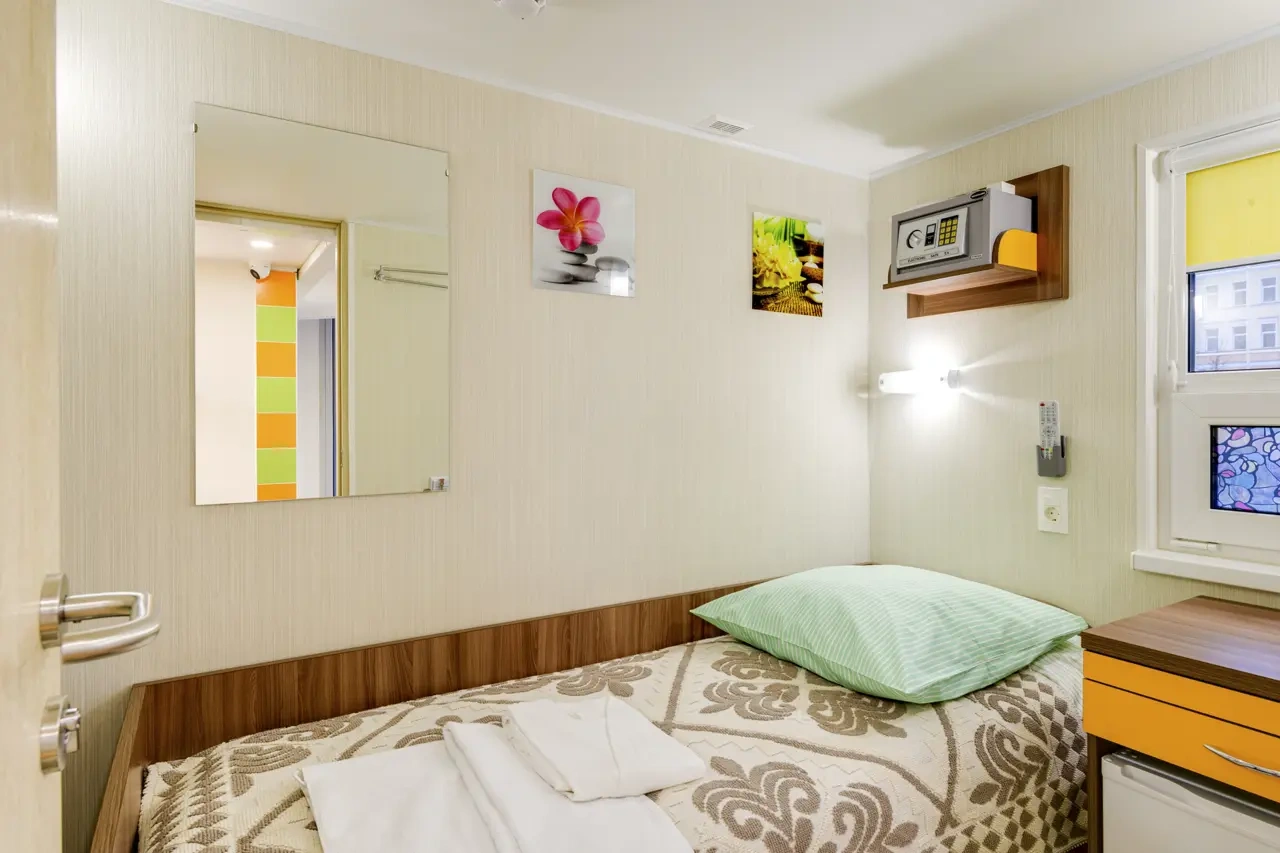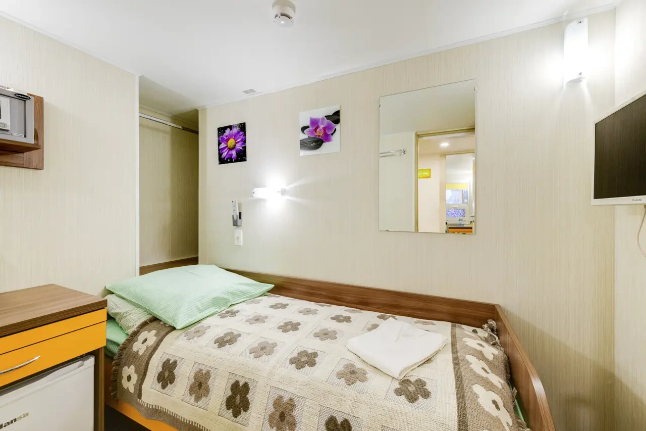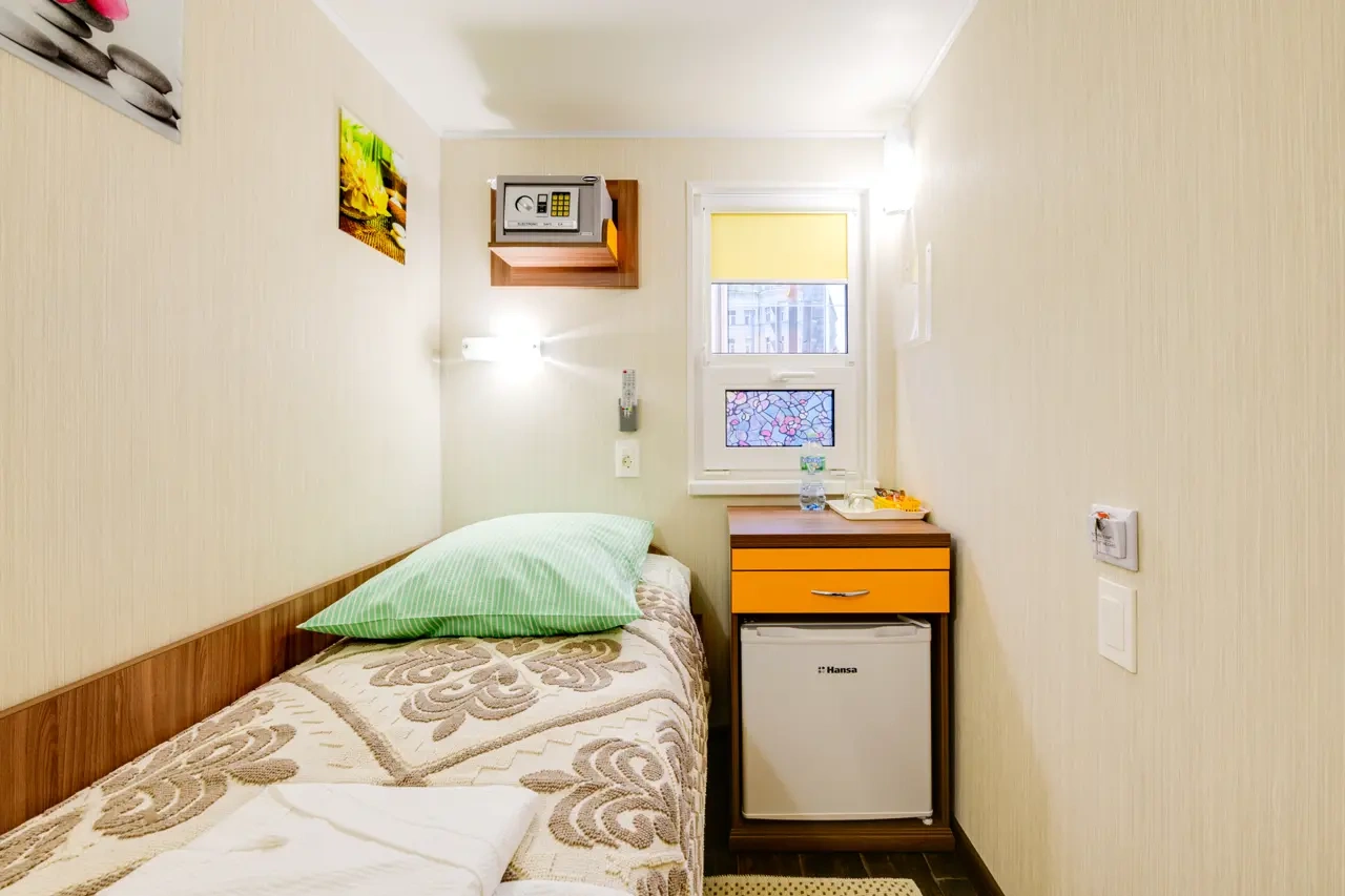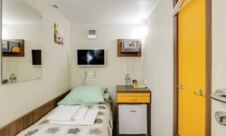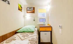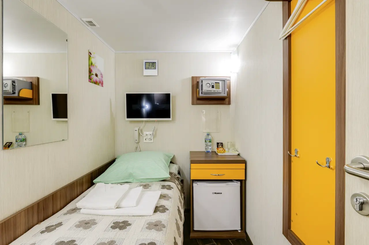 Одноместный однокомнатный номер-капсула, оформленный в современном стиле. В номере: 1 кровать 800*2000, телевизор, холодильник, сейф, телефон, приветственный набор (чай, кофе, печенье, бутилированная вода). Для всех клиентов халаты и тапочки бесплатно.