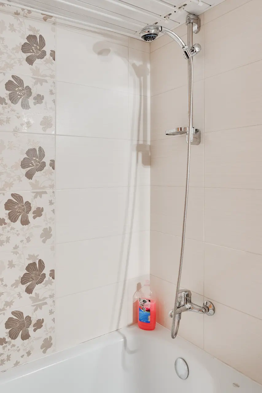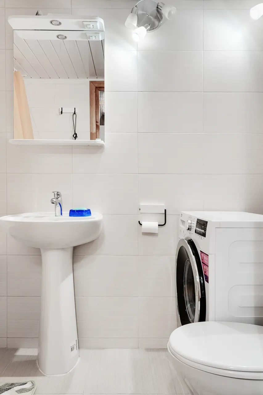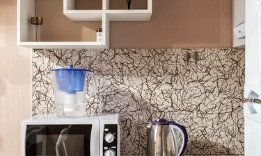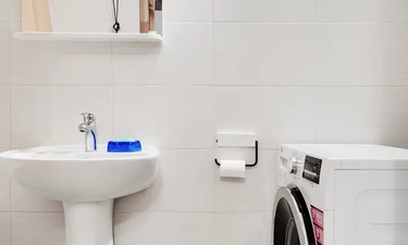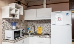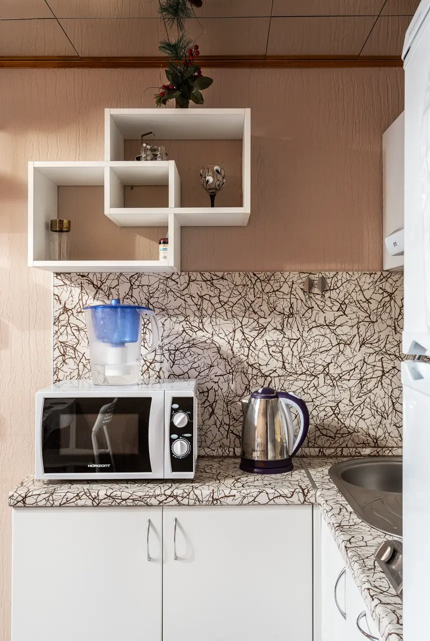 Оснащена всеми необходимыми кухонными приборами, также есть фен, утюг, стиральная машина, плита, сушилка, гладильная доска.