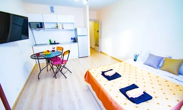 Уютная студия с качественным свежим ремонтом на 15 этаже. По вечерам можно наблюдать красивейший закат закат, идеально для романтического вечера с дамой.