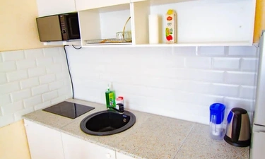 -Кухонная зона с варочной панелью, холодильником, СВЧ-печью, электрочайником и всей необходимой посудой и кухонными приборами;