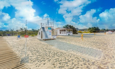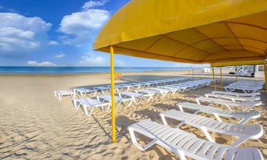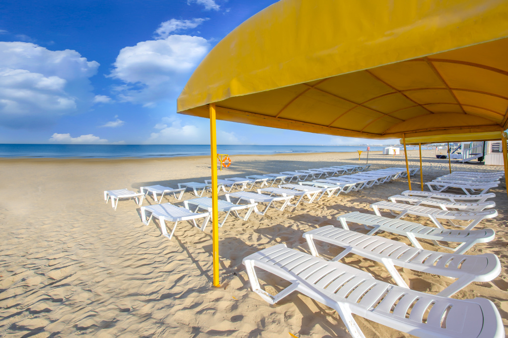 Не выходя за территорию отеля, Вы попадаете на собственный оборудованный песчаный пляж отеля с теневыми навесами и шезлонгами. Пологий вход в море обеспечивает безопасное пребывание маленьких гостей на пляже.