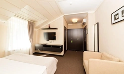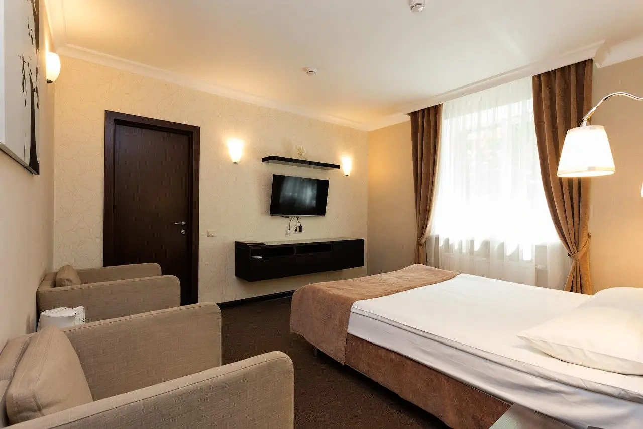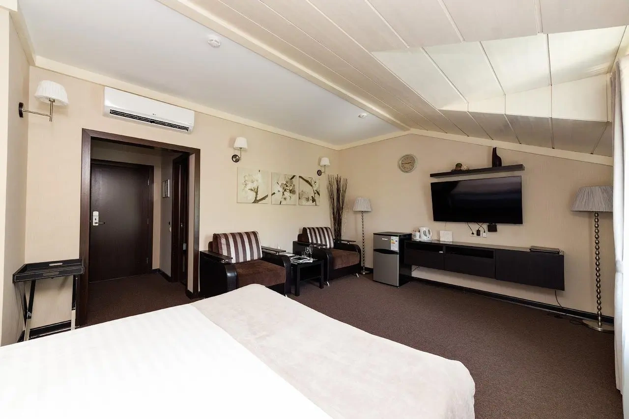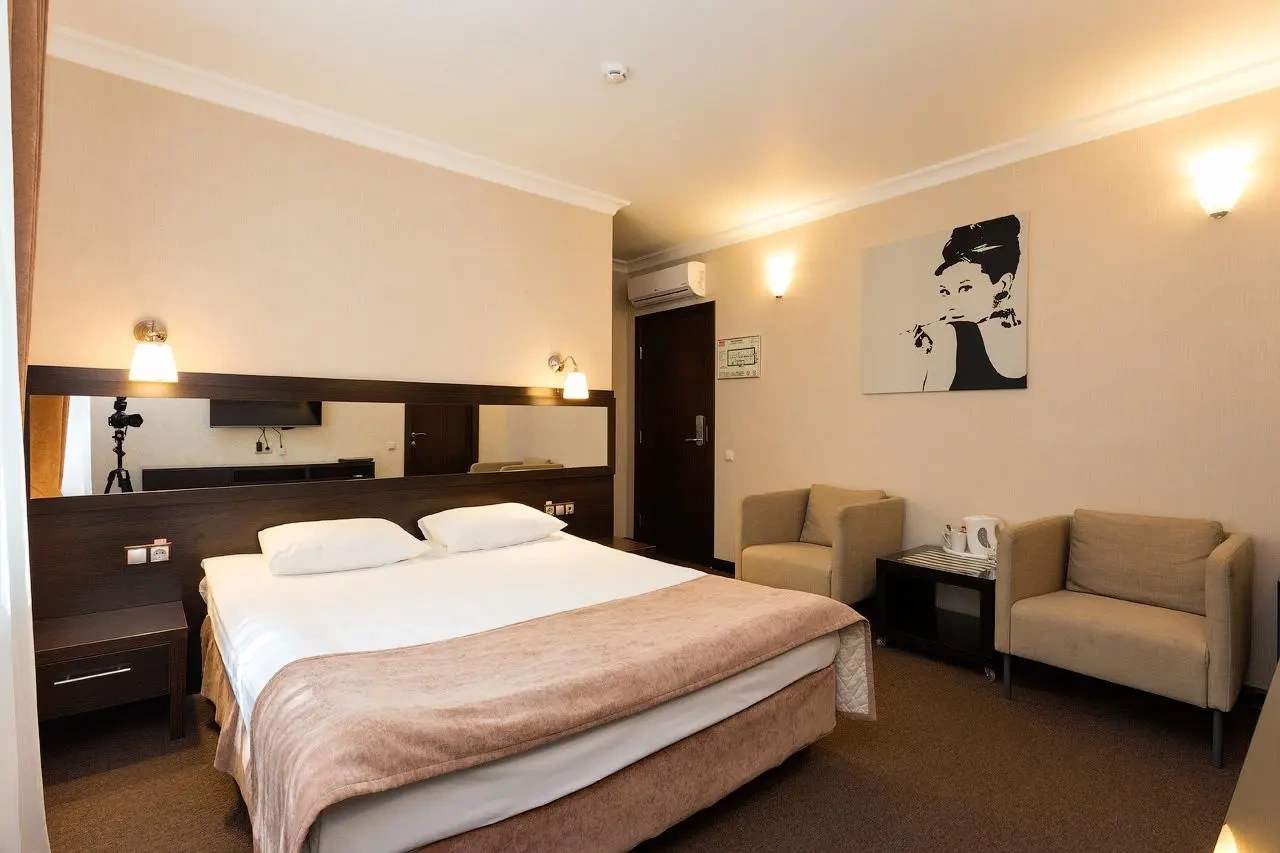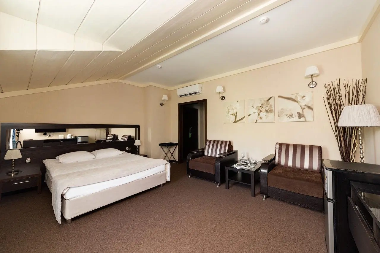 В номере: большая кровать, диван, увеличенная площадь номера, кондиционер, бесплатный WI-FI, телефон, чайник, набор для чаепития (чай, кофе, сахар), кабельное ТВ (HDTV), санузел, оригинальная душевая кабина из стекла, выложенная мозаикой, махровые халаты, одноразовые тапочки. На этаже кулер с холодной водой. Бесплатная парковка на территории отеля.