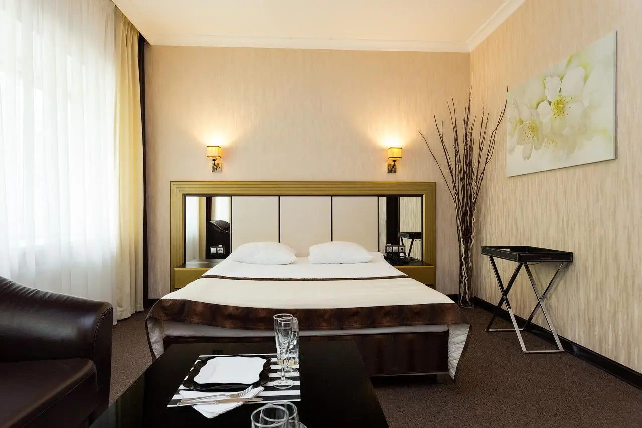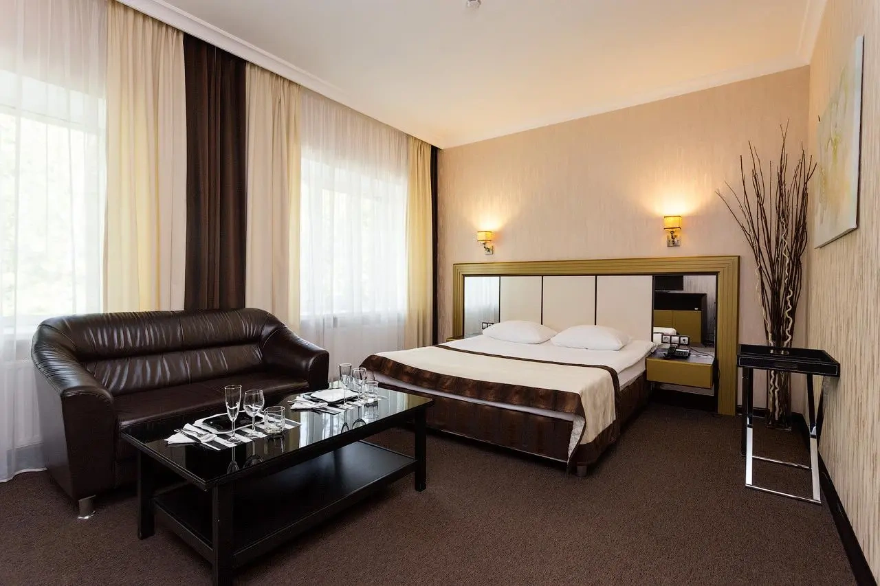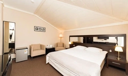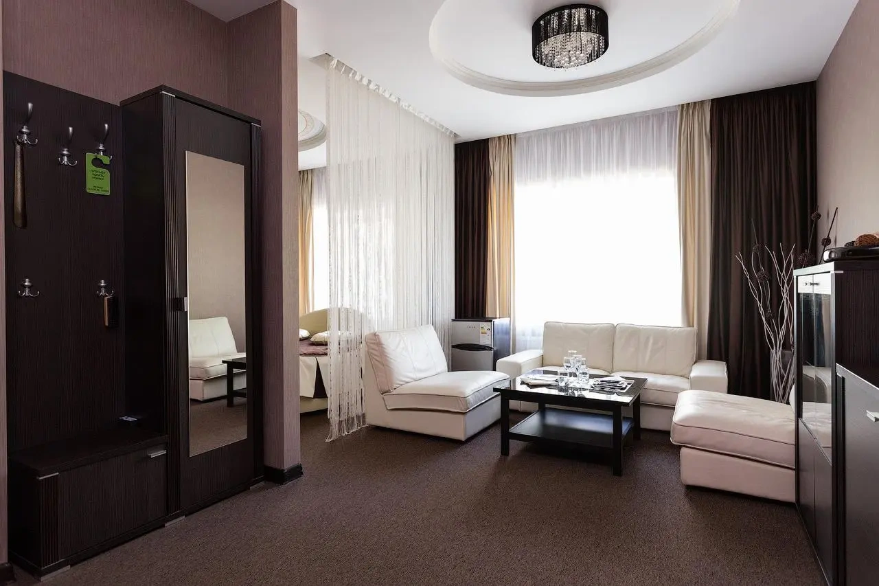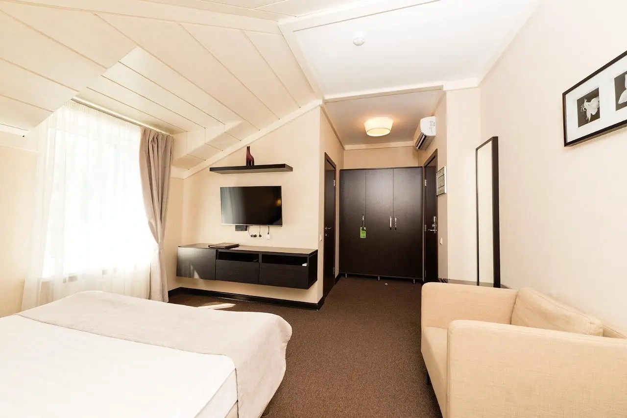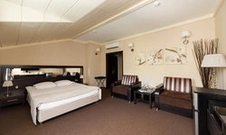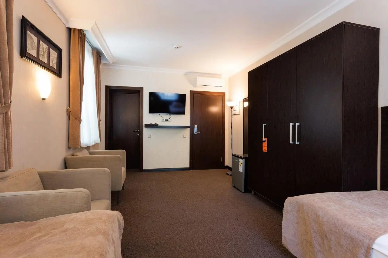 В номере: большая кровать, диван, увеличенная площадь номера, кондиционер, бесплатный WI-FI, телефон, чайник, набор для чаепития (чай, кофе, сахар), кабельное ТВ (HDTV), санузел, оригинальная душевая кабина из стекла, выложенная мозаикой, махровые халаты, одноразовые тапочки. На этаже кулер с холодной водой. Бесплатная парковка на территории отеля.