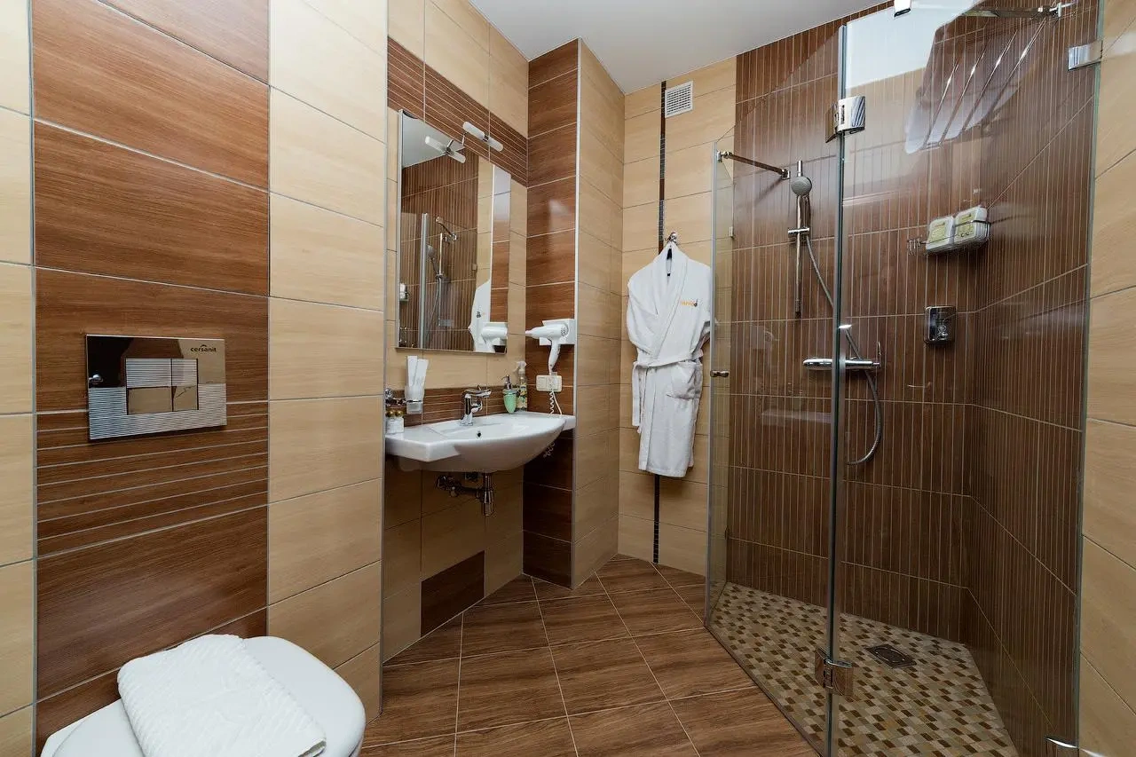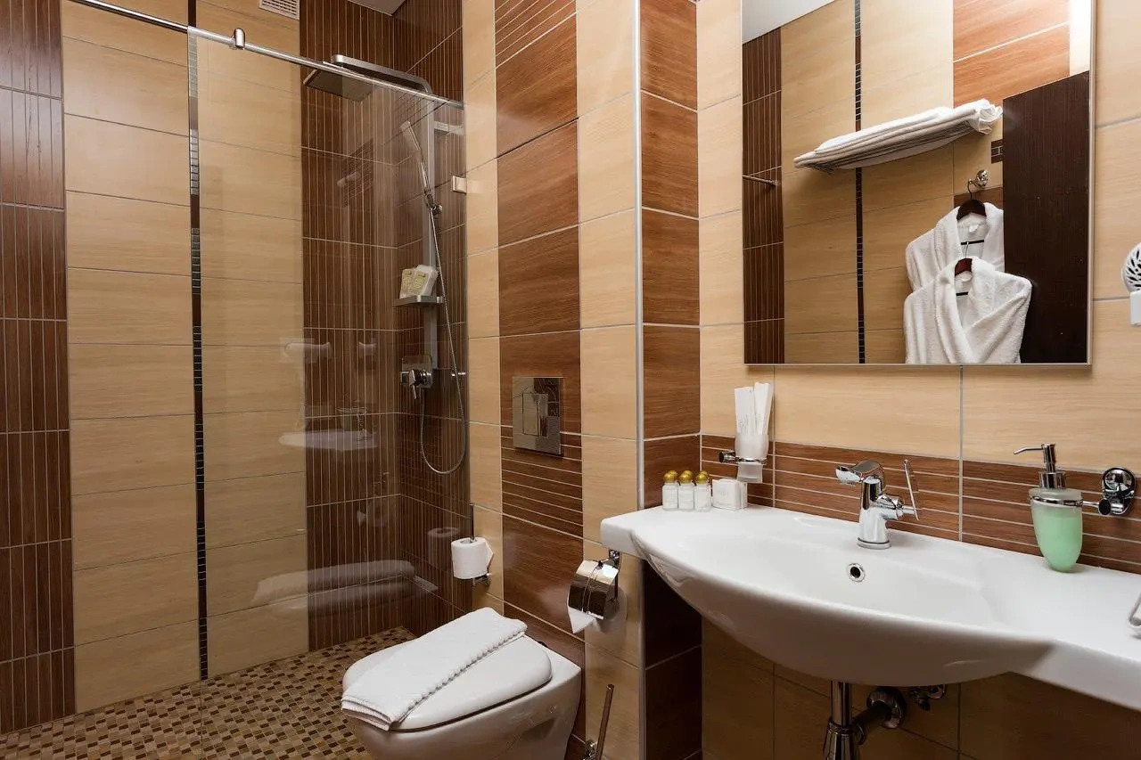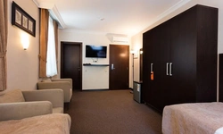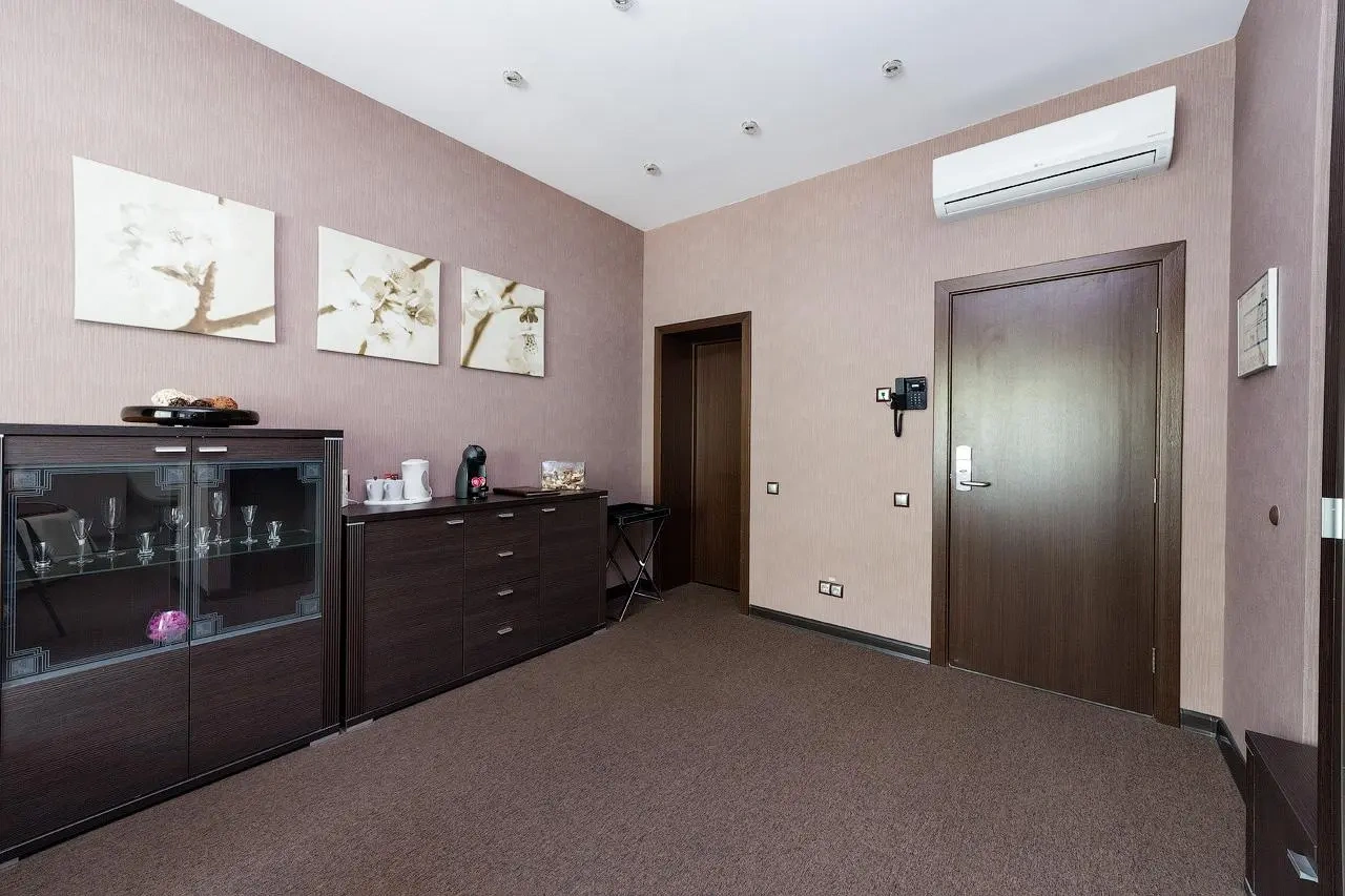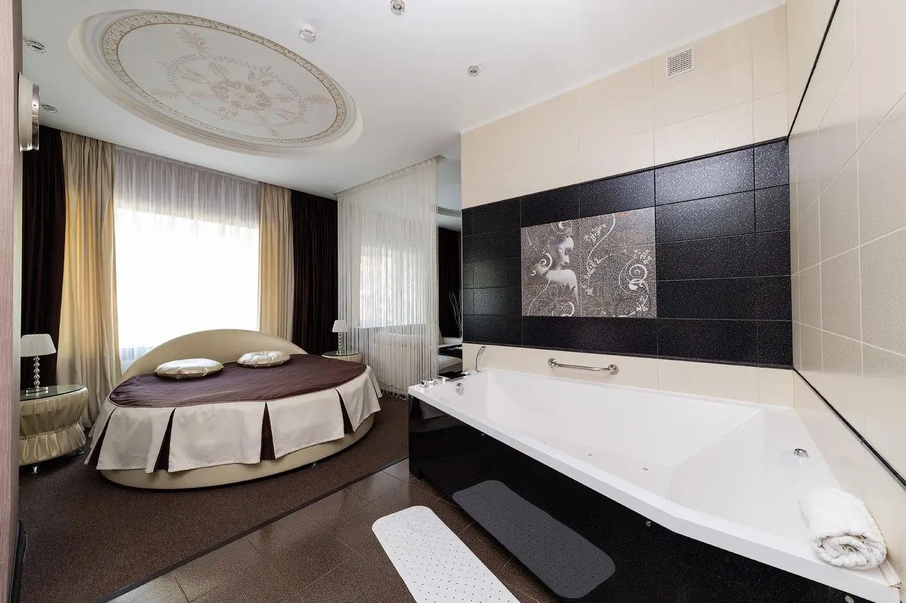 В номере: большая кровать, диван, увеличенная площадь номера, кондиционер, бесплатный WI-FI, телефон, чайник, набор для чаепития (чай, кофе, сахар), кабельное ТВ (HDTV), санузел, оригинальная душевая кабина из стекла, выложенная мозаикой, махровые халаты, одноразовые тапочки. На этаже кулер с холодной водой. Бесплатная парковка на территории отеля.