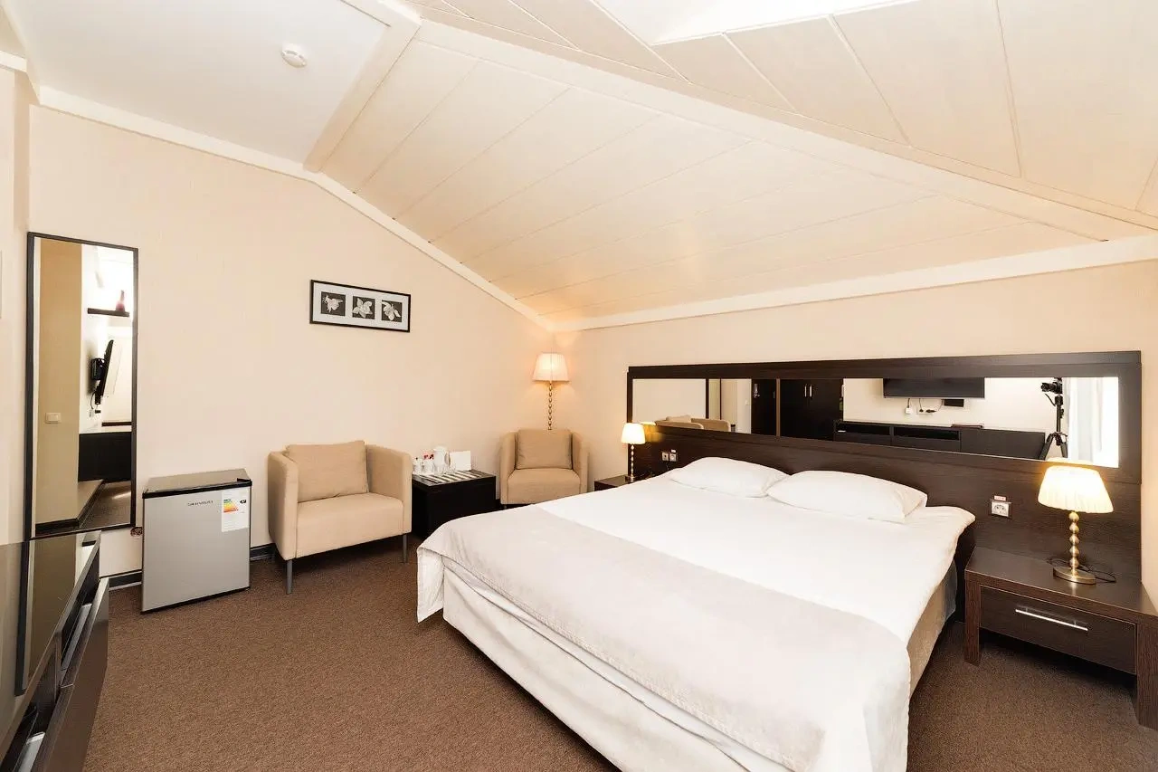 В номере: Оригинальный дизайн городской мансарды, большая кровать, кондиционер, бесплатный WI-FI, телефон, чайник, набор для чаепития (чай, кофе, сахар), одноразовые тапочки, кабельное ТВ (HDTV), санузел, оригинальная душевая кабина из стекла, выложенная мозаикой. На этаже кулер с холодной водой. Парковка на территории отеля при наличии свободных мест за доп. плату
