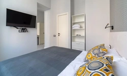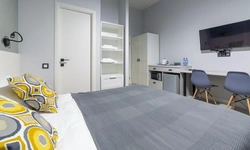 Современный интерьер. Кондиционер. Холодильник, микроволновка, чайник. Много место для хранения
