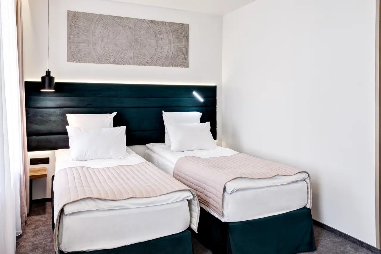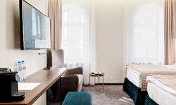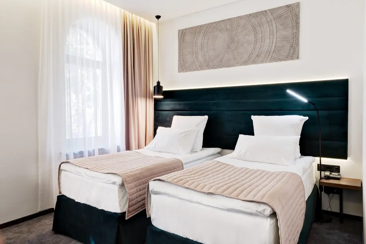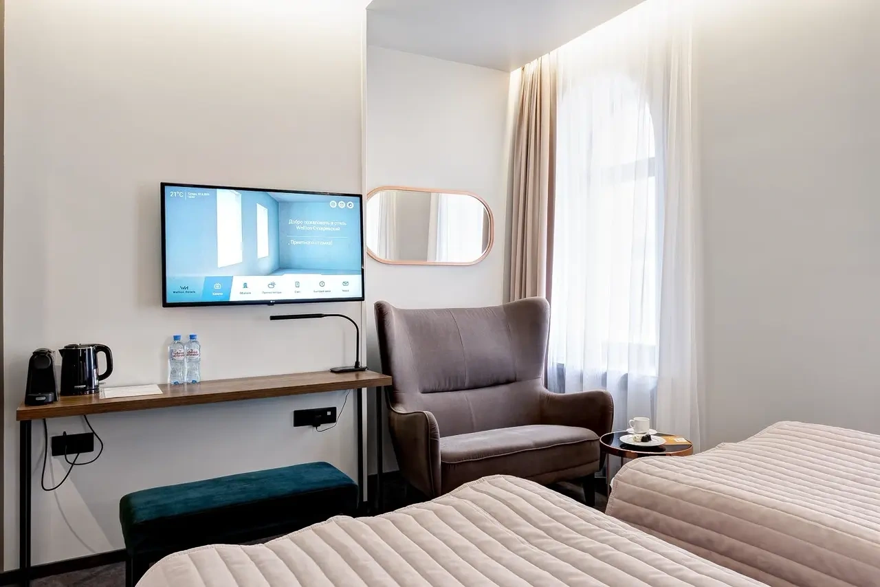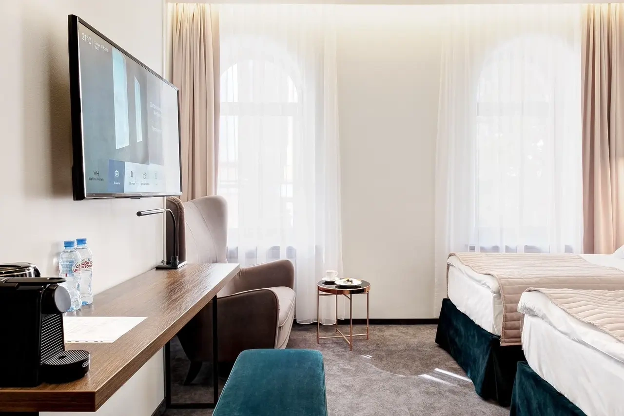 Комфортный номер категории «Супериор» с двумя отдельно стоящими кроватями — отличный вариант для размещения двух человек, прибывших с деловой поездкой или друзей, путешествующих вдвоем. В таком номере все располагает к комфортному отдыху: продуманный интерьер создает уют, две раздельные кровати с современным матрасом свежим постельным бельем обещают крепкий сон. Если в поездке вам нужно поработать — в вашем распоряжении удобный рабочий стол и высокоскоростной беспроводной интернет. Для вашего удобства в номере "Супериор" есть телевизор с широким выбором каналов, чтобы вы могли насладиться своими любимыми программами или фильмами. Также есть мини холодильник, кофемашина, гладильные принадлежности, чайная станция, индивидуальный сейф для ценных вещей и документов. В собственной ванной комнате с душем вы найдете все необходимые туалетно-косметические принадлежности, включая полотенца, халаты, шампунь, гель для душа, мыло и фен. Номера категории "Супериор" предлагают пространство, где вы сможете отдохнуть и расслабиться после долгого дня. Они идеально подходят для комфортного отдыха во время туристической или деловой поездки в столицу.